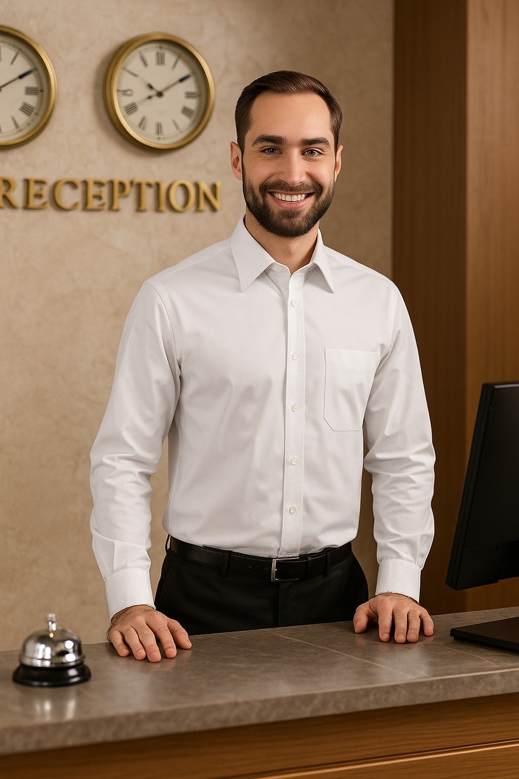 Мъжка риза Стил – бяла е предназначена за мъже, които търсят официално работно облекло с изчистена визия. Изработена от 100% памук – поплин, ризата е лека, дишаща и осигурява комфорт дори при динамична работа. Подходяща е за персонал в ресторанти, хотели, както и за сервитьори, бармани и администратори.