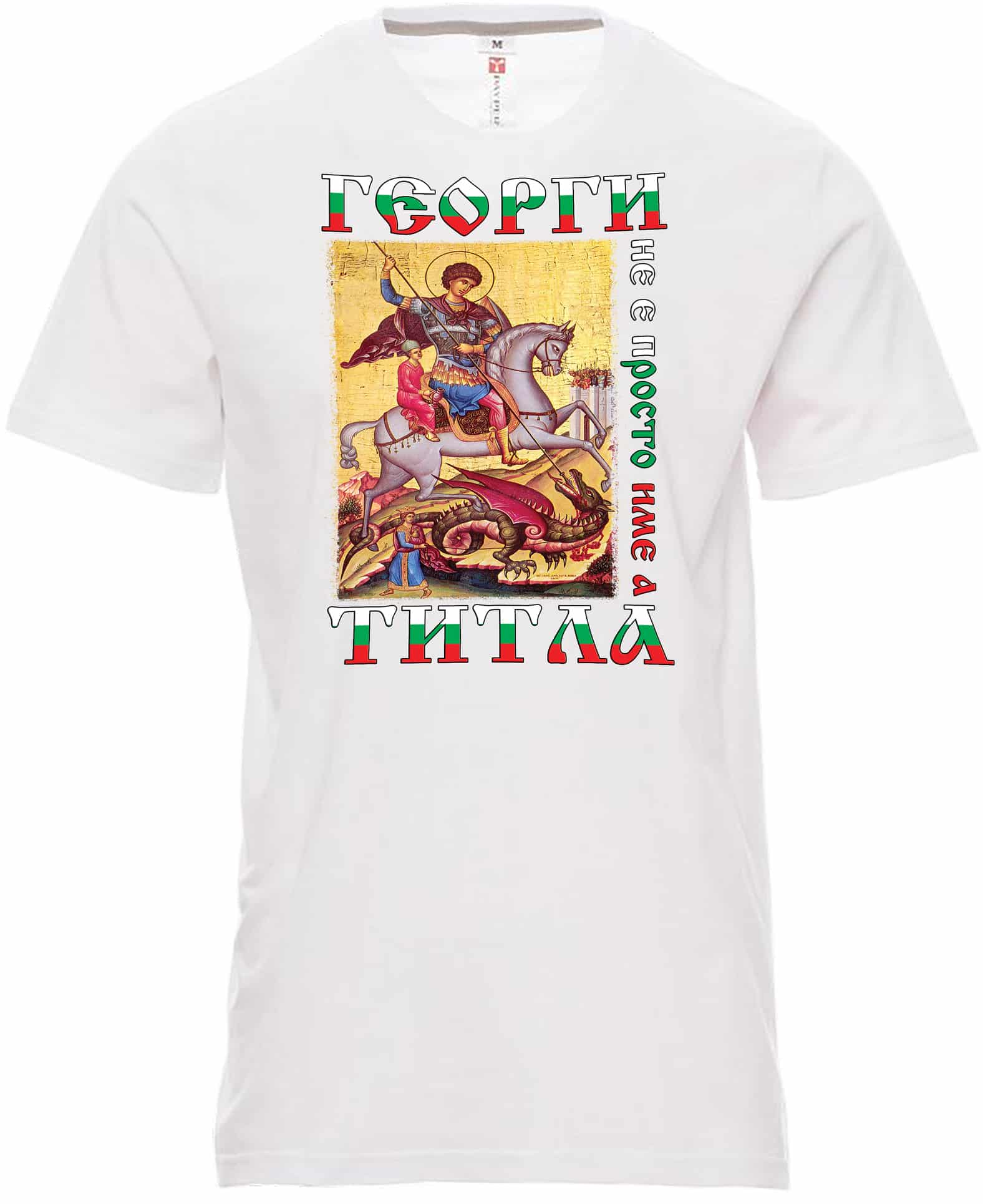 Бяла мъжка тениска с дигитален печат Георги. Материята на тениската е 100% памучна и мека. Този модел е отличен избор за подарък за Гергьовден, а също и без специален повод. Предлагаме тениска Георги и в друг цвят по избор. Можете да изберете от предложенията ни за цветни мъжки тениски. Можем да изработим печат за Гергьовден и върху бяла детска тениска, като можете да избирате от пет размера на детските тениски. При нас имате възможност да поръчате и други модели на тениски с печат за именици.