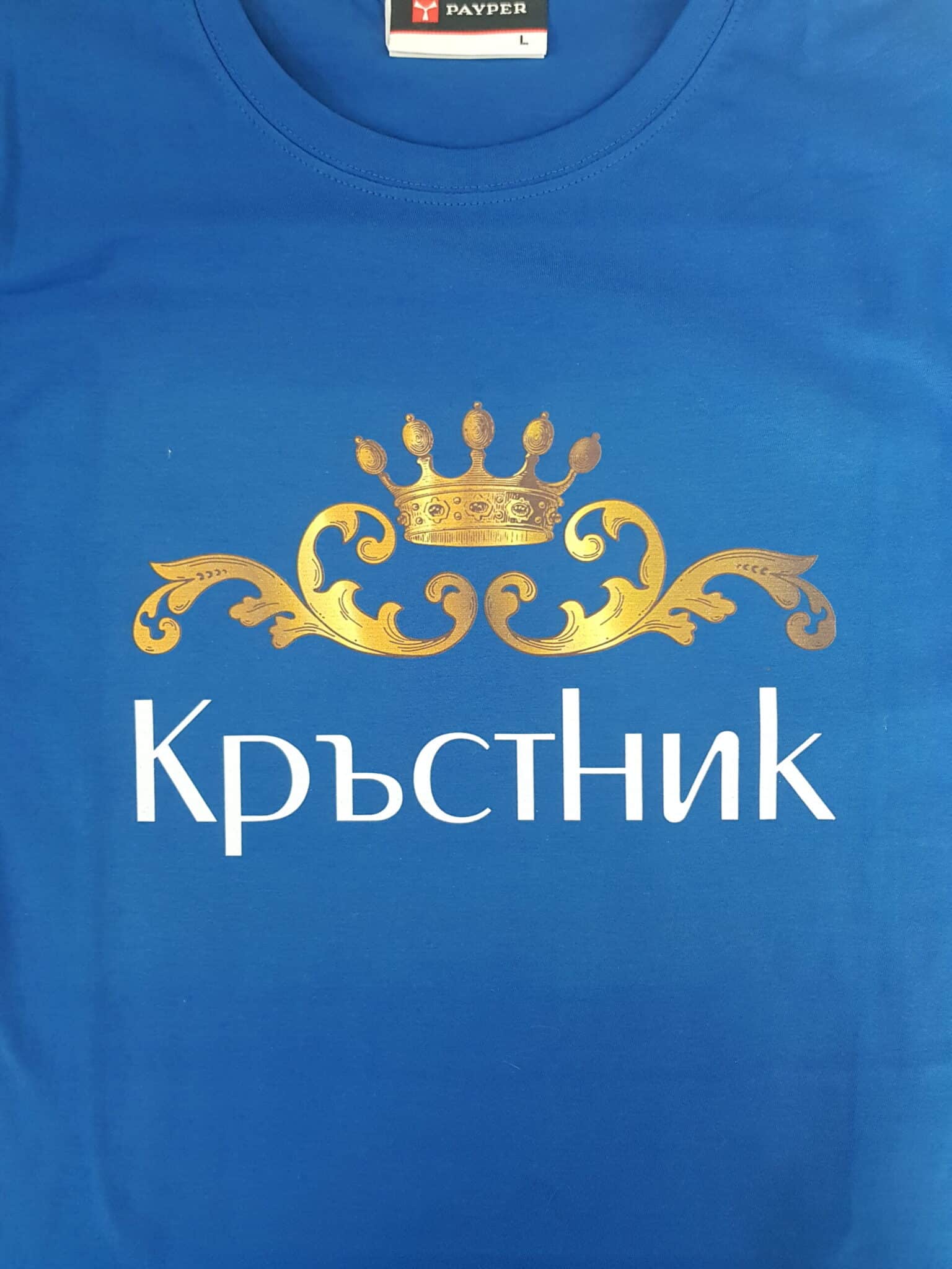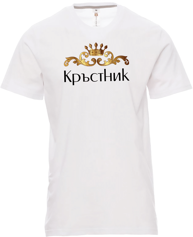 Мъжка бяла памучна тениска с дигитален печат Кръстник в черно и златисто. Материята на тениската е много мека и приятна на допир. При нас можете да поръчате и дамска тениска за Кръстница. По желание на клиента можем да изработим цветна тениска с печат Кръстник, или Кръстница. Разгледайте предложенията ни за дамски и мъжки тениски, от които може да изберете цвят по ваш вкус. По ваше желание можем да добавим печат с името на кръстника срещу доплащане от € 2,86 / 5,60 лв.