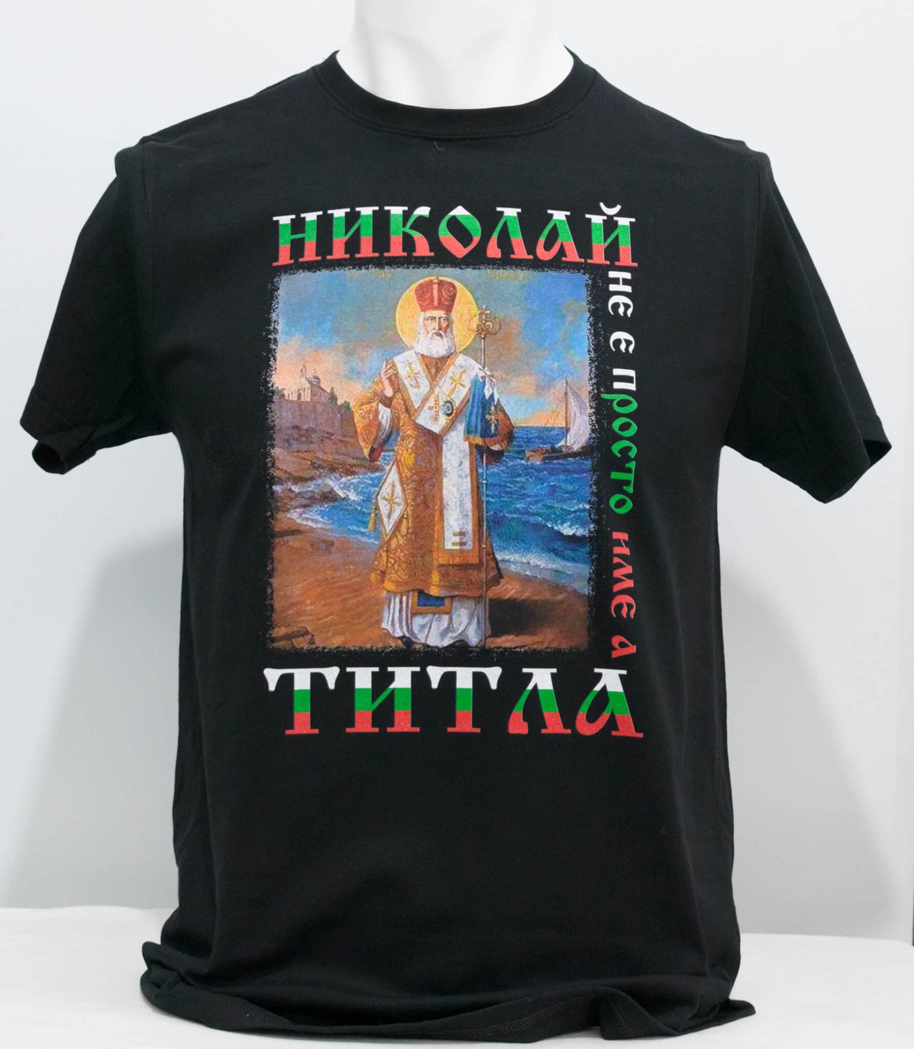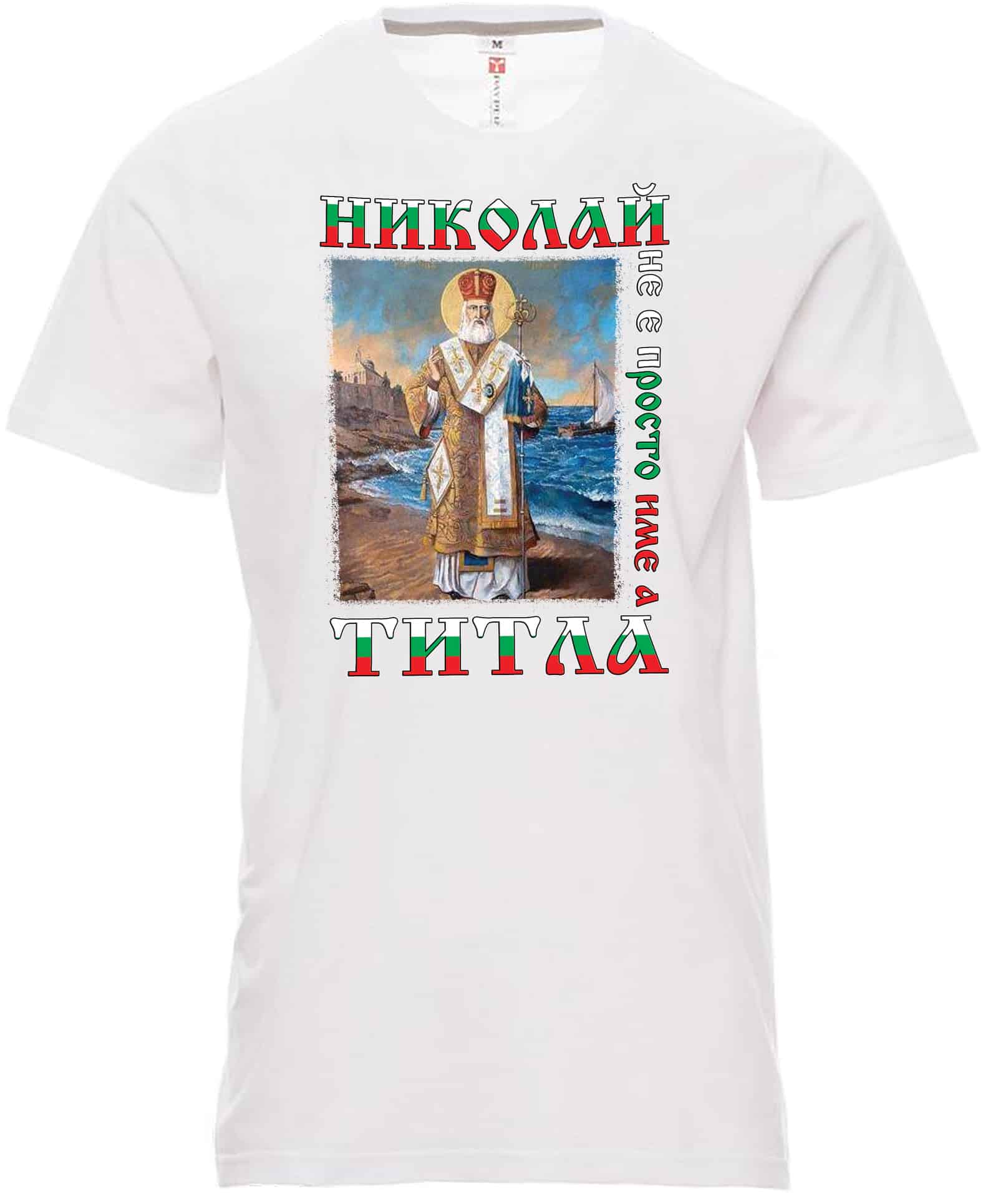 Мъжка бяла тениска с къс ръкав с дигитален печат Николай. 100% памучна е и много мека. Този модел е чудесен за подарък за Никулден, или без специален повод. При нас можете да поръчате и цветна мъжка тениска Николай. Можете да разгледате предложенията ни за цветни мъжки тениски. Преди поръчка на цветна тениска с печат, е добре да ни потърсите за справка относно наличните размери. Печат за Никулден можем да изработим също така върху детска тениска. Предлагаме и други модели на тениски с печат за именици.