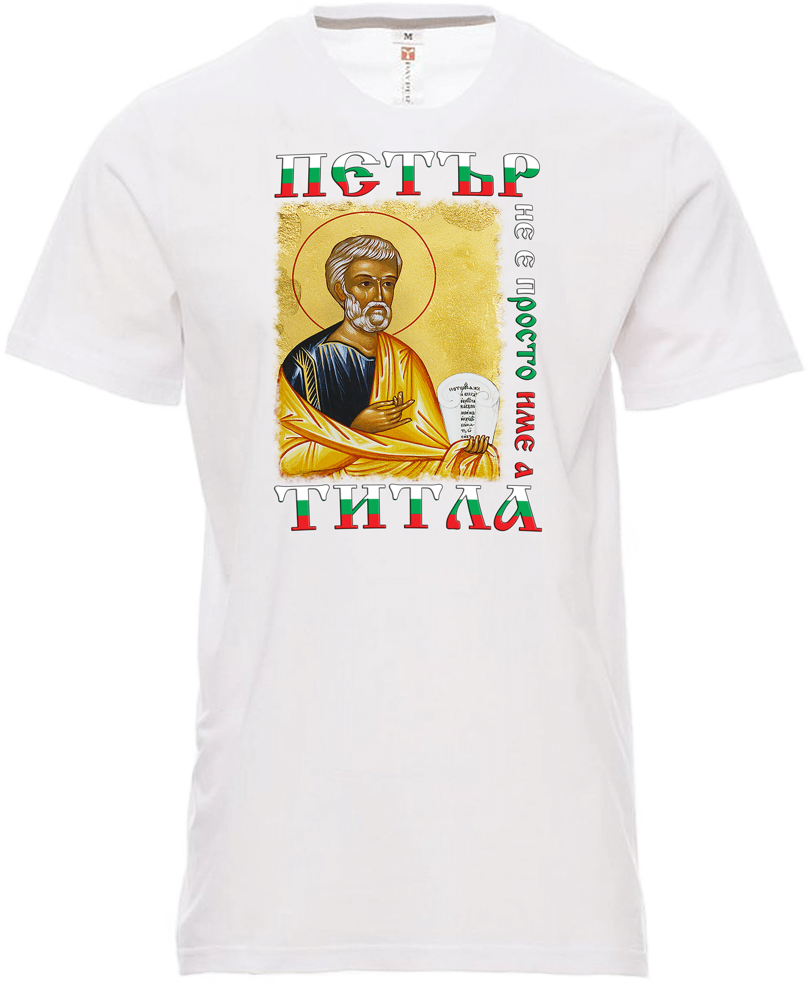 Памучна бяла мъжка тениска с дигитален печат Петър. Чудесен подарък по повод Петровден, или за да зарадвате без повод ваш близък. Материята на тениската е 100% памучна и много приятна на допир.