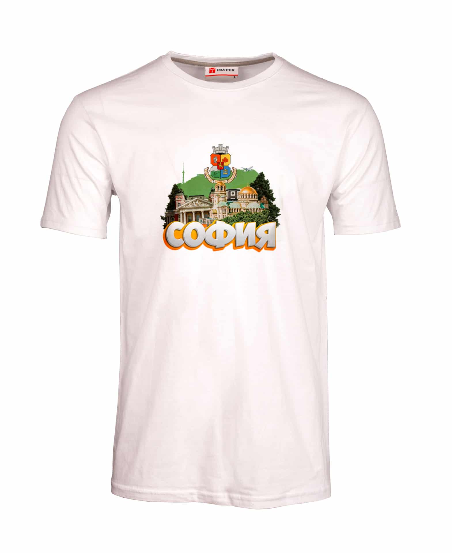 Представяме ви мъжка тениска която, създадохме за истинските почитатели на столицата! Тя е изработена от 100% памук, осигуряващ мекота и удобство през целия ден. Предлага се в бяло и черно, и в богата гама от размери – от XS до 5XL, за да пасне перфектно на всеки. С качествен DTF печат – технология, която гарантира ярки и наситени цветове, дълготрайност без напукване и избледняване. Дизайнът включва емблематични символи на София – герба на града, НДК, храм-паметника „Александър Невски“, Народния театър „Иван Вазов“.