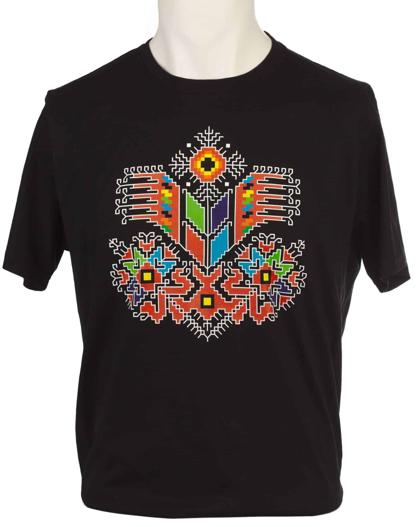 Мъжка памучна тениска черна на цвят с дигитален печат шевица по мотив Дървото на живота. Тениската е изработена от мека, 100% памучна материя. Дизайнът на шевицата е изцяло авторска разработка на Елисавета Йорданова. Цветовете на печата са ярки и наситени. Изображението е отпечатано чрез висококачествен DTF печат. Това е технология устойчива при пране и надраскване. Печатът е дигитален, което позволява изключително прецизно и фотореалистично качество на отпечатъка. Черната тениска с шевица е много подходяща за работна униформа за персонал в заведения за хранене, в магазини или за облекло на фолклорни ансамбли. Идеална е също за подарък на ваш близък. Предлагаме и друг вариант на тениската – бяла с дигитален печат Дървото на живота. Можем да предложим и дамски тениски в бял и черен вариант с шевица по мотив Лазарки. За по-малките можете да поръчате и детски тениски с шевица Лазарки или с шевица Дървото на живота.