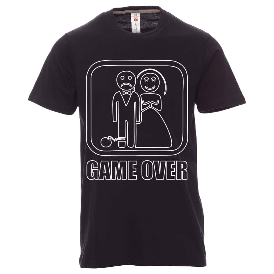 Мъжка памучна тениска Game Over – черна на цвят. Тематична тениска предназначена за бъдещи младоженци. Мека е на допир и много удобна. Изображението е отпечатано в бял цвят чрез висококачествен DTF печат от Тики. Поръчайте онлайн тениска Game Over – черна на цвят за ергенското си парти, или за да изненадате свой приятел. Може да поръчате също бяла тениска Game Over, или да изберете от другите цветове мъжки тениски. Лесно ще се свържете с нашите консултанти на посочените в сайта телефони и имейл.
