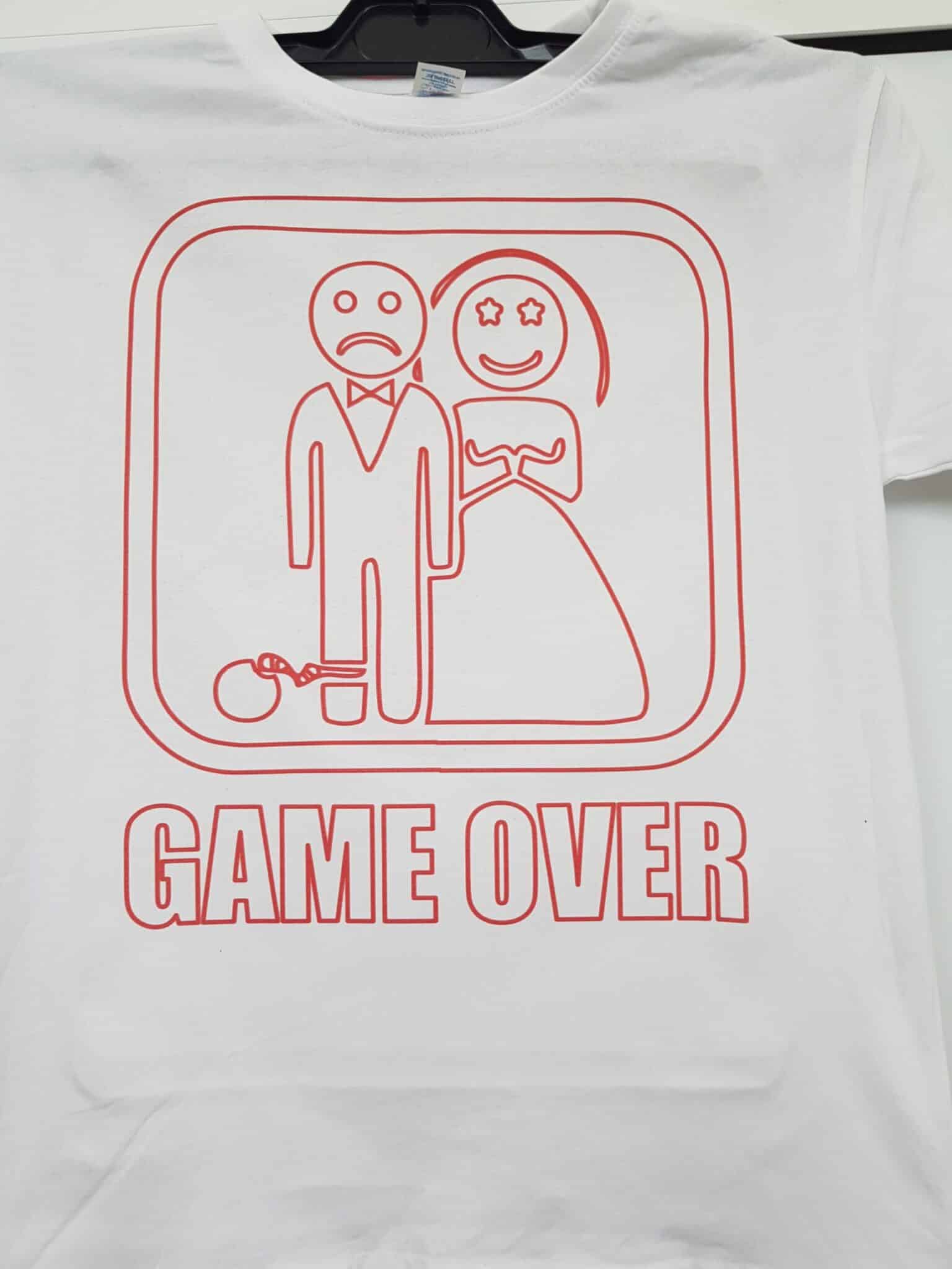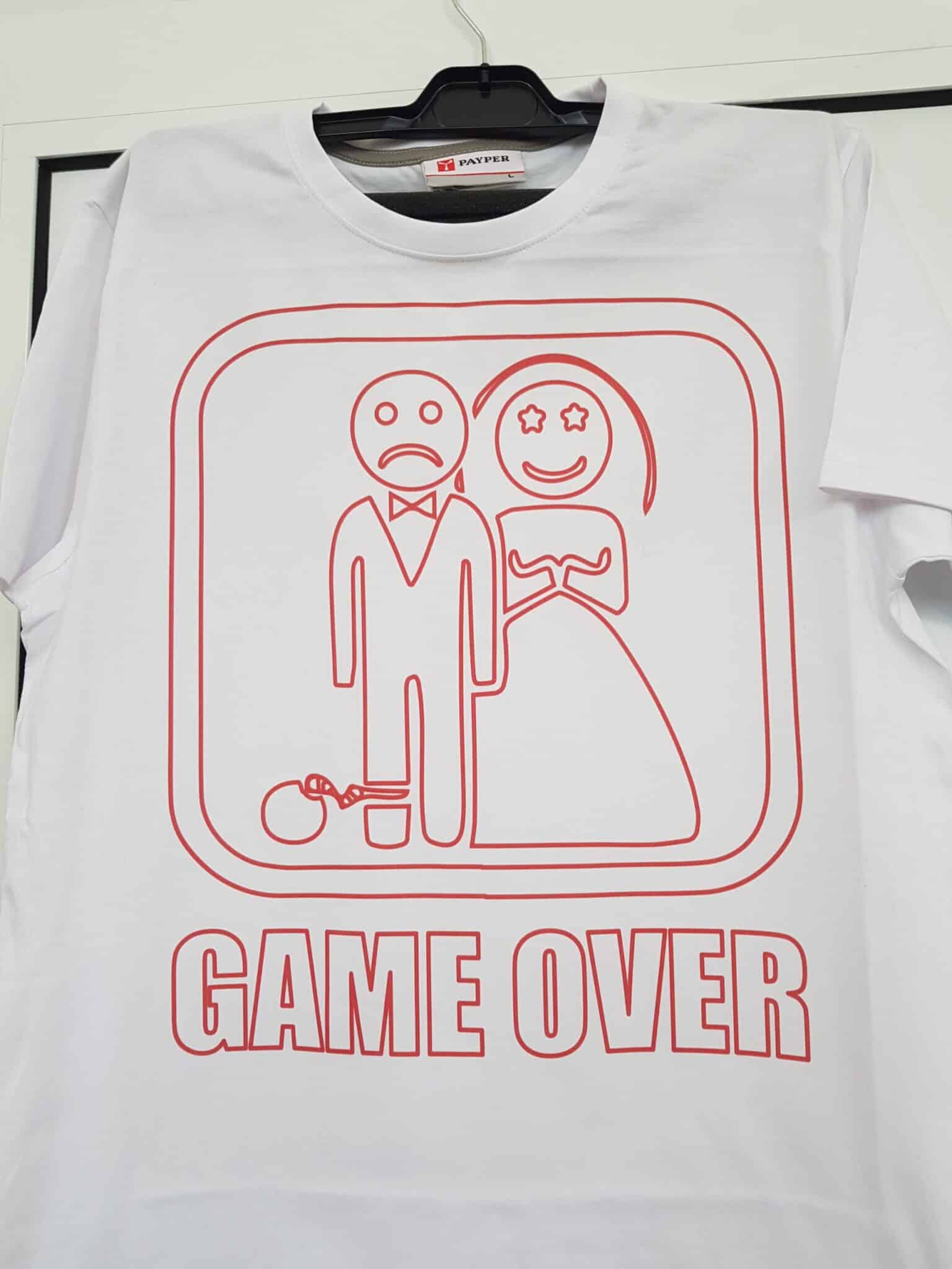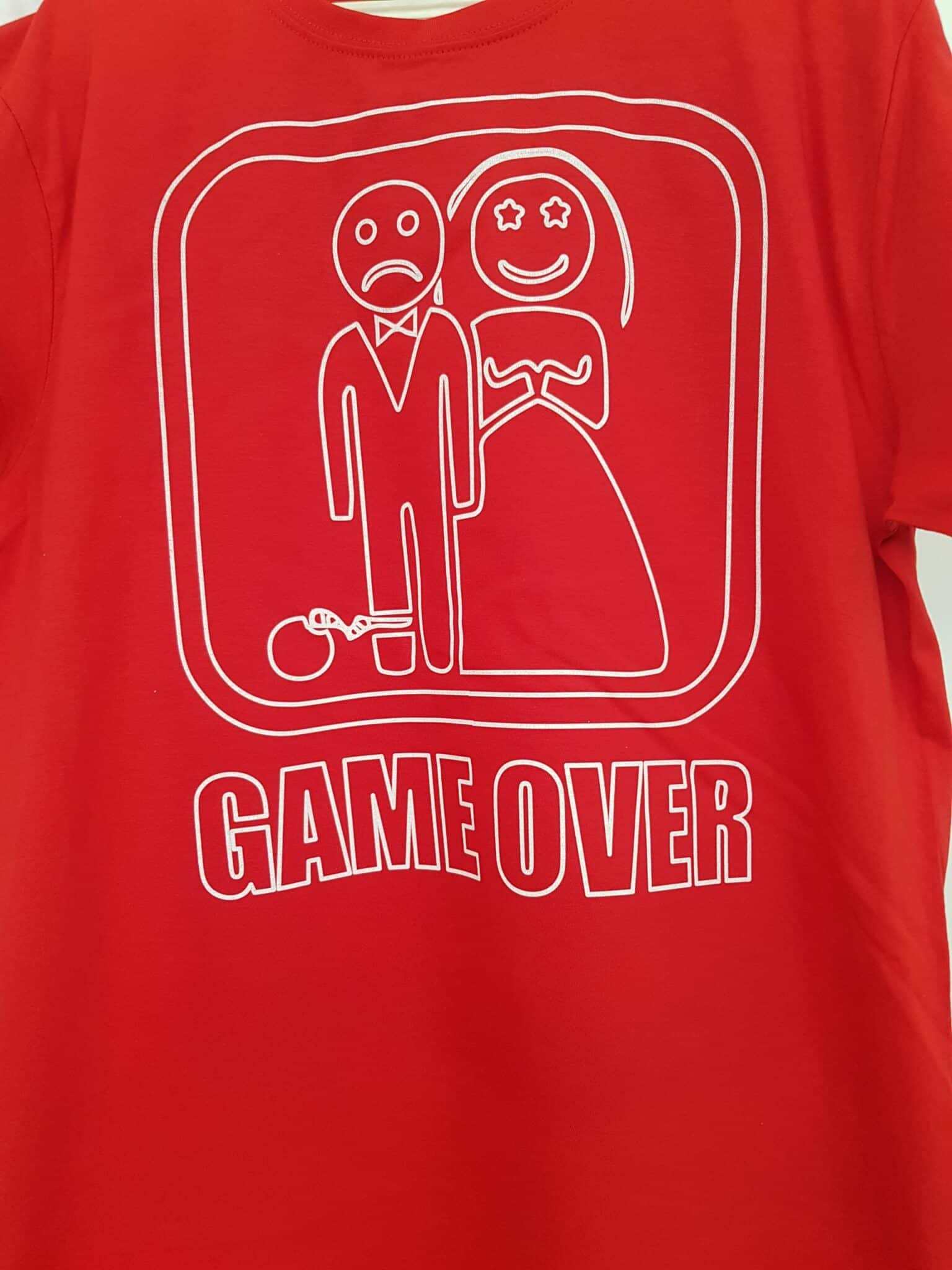 Мъжка памучна тениска в цвят бордо с дигитален печат Game Over. Забавен подарък за бъдещия младоженец. Тениската е мека и със свободна кройка. Цветът на тениската може да бъде друг по избор на клиента. Разгледайте наличните цветове от тук. По ваше желание можем да добавим печат с името на бъдещия младоженец, или датата на сватбата срещу доплащане от 2,50 лв. Можете да поръчате също и тениски с печат Team Groom за приятелите, които ще присъстват на ерегенското парти. За бъдещата булка предлагаме дамска тениска с печат Bride to be. Можете да поръчате и тениски с печат Team Bride за нейните приятелки, които ще присъстват на моминското парти.