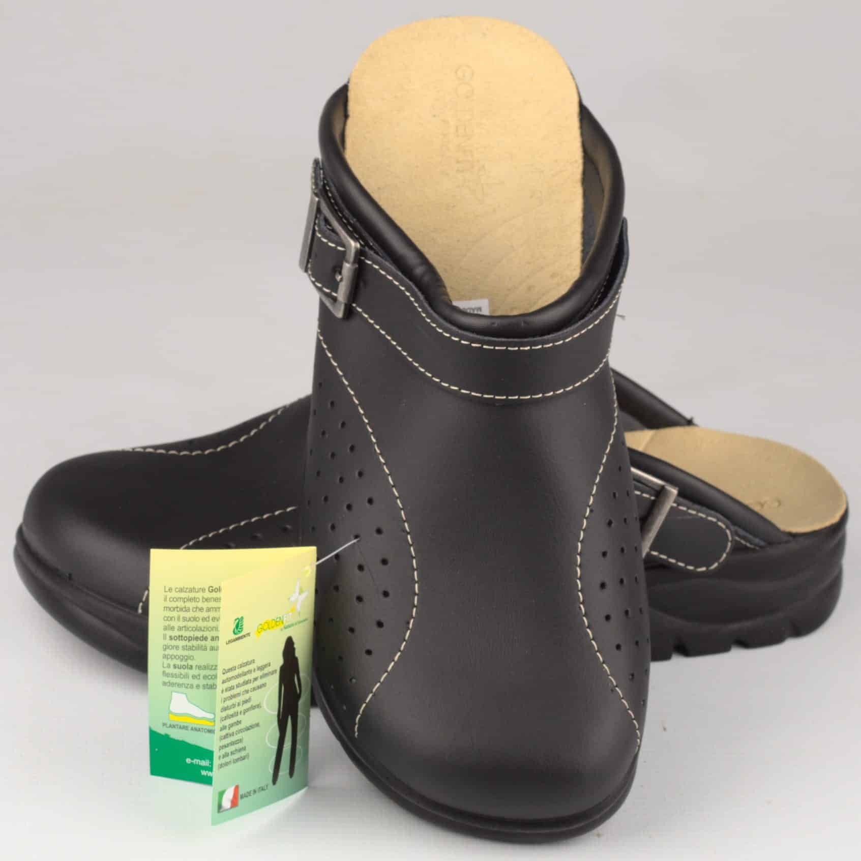 Медицинско мъжко сабо GF Drive в черен цвят. Произведено е в Италия. Изработено е от перфорирана естествена кожа с текстилна подплата, която абсорбира влагата. Има анатомична стелка и полиуретаново противохлъзгащо ходило. Моделът е снабден още и с регулируема каишка с катарама. Идеален завършек за медицинската ви униформа. Мъжко сабо GF Drive е много подходящо за употреба от медицински и санитарни работници при многочасови работни смени на крак. Отличен избор е и за работна обувка за персонал в кухни, за фризьори, рехабилитатори и много други. Можете да го ползвате и за ежедневен комфорт у дома.