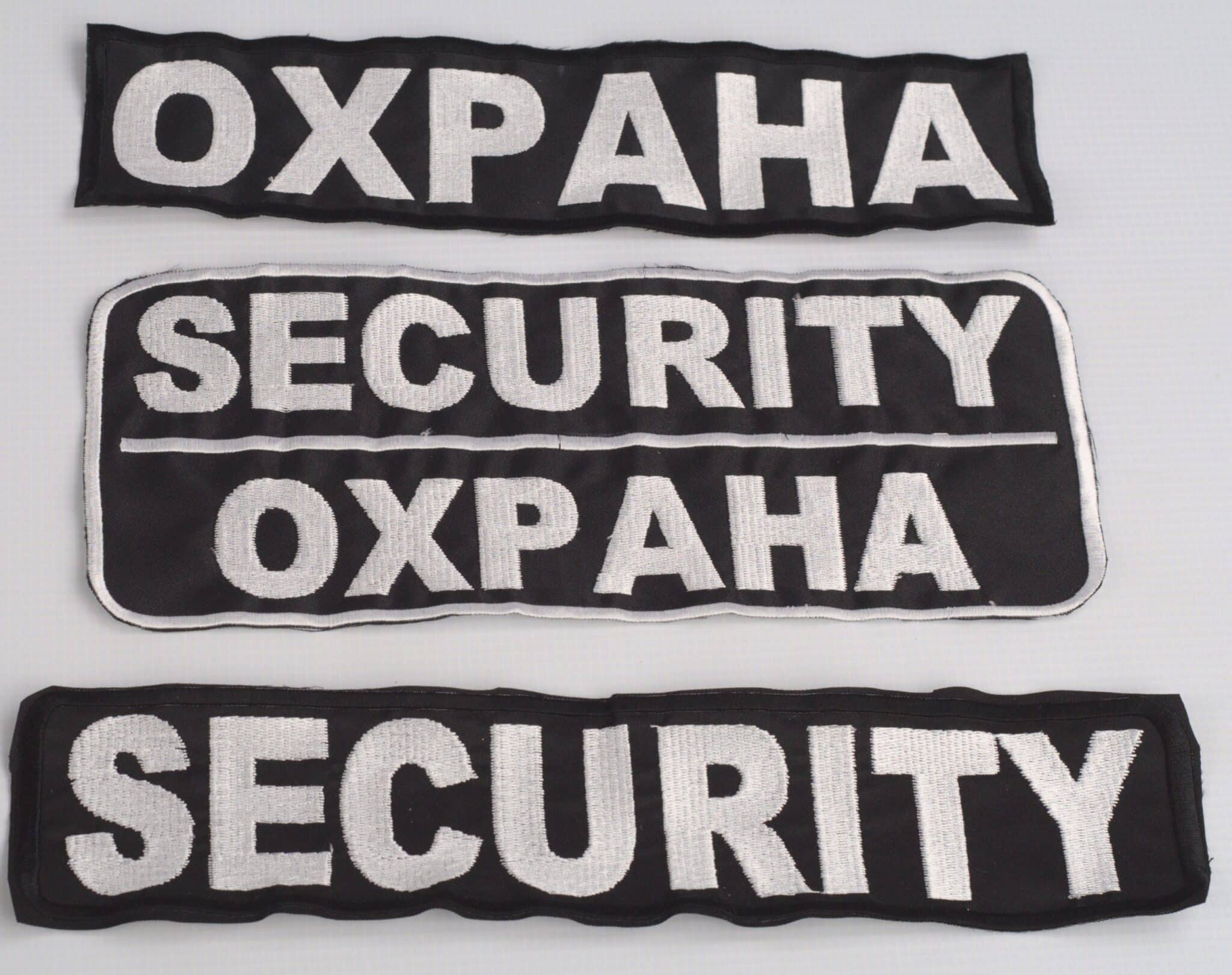 Текстилна нашивка с надпис ОХРАНА – голяма с размер подходящ за гръб на яке, тениска, или елек. Надписът върху нашивката е изработен чрез компютърна бродерия. По желание на клиента има опция за избор между три варианта на нашивката: с надпис на латиница SECURITY, с надпис на кирилица ОХРАНА, или двуезична нашивка SECURITY / ОХРАНА. Платът, който се използва за основа на нашивката, е въпрос на личен избор на клиента. Конците за бродерията с надписа, както и тези за рамката около надписа, са също по ваш избор. При поръчка е необходимо в полето за бележка да уточните подробностите.
