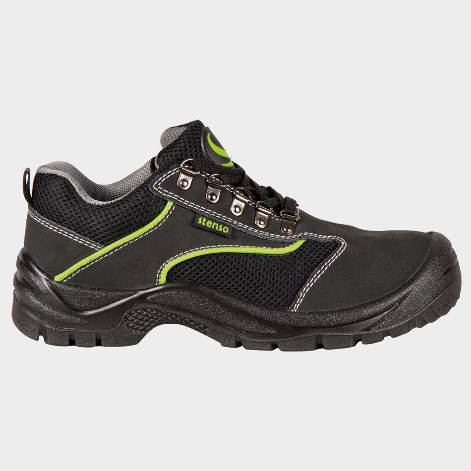 Обувки модел Емертон от категория S1 с метално бомбе в предначата част. Обувките осигуряват надеждна защита и комфорт по време на работния ви ден. Изработени са от висококачествен естествен велур и имат подвижна влагоабсорбираща стелка, гарантираща удобство дори след продължителна употреба. Специално разработената подметка е масло- и киселиноустойчива, има антистатични свойства. Металното бомбе осигурява ефективна защита от удар в предната част на обувката. Може да поръчате този модел в черно с електриково зелено, или в сиво с оранжево. Освен обувки S1 от модел Емертон при нас ще намерите и боти.