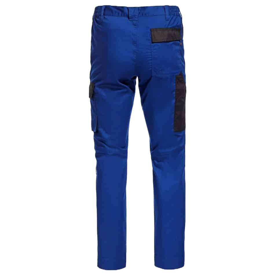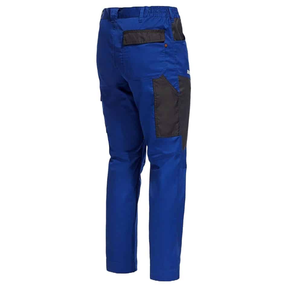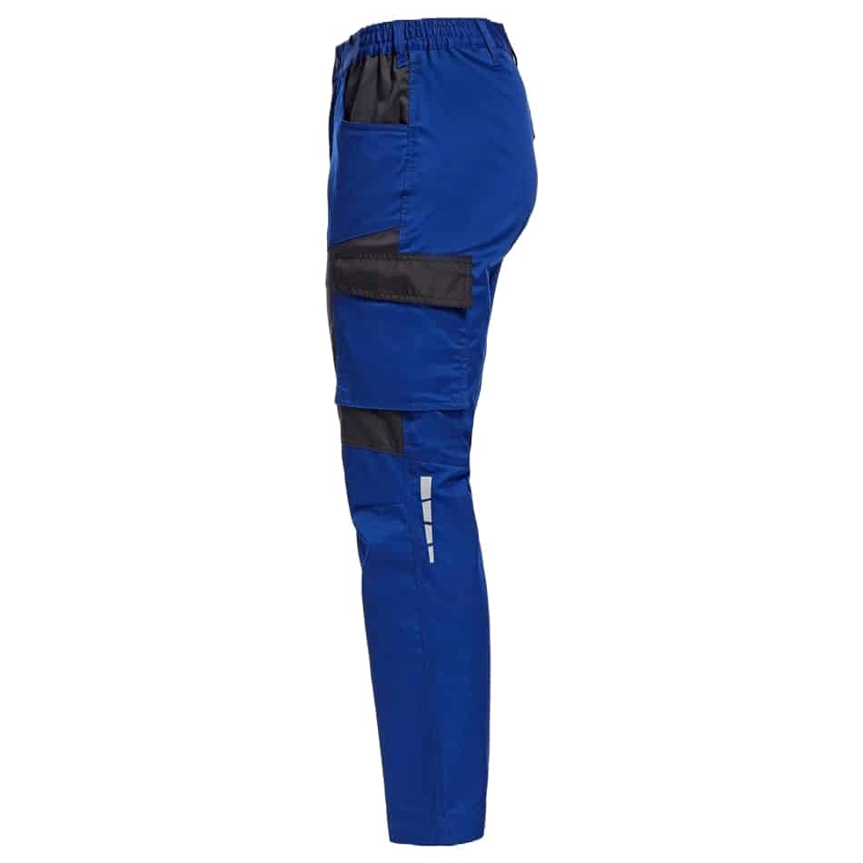 Работен еластичен панталон EOS – кралско син със светлоотразителни елементи. Моделът е с права кройка. Закопчаването на панталона е с цип YKK® и копче. Има два странични джоба и един заден с капак с велкро за всичко необходимо по време на работа. Добавените два странични джоба в областта на бедрата са изключително подходящи за инструменти. Левият, от които е с капак с велкрю, а десният без. Панталон еластичен EOS – кралско син разполага с еластична талия за максимален комфорт по време на работа. Също така има добавени тройни шевове на местата, подложени на по-голямо натоварване за по-голяма издръжливост през целият работен ден. Има също така подсилени части с 300D полиестер Oxford. Моделът е със широк подгъв на крачола, който позволява панталона да се удължи с 5 см при необходимост.
