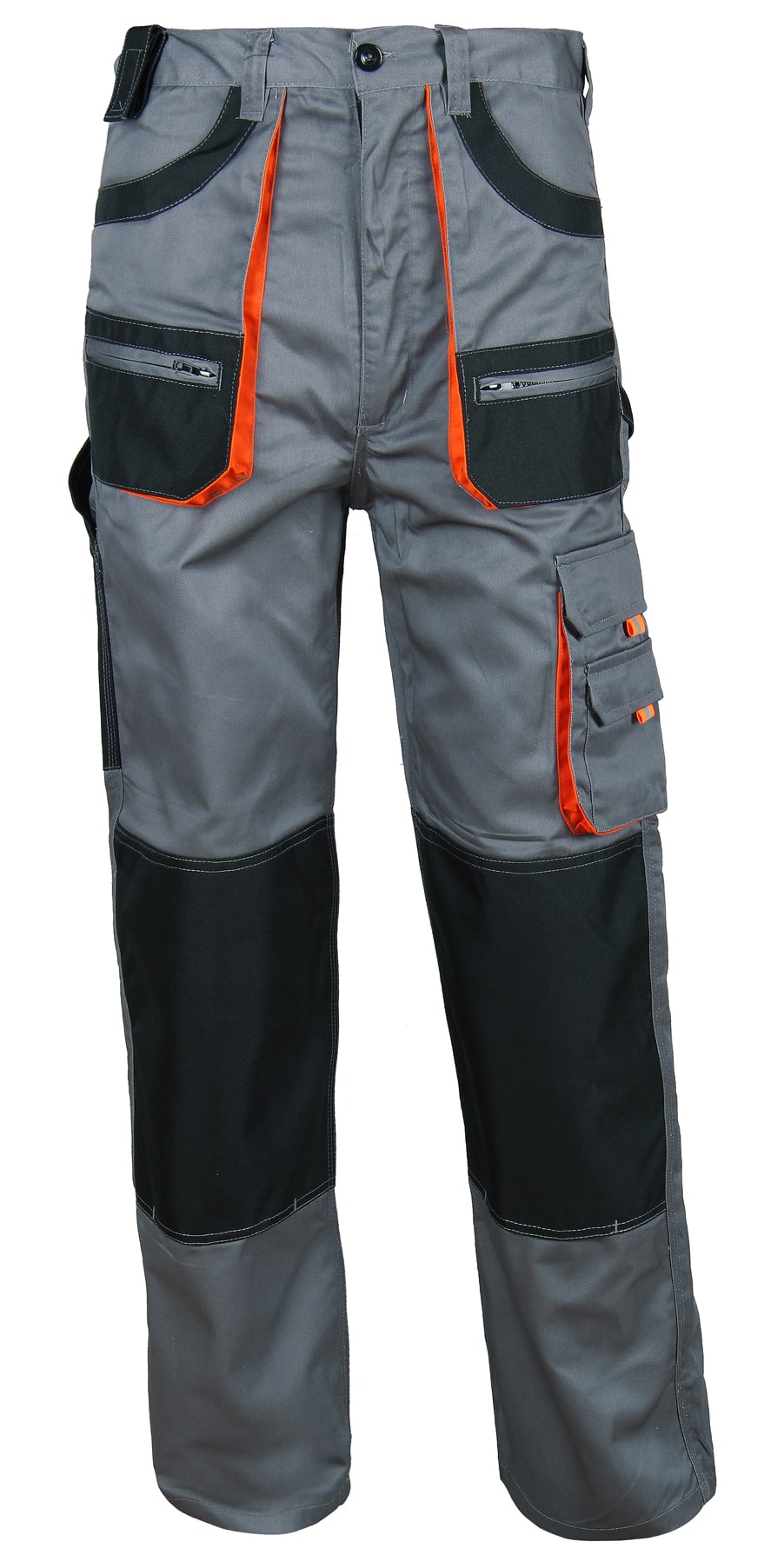 Работен панталон модел Емертон с атрактивен дизайн в сиво и черно с оранжеви елементи. Има ластик в кръста, закопчаването е с цип и копче. Панталонът разполага с пет отворени джоба отпред, два затворени с капак отзад и два странични, като единият е с капак. Колената са подсилени с възможност за поставяне на наколенки. Панталон Емертон е снабден с елементи с висока видимост.