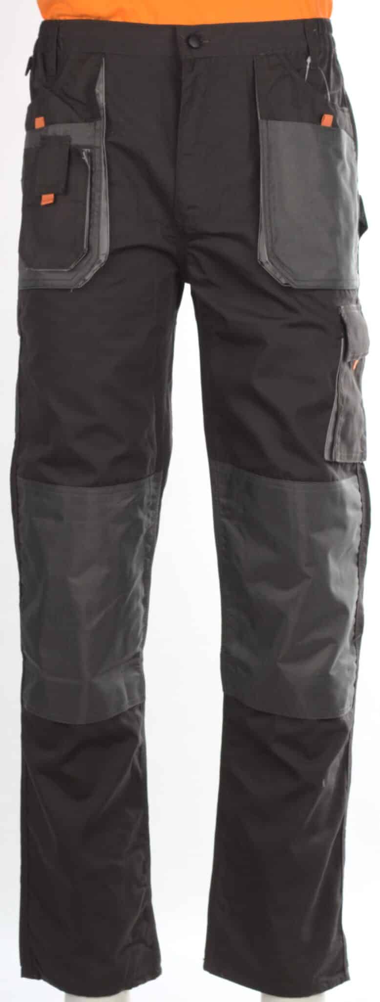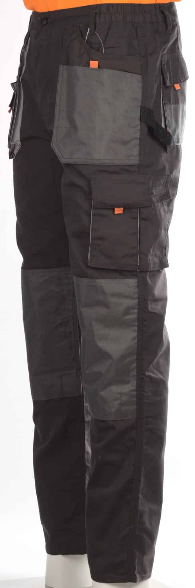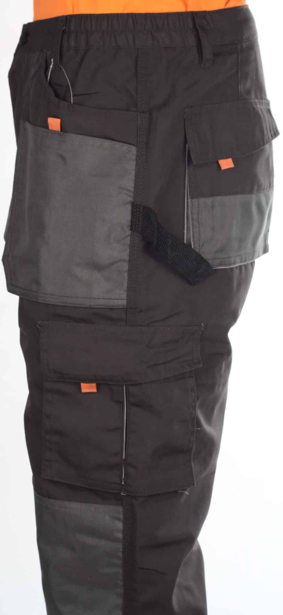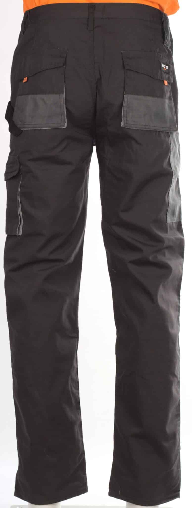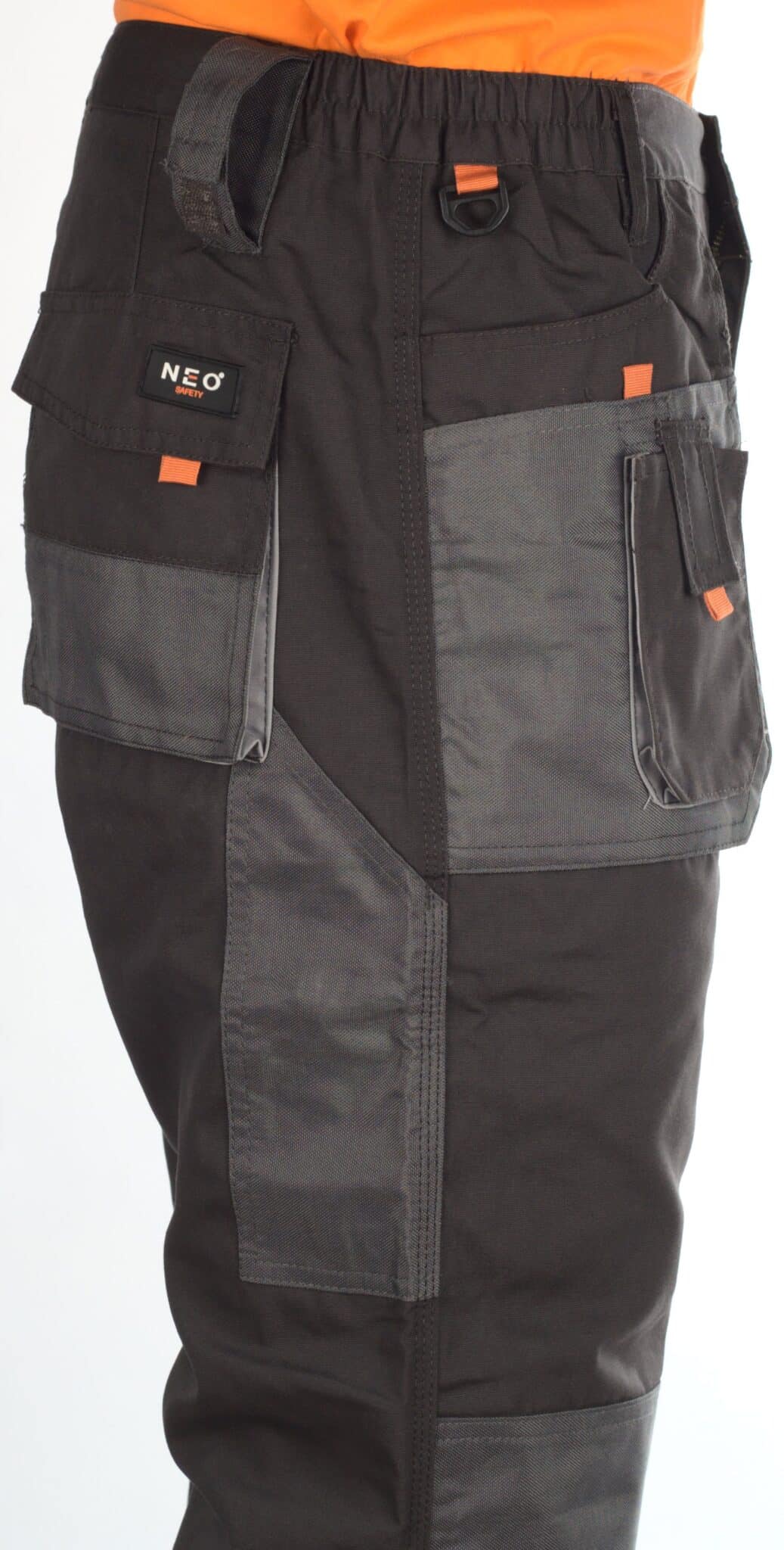 Представяме ви уникален модел работен панталон с марката Нео. Изработен е в тъмносив цвят с оранжеви и светлоотразителни елементи, с прав крачол и подсилени колене. Моделът е снабден с общо девет функционални джоба подсилени с допълнителни шевове, като седем от джобовете се закопчват с велкро. Закопчаването на панталона е с цип и копче отпред, има гайки за колан и ластик от двете страни на талията. От едната страна на талията е прикрепена инструментална гайка с велкро, а на единия заден джоб има друга текстилна гайка за карабинер.