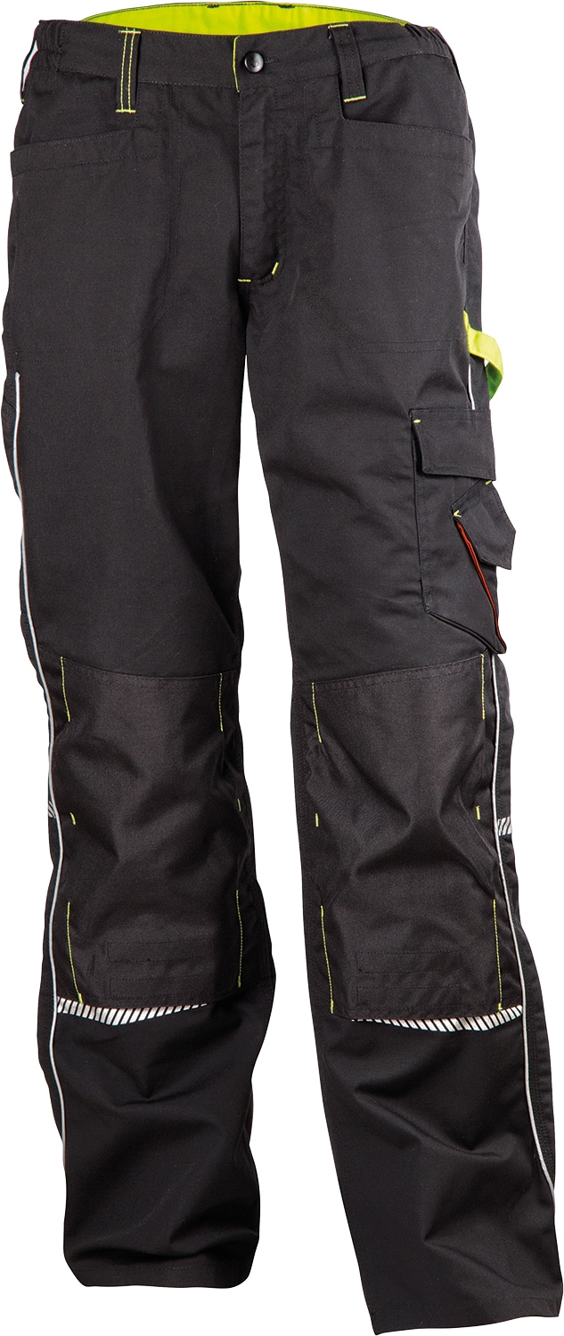 Работен панталон модел Призма в черен цвят с електриково зелени и сигнални елементи. Създаден е с удобна и практична кройка, за да осигури комфорт по време на работа. Снабден е с общо седем функционални джоба и подсилени колена. Талията е еластична от двете страни и има гайки за колан. Панталонът се закопчава отпред с копче и цип. Този модел създава отлична визия на вашите работници, а също така е много практичен и удобен за носене при многочасова работа.