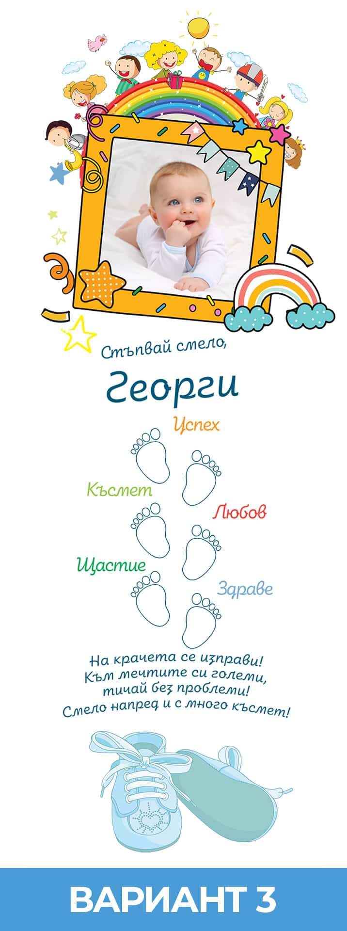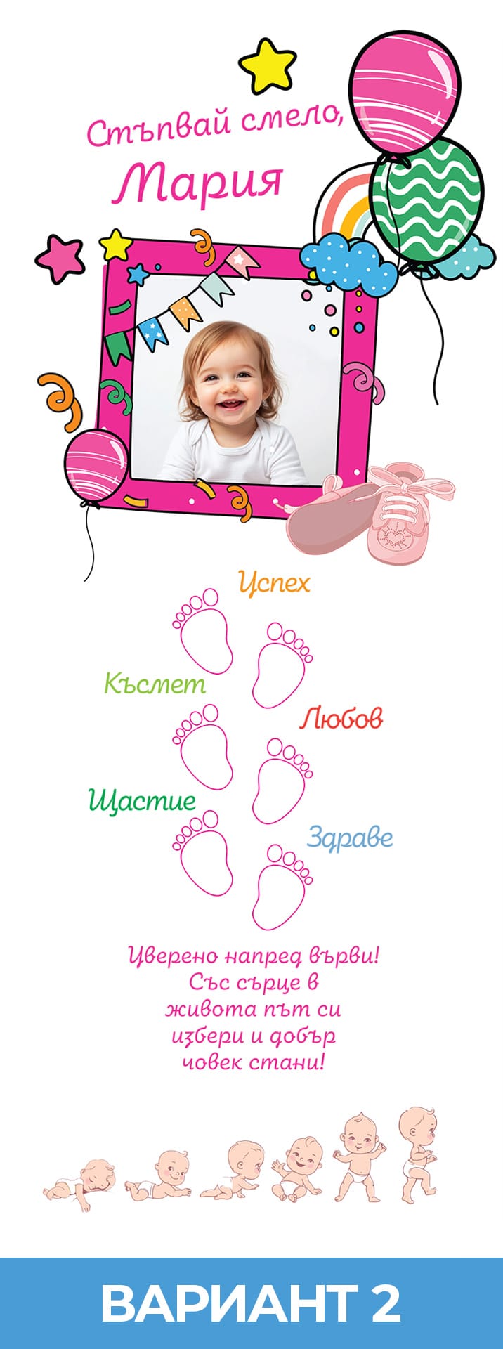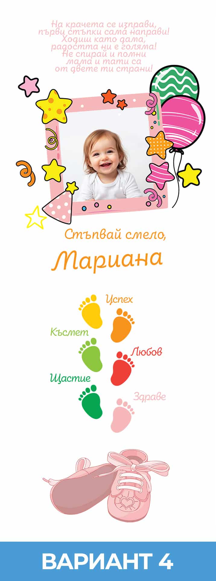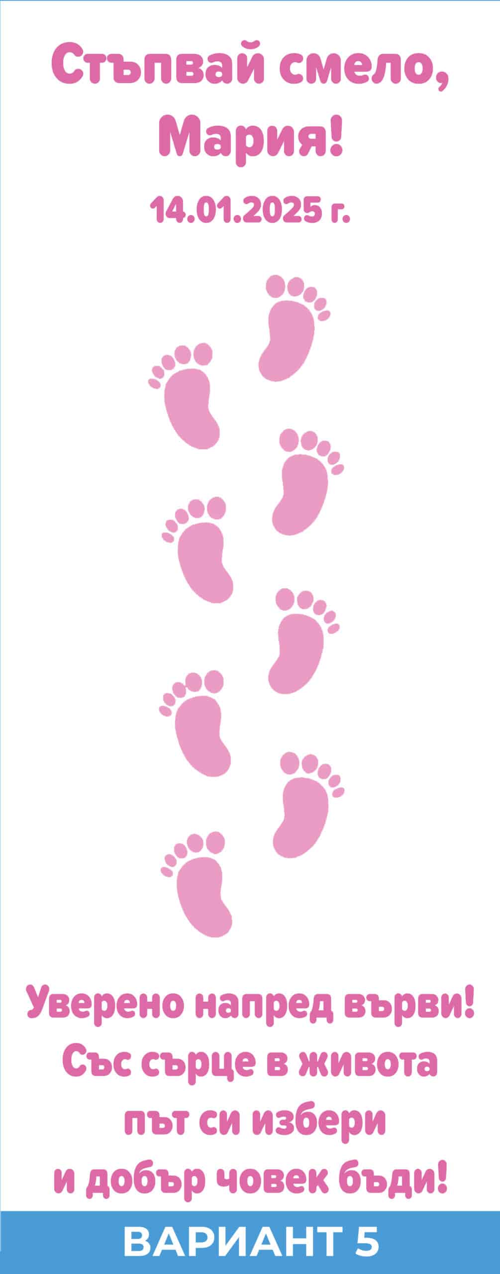 Създайте незабравим момент за първите стъпки на вашето дете с нашето платно за прохождане. Изработено е от бяла основа от плат смес памук и полиестер. Платното е с размери 150 х 60 см, идеално за първите стъпки на детето. Печатът се нанася с висококачествена DTF технология, гарантираща ярки цветове и дълготрайност. Изберете от нашите готови шаблони с красиви дизайни и послания или създайте своя уникален проект, като ни изпратите ваши картинки, снимки и текстове. Вариантите от 1 до 4 на нашето платно за прохождане са със снимка на детето. Ако желаете да поръчате с ваша снимка, ни изпратете изображението на: print@tiki.bg. Платното за прохождане е не само прекрасен спомен, но и основен акцент в традицията. Поръчайте го днес и направете празника на детето си още по-специален! При нас може да поръчате и кърпи за Свето кръщение.
