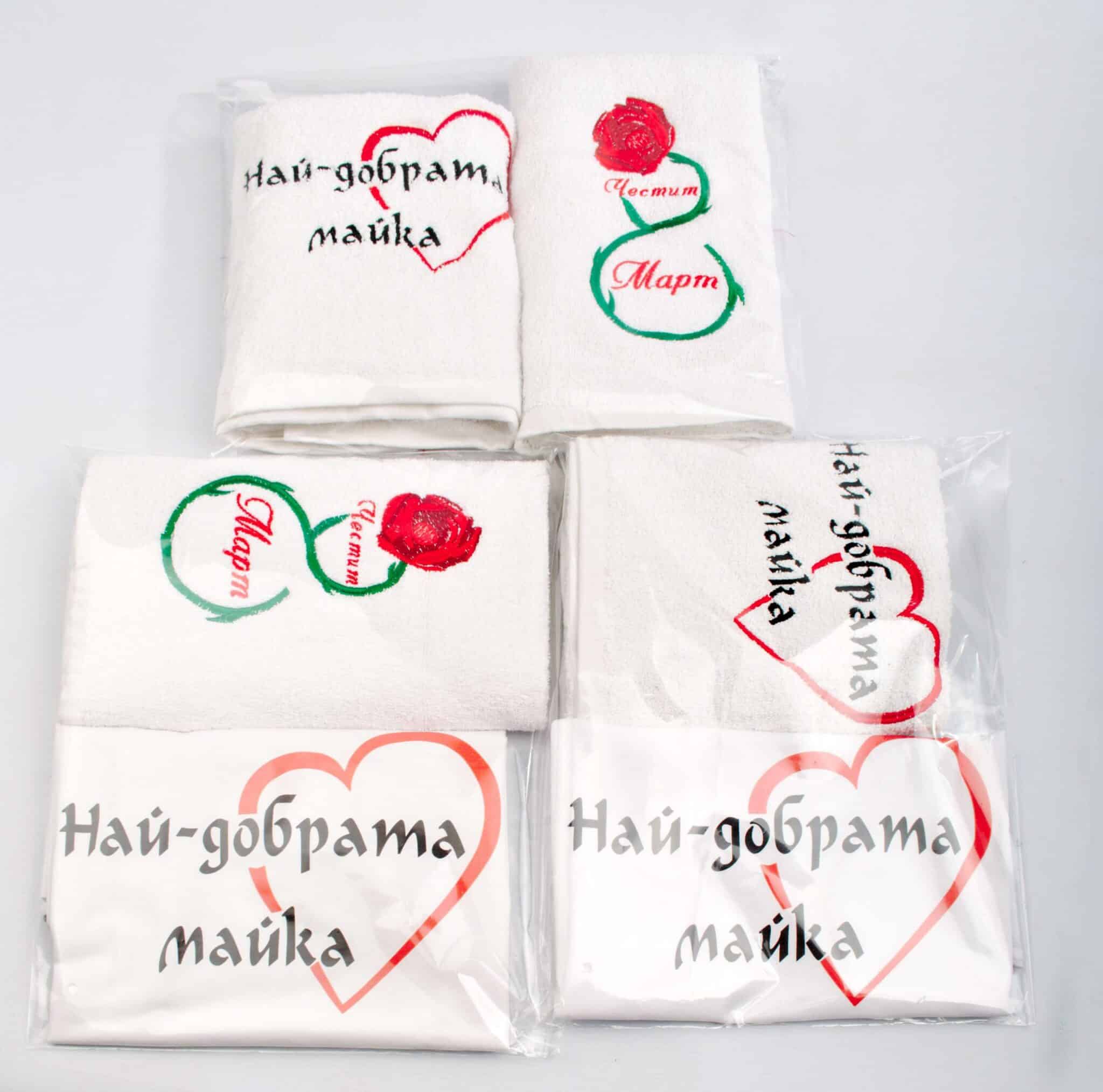 - Бяла хавлиена кърпа с размер 50х90 см. Кърпата е с плътност 450 г/м2, 100% памук. Върху кърпата има компютърна бродерия в три цвята: червено, бордо и зелено – роза с текст: Честит 8-ми март.