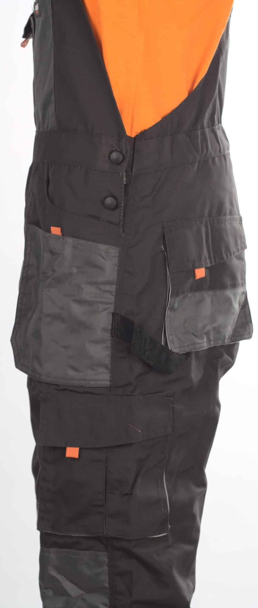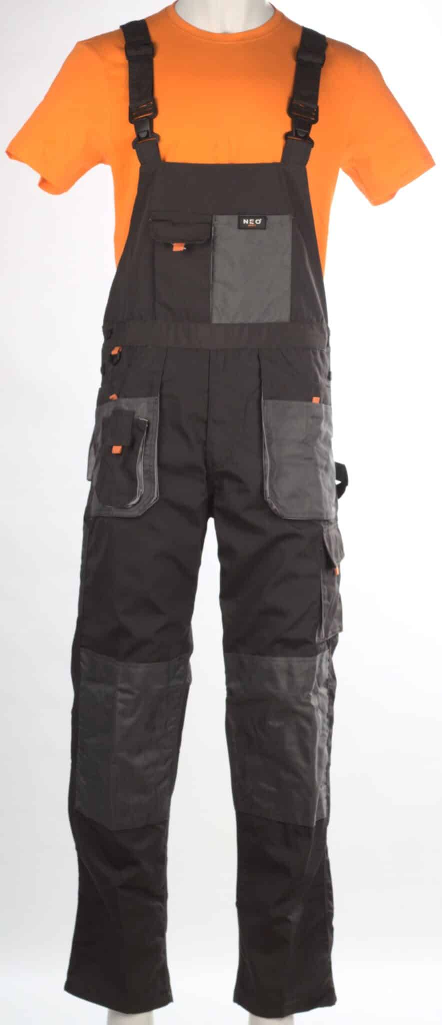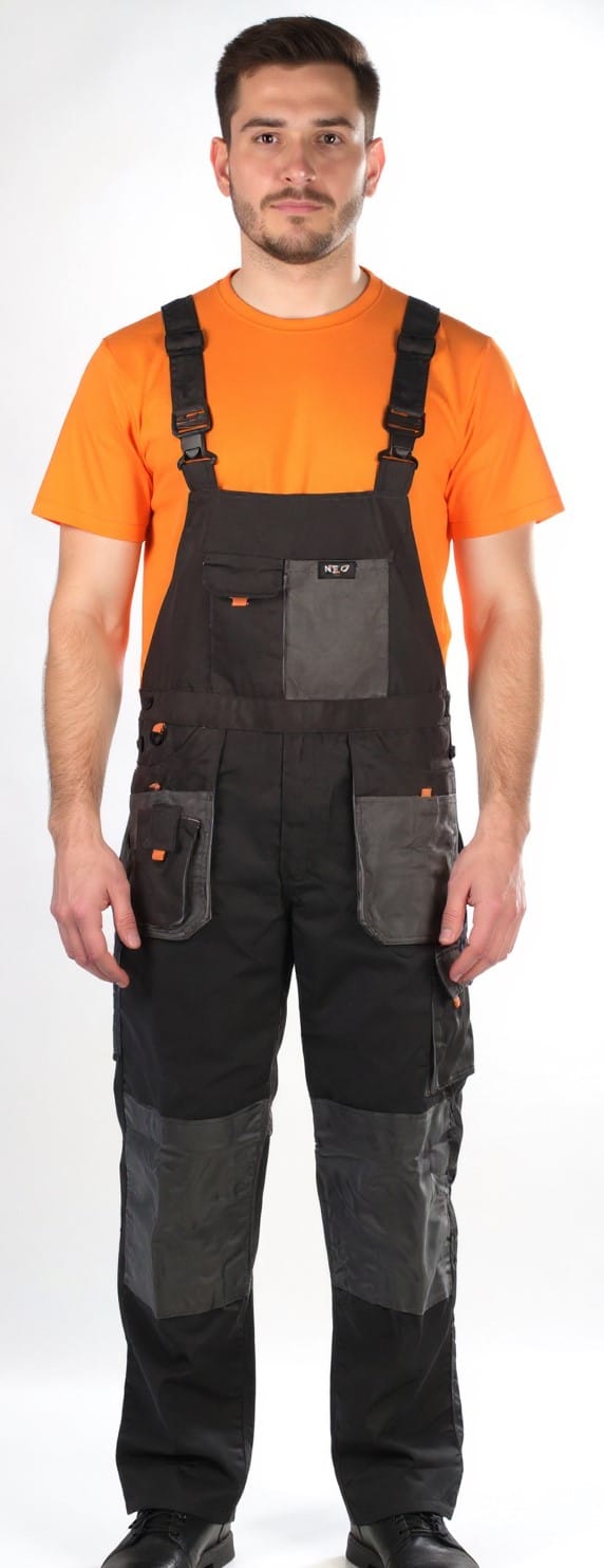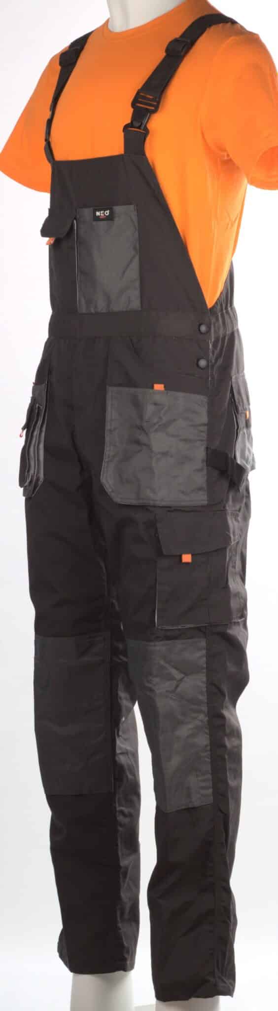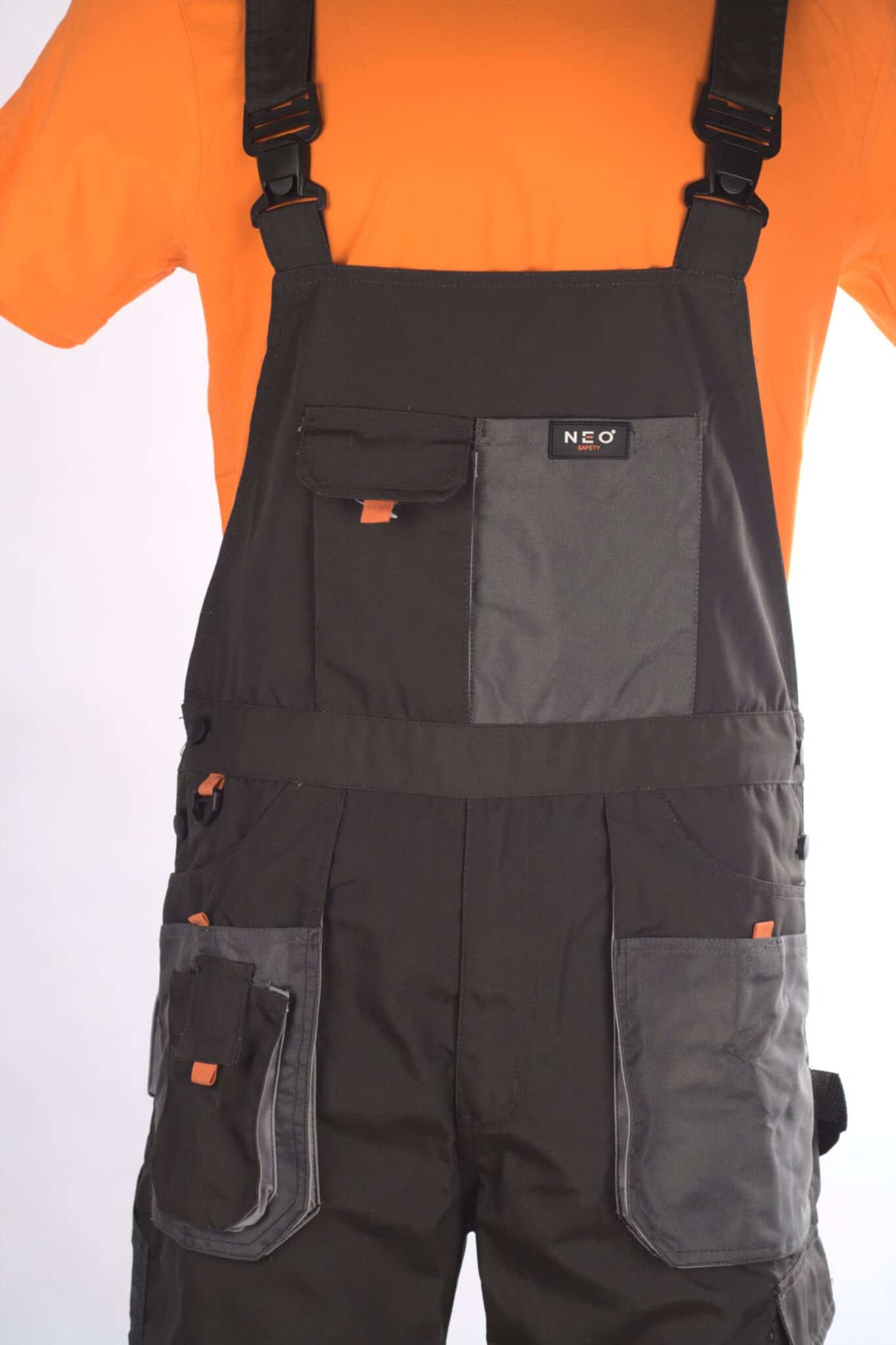 Работен полугащеризон модел Нео в тъмносив цвят с оранжеви и светлоотразителни елементи. Моделът има общо единадесет функционални джоба, осем от които се закопчават с велкро. Кройката на крачолите е права, а коленете са подсилени. Гащеризонът има ластик отзад на талията и цип в предната част. Дължината на презрамките му може да се регулира с помощта на катарами.