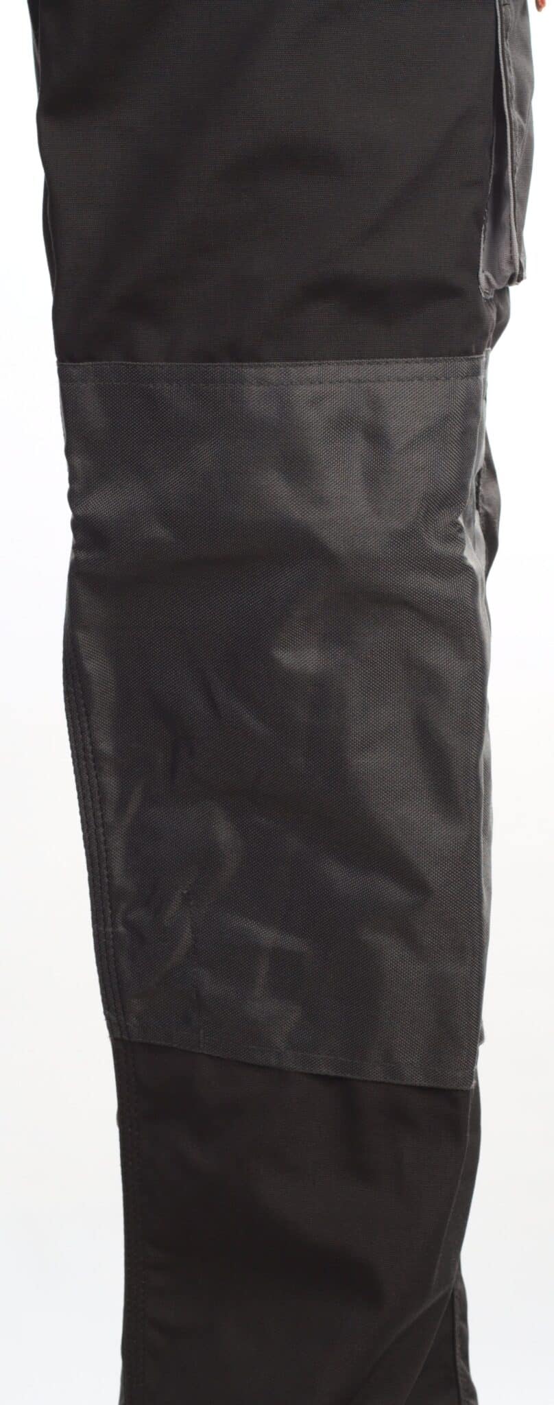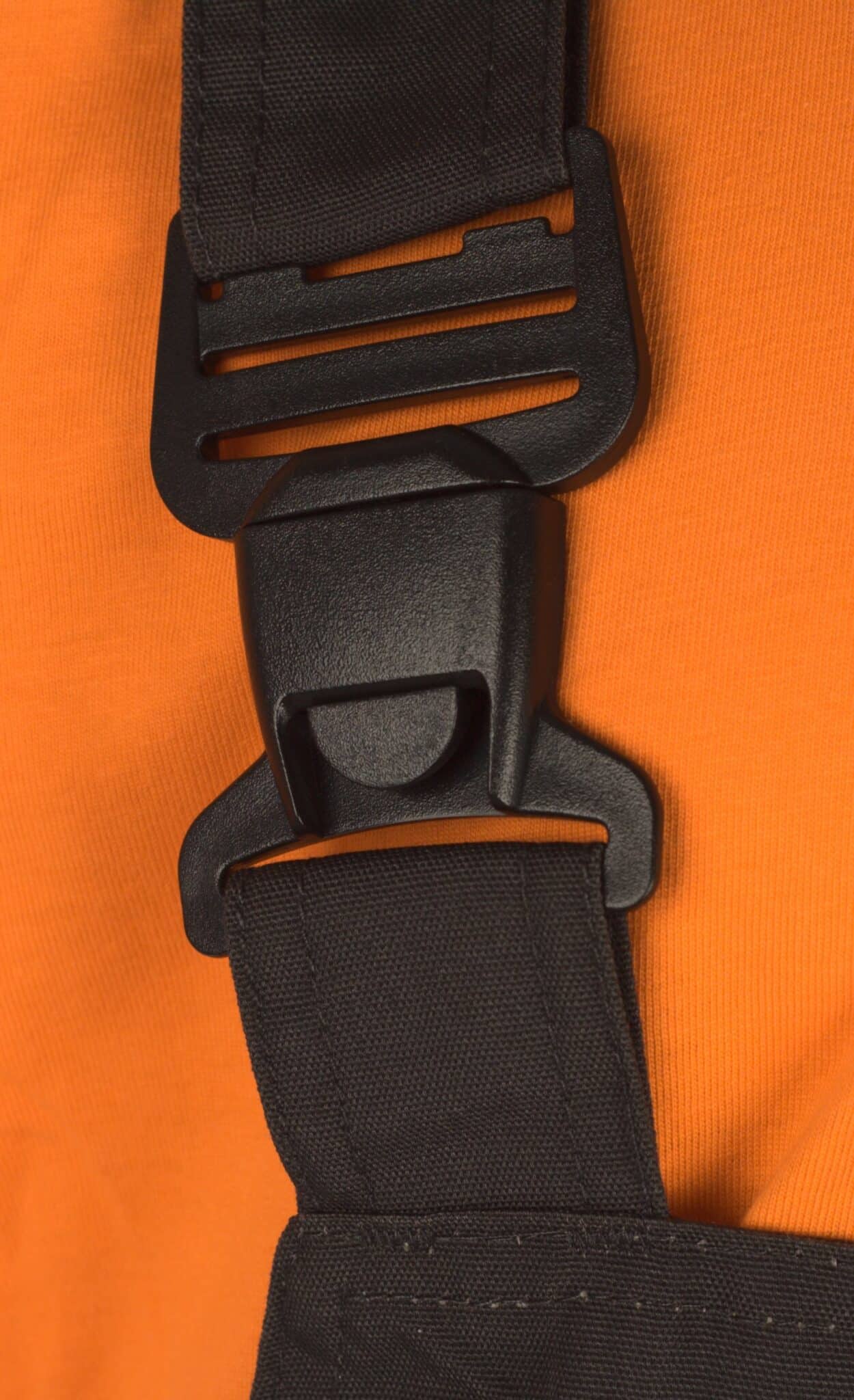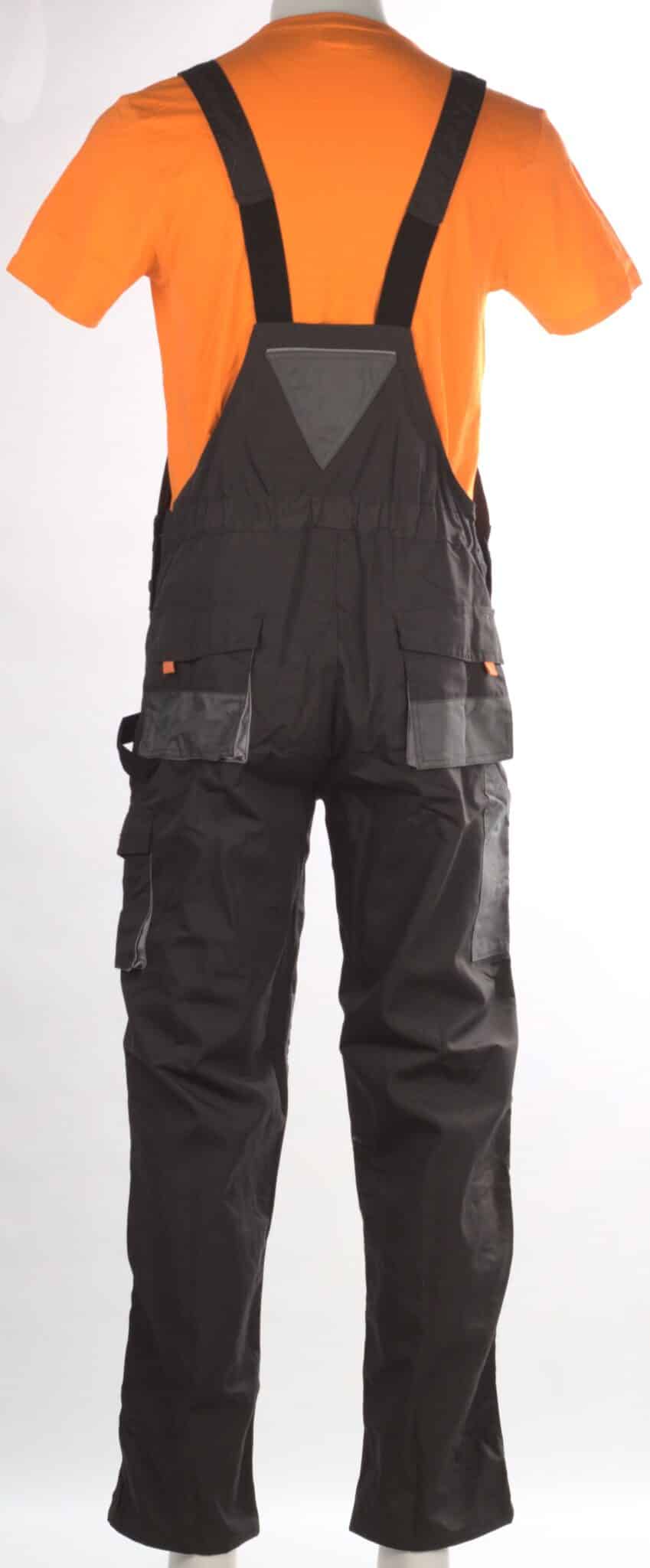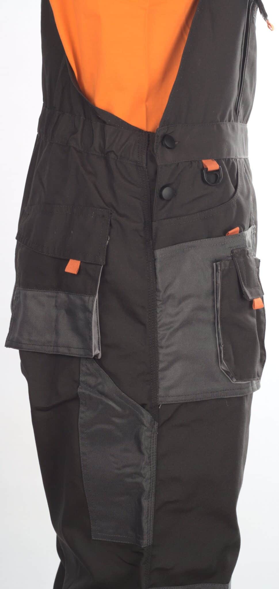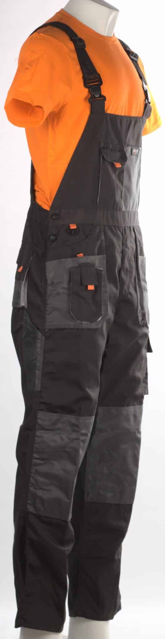 Работен полугащеризон модел Нео в тъмносив цвят с оранжеви и светлоотразителни елементи. Моделът има общо единадесет функционални джоба, осем от които се закопчават с велкро. Кройката на крачолите е права, а коленете са подсилени. Гащеризонът има ластик отзад на талията и цип в предната част. Дължината на презрамките му може да се регулира с помощта на катарами.
