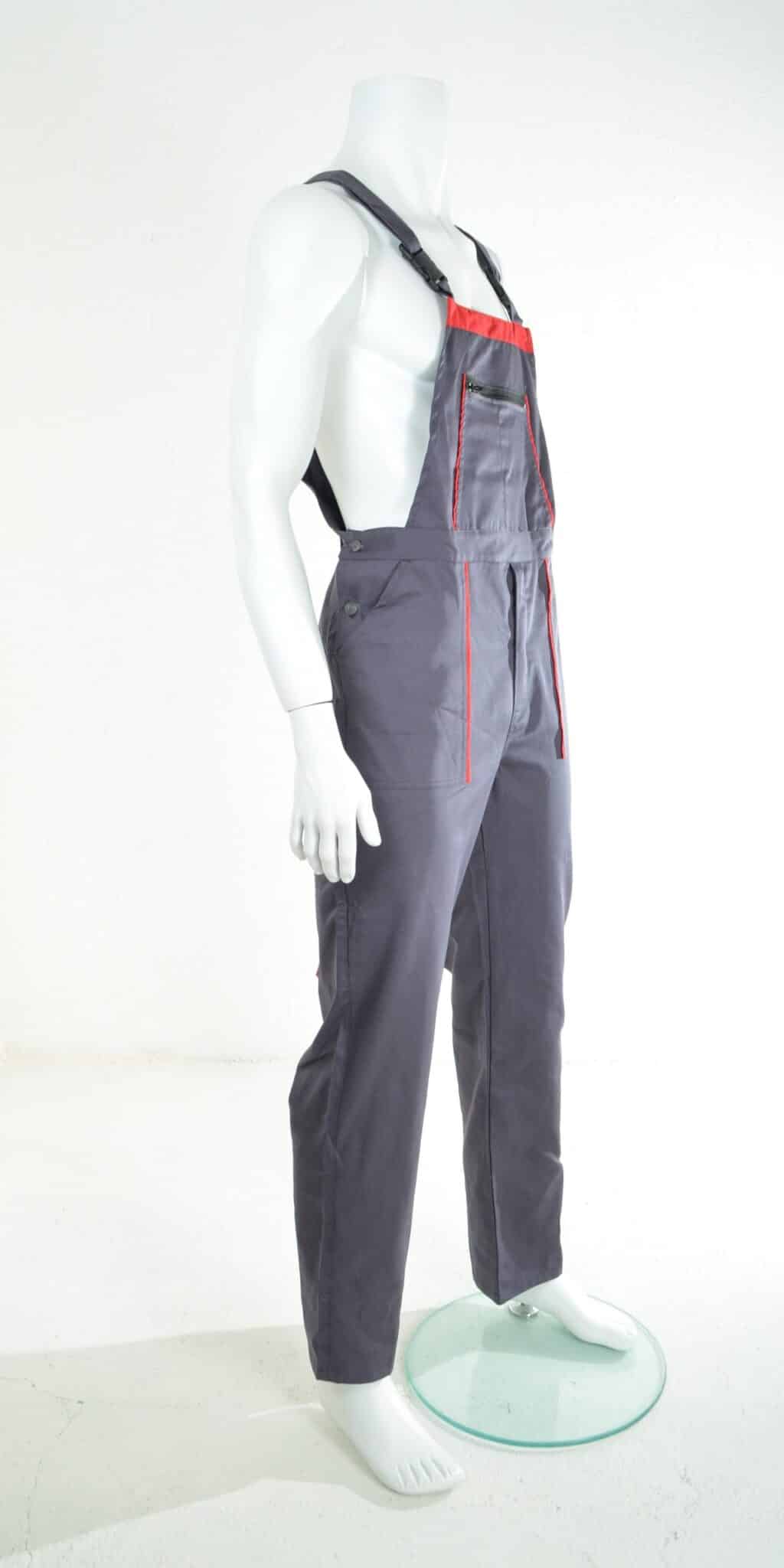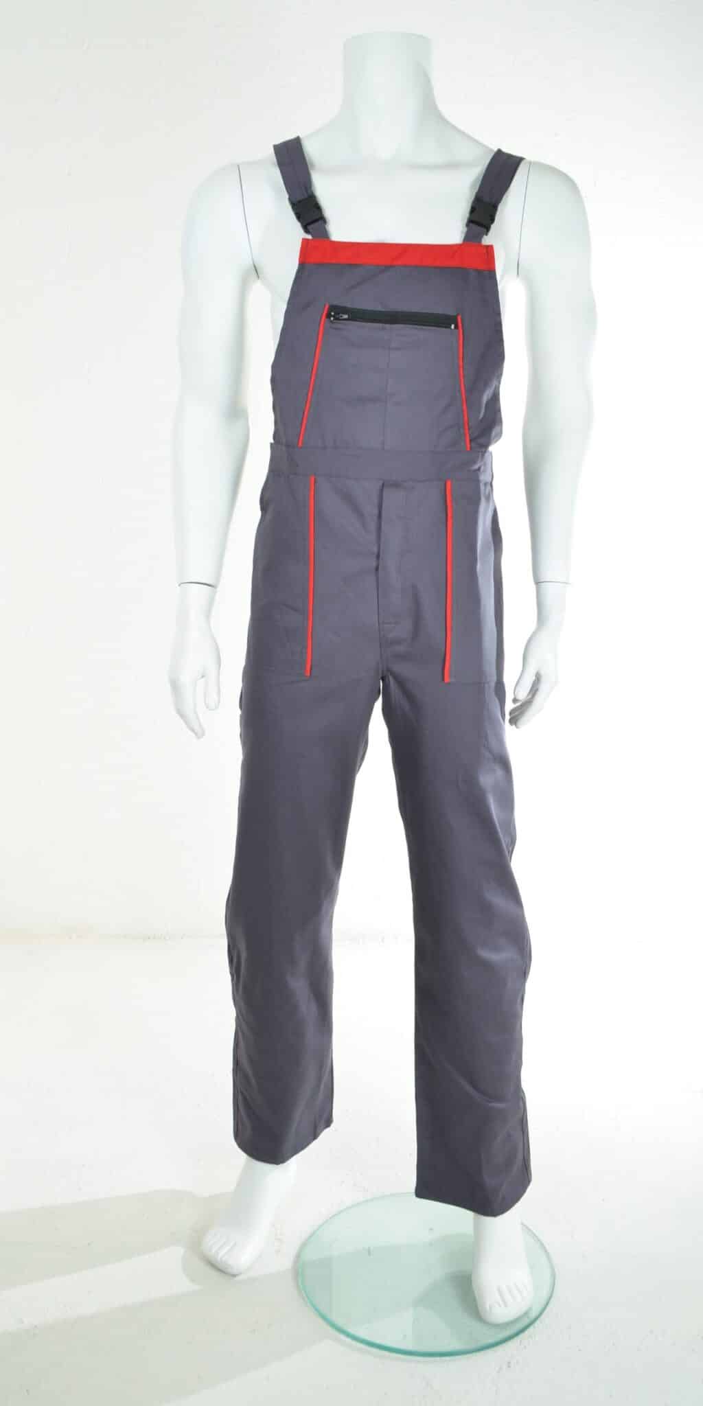 Работен полугащеризон от памук/полиестер в сив цвят с червени елементи. Изработен е по удобна и ергономична кройка, с която работникът да се чувства комфортно през целия работен ден. Моделът има регулируеми презрамки, един голям джоб на гърдите с цип, два предни джоба, един инструментален на крачолите и един заден джоб. По ваш избор можем да изработим полугащеризон освен от плат памук/полиестер сив, също и от материя 100% памук. Потърсете ни за информация на посочените телефони и имейл. Поръчайте лесно онлайн, или посетете фирмените ни магазини.