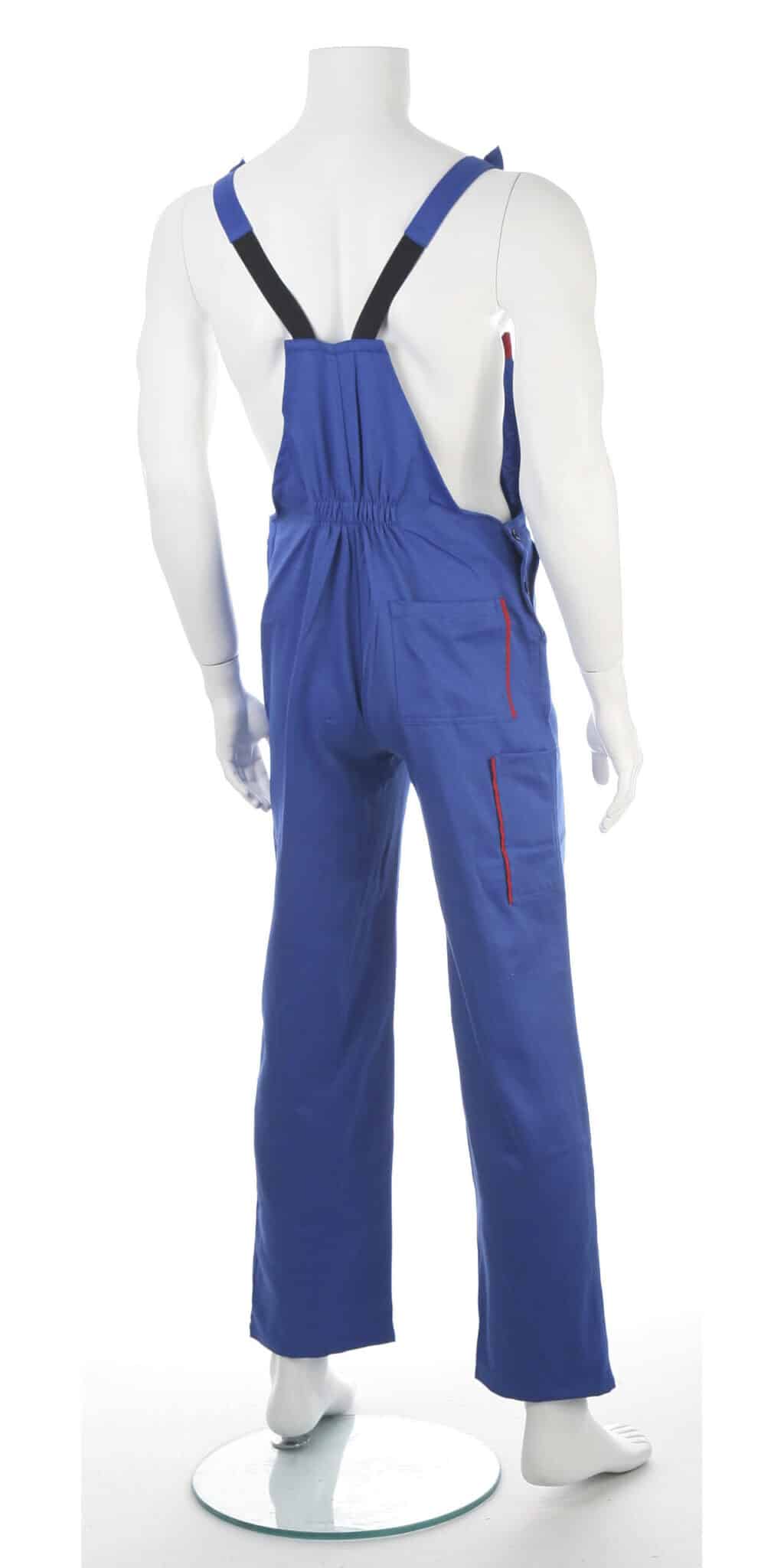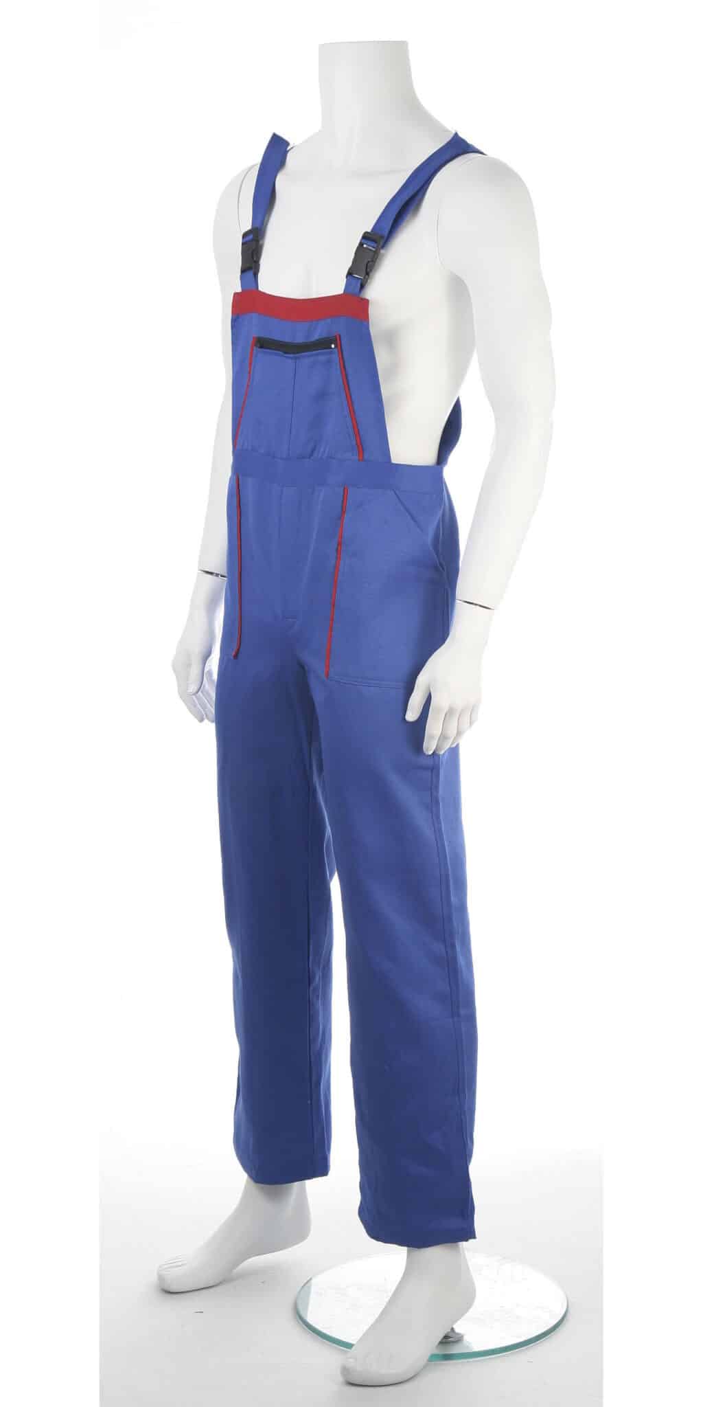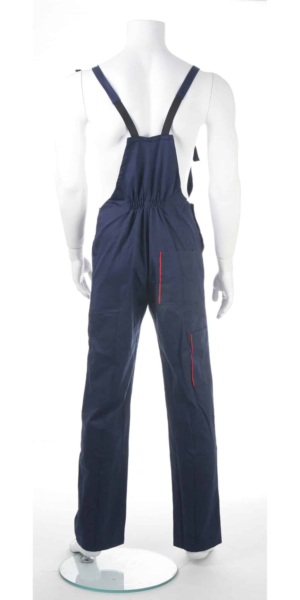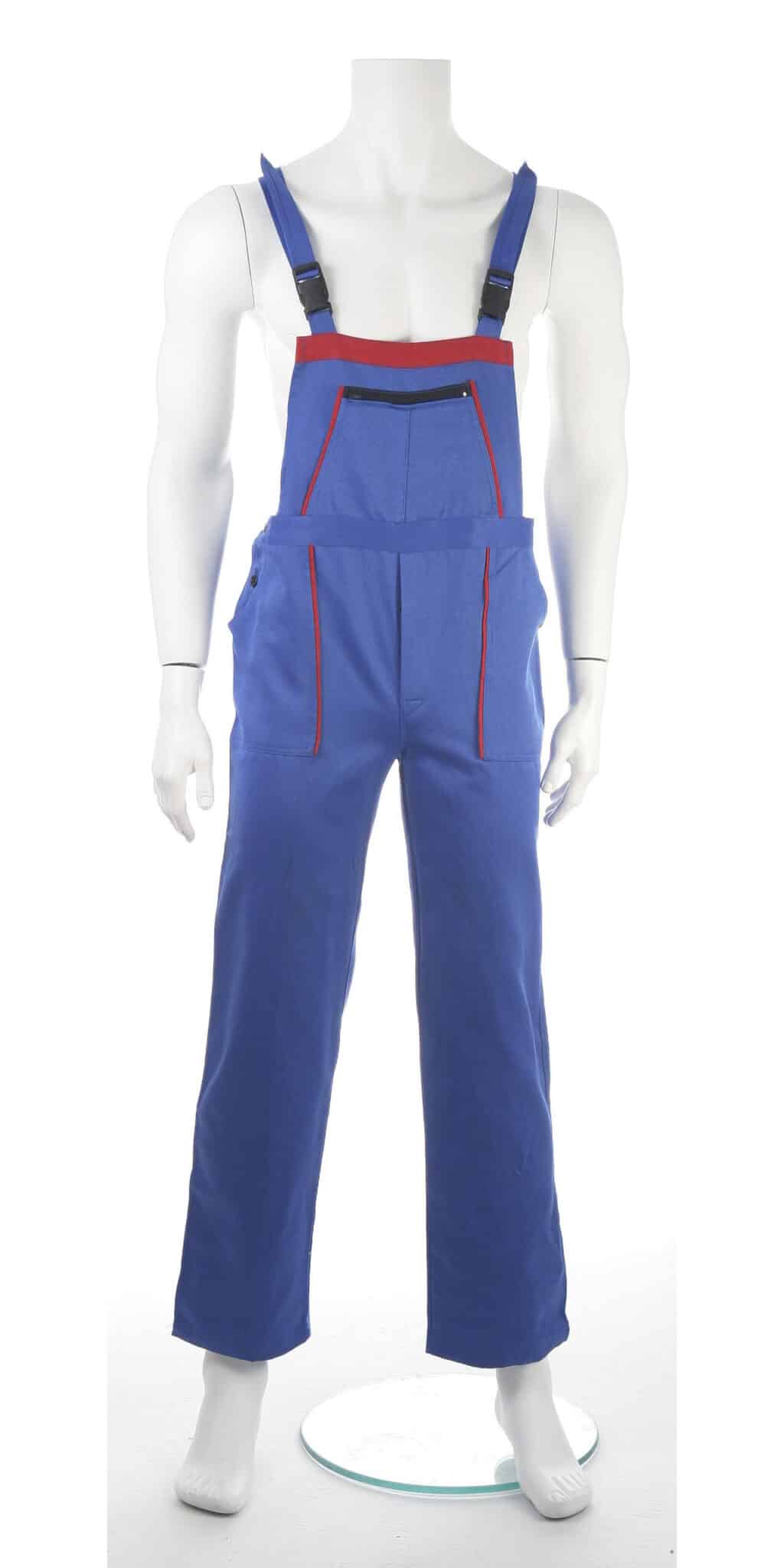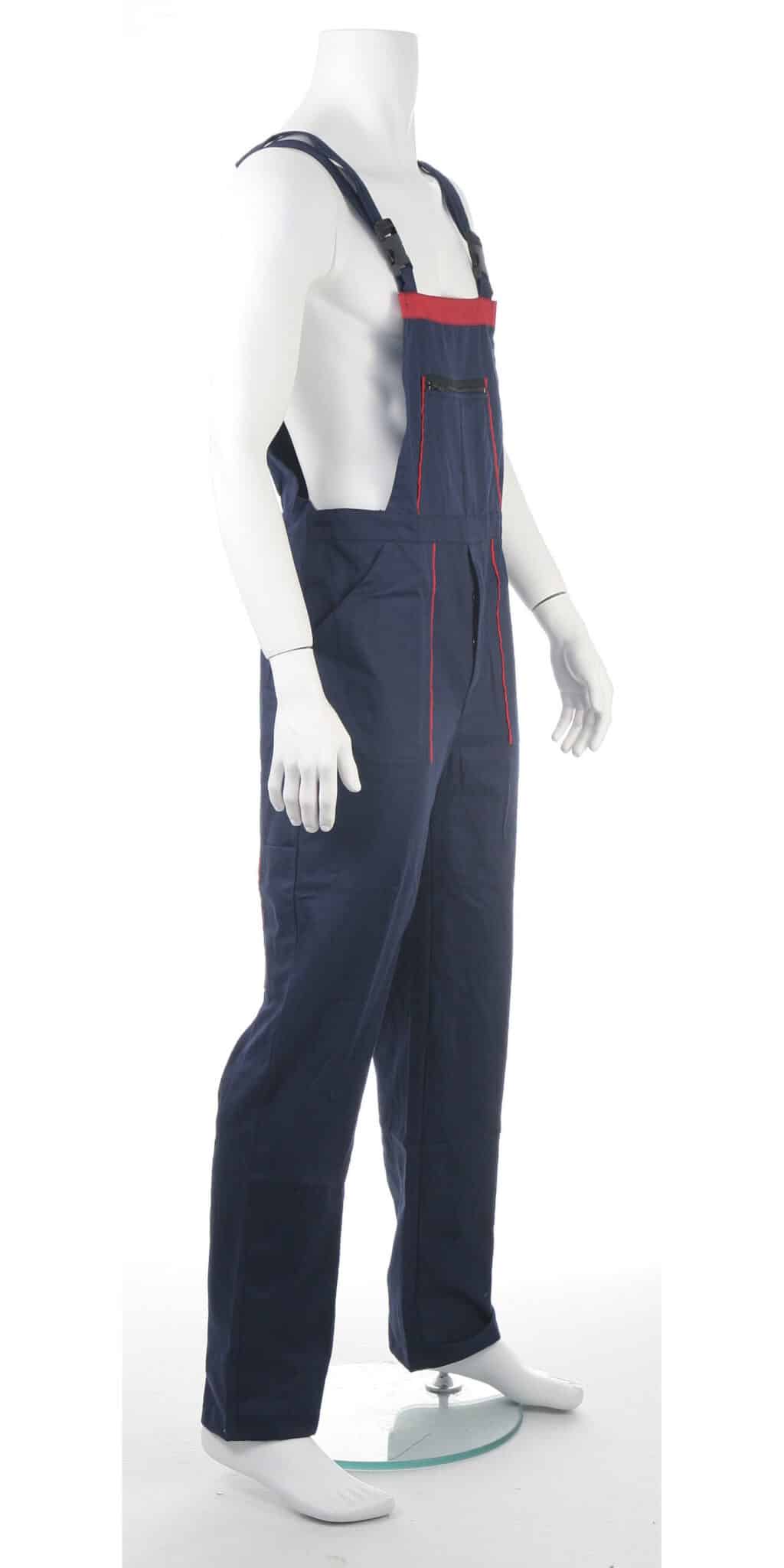 Работен полугащеризон произведен от 100% памук в син цвят. Кройката е удобна и ергономична. Моделът има регулируеми презрамки. Оборудван е с един голям джоб на гърдите с цип и два предни джоба. Има също един инструментален джоб на крачолите и един заден джоб. Работен полугащеризон от памук в син цвят се предлага в два варианта – светлосин и тъмносин, а гарнитурата е в червен цвят. Гащеризонът е подходящ за автомонтьори, работници в сферата на строителството, както и за лична употреба при извършване на ремонтни дейности у дома.