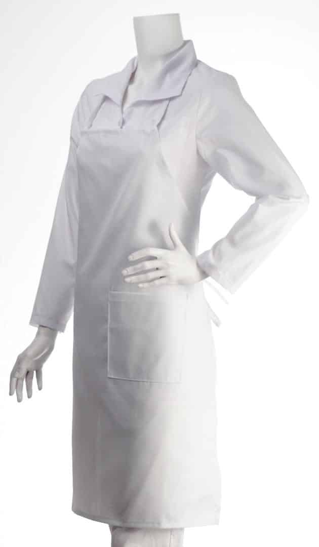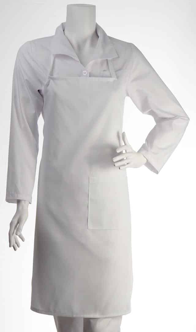 Престилка с връзка през врата, бяла на цвят. Снабдена е с голям джоб отпред и дълги връзки през кръста, чрез които широчината може да бъде регулирана. Леката материя на плата гарантира проветривост и комфорт на движенията. Лесно се почиства и изсъхва много бързо след пране. Този модел можем да изработим също така в черен и червен цвят, както и в шарка пепит. Предлагаме разнообразие от готварски престилки за своите клиенти. Разгледайте всичките ни модели от тук. Бихме могли да изработим престилки и в различни от показаните в сайта цветове, като цената ще се промени. Потърсете ни за справка.