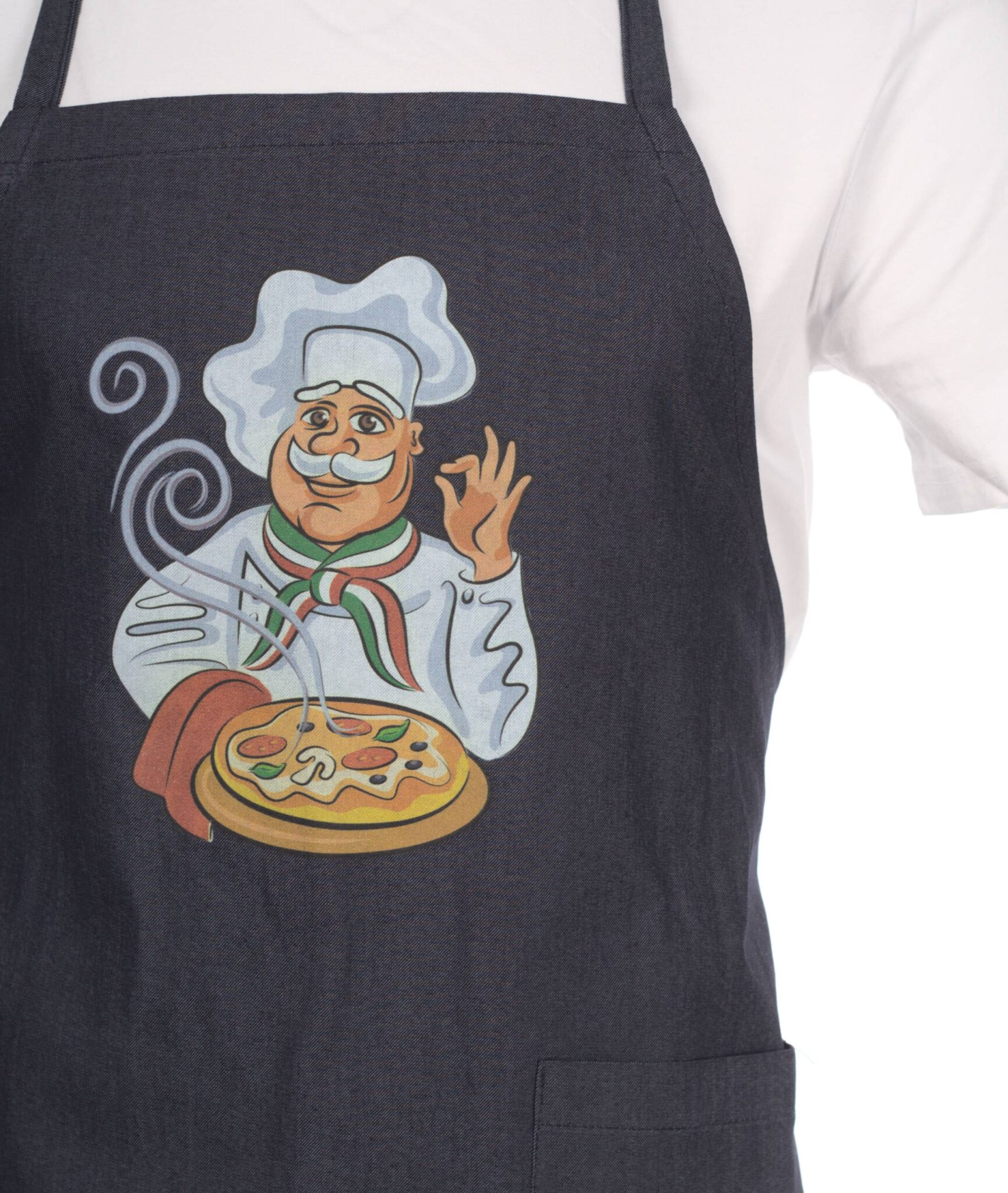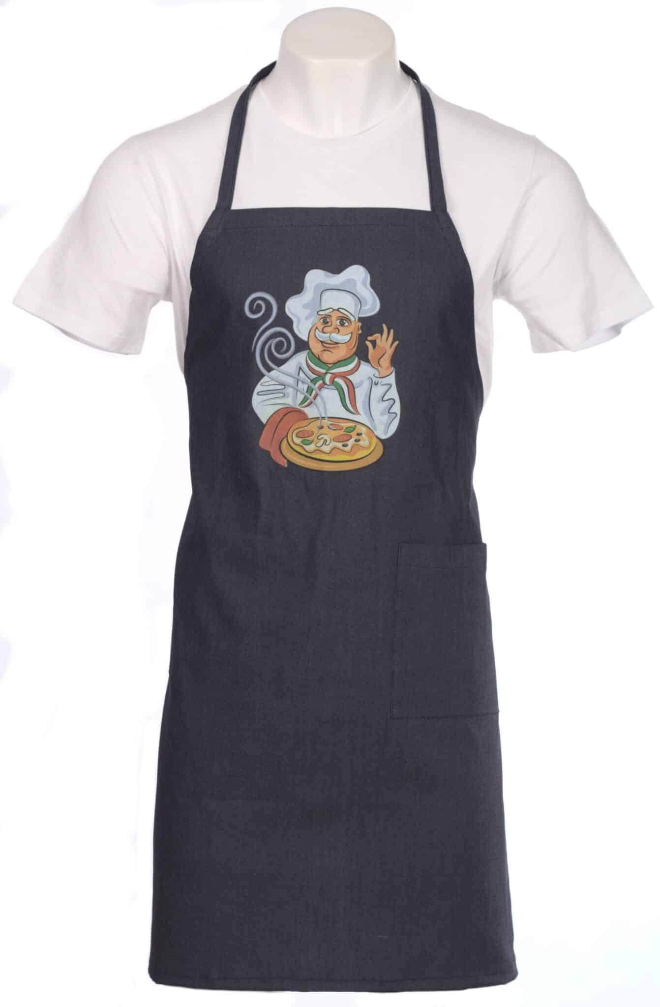 Престилка през врата дънкова с тематичен DTF печат за пицария. Моделът е унисекс с универсален размер. Престилката е изработена с два джоба отпред, съединени по средата. Широчината й може да се регулира с помощта на връзки на кръста. Печатът е изработен чрез DTF технология. Качеството на отпечатъка е изключително прецизно и фотореалистично. Тази технология позволява на ресторантите и хотелите да създадат персонализирани униформи за своя персонал, които да бъдат удобни, издръжливи и в същото време стилни. Престилка през врата дънкова – пицария, е един прекрасен завършващ елемент от работния екип на персонала.