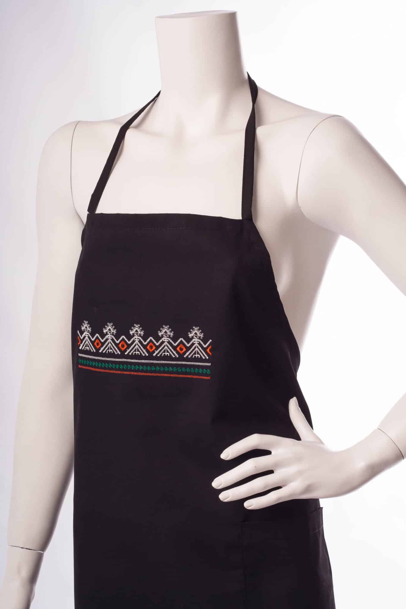 Престилка през врата черна на цвят с бродерия фолклорен мотив – шевица. Моделът има връзка през врата, голям джоб по средата и дълги връзки през кръста за регулиране на широчината. Еднакво подходяща е за мъже и за жени. Леката материя на плата гарантира проветривост и комфорт на движенията. Лесна е за почистване и изсъхва бързо след пране. Глади се без усилие. Престилка през врат – черна с шевица изработваме още в бял и в червен цвят. Бихме могли да изработим престилки и в различни от показаните в сайта цветове, като цената ще се промени. Потърсете ни за справка.