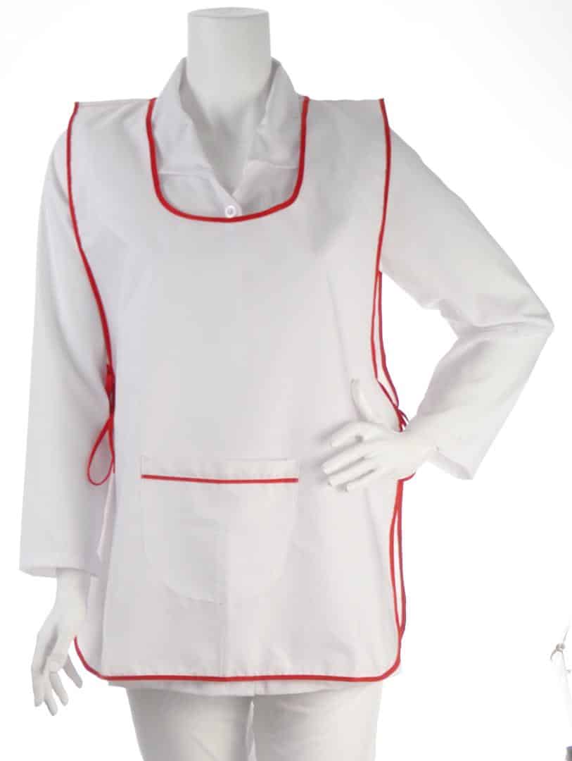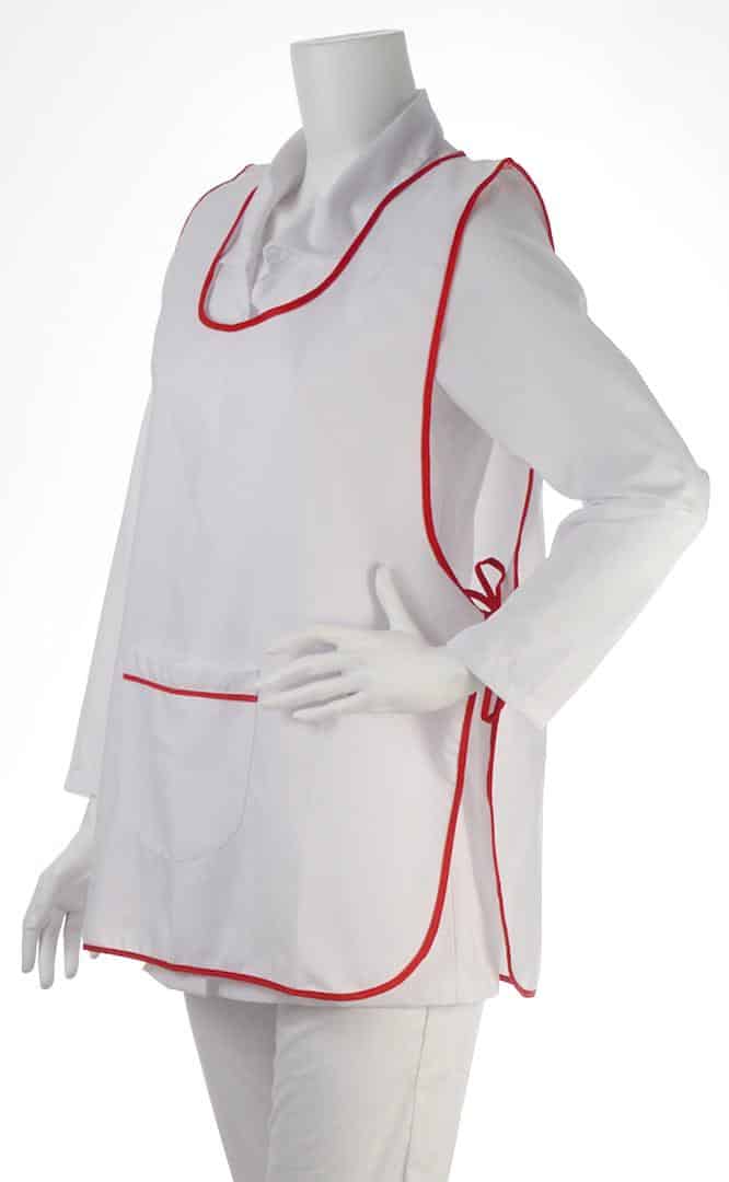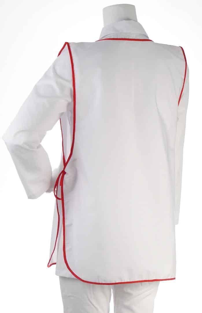 Престилка с връзки от страни бяла на цвят. Моделът има гръб и предница, снабден е с голям джоб отпред по средата. Връзките от двете страни дават възможност за регулиране на размера и го правят универсален. Моделът е подходящ за работа в кухня, складове, магазини, детски заведения и др. Материята на плата гарантира лесно пране и гладене. Тази престилка освен бяла можем да изработим в червен и черен цвят, както и в шарка пепит. Всичките ни предложения за готварски престилки можете да разгледате тук. Бихме могли да изработим престилки и в различни от показаните в сайта цветове, като цената ще се промени. Потърсете ни за справка.