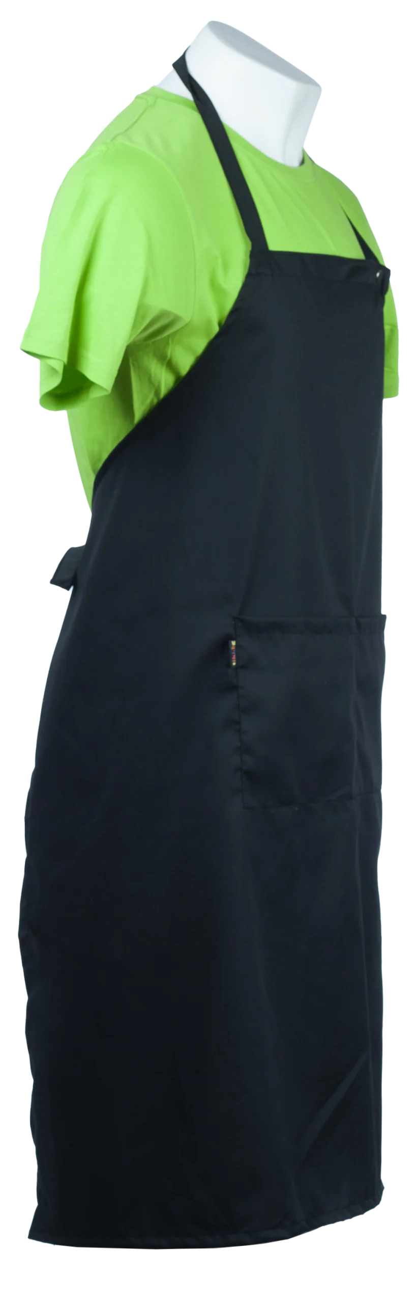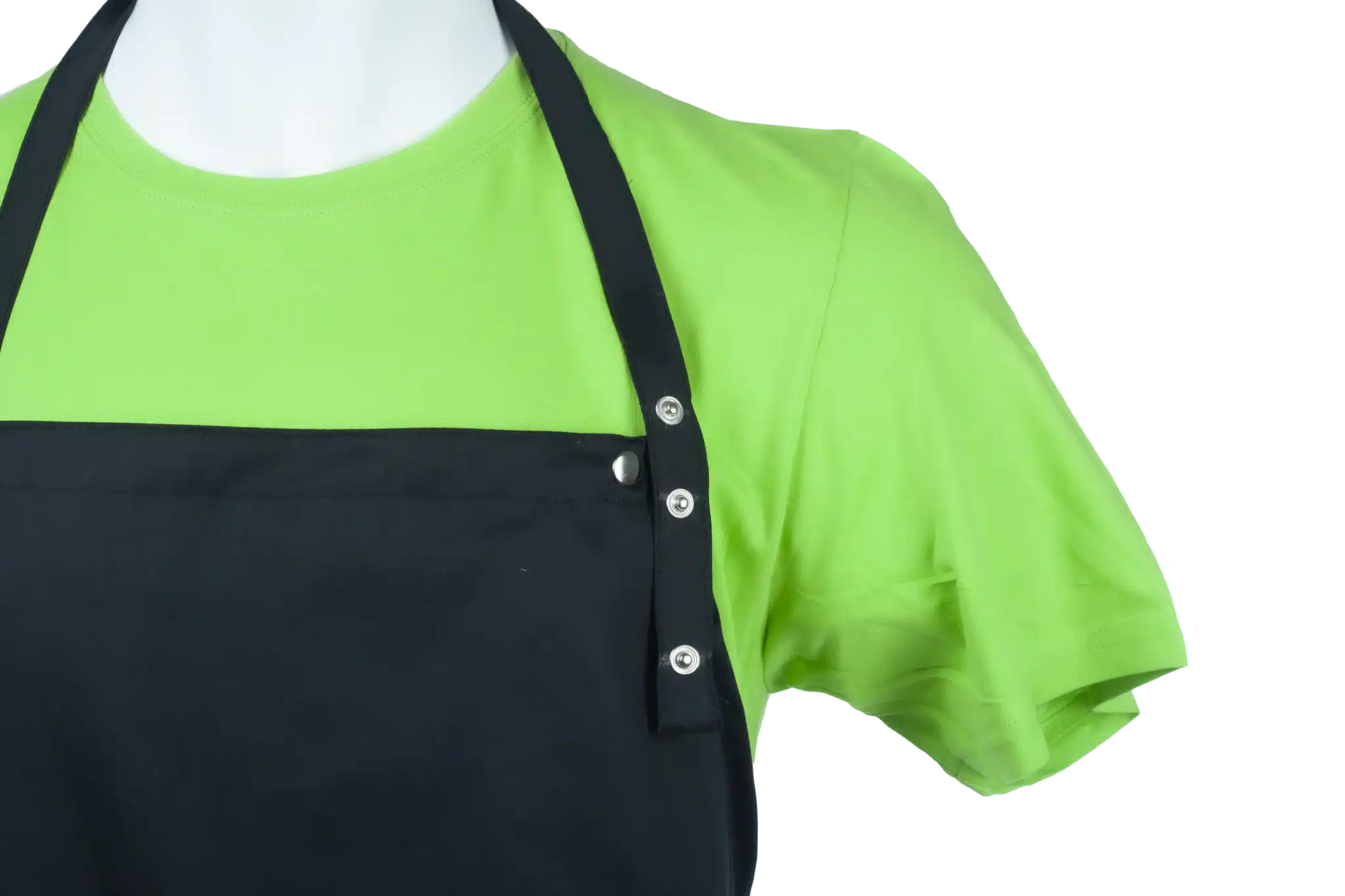 Черна готварска престилка през врат с тик-так копче. Престилката се предлага в два размера: 70х80 см и 95 х95 см. Изработена е от по-плътен черен плат – 160 гр./кв.м, има тик-так копче на врата, за по-голямо удобство и регулиране на дължината на презрамката. Готварската престилка има голям преден джоб, който е разделен на две равни части.  Търсите по-бюджетен вариант на престилка за кухненски работници? Вижте нашите изгодни престилки през врат в черно, бяло и червено. При нас може да поръчате и престилки с шевица, както и да добавите име на ресторант и готвач с бродерия.