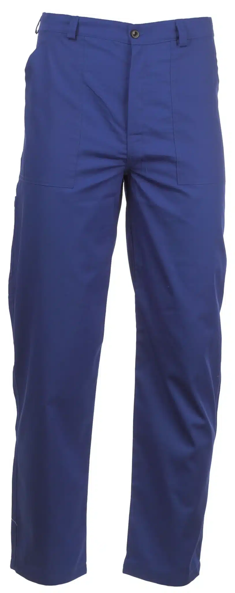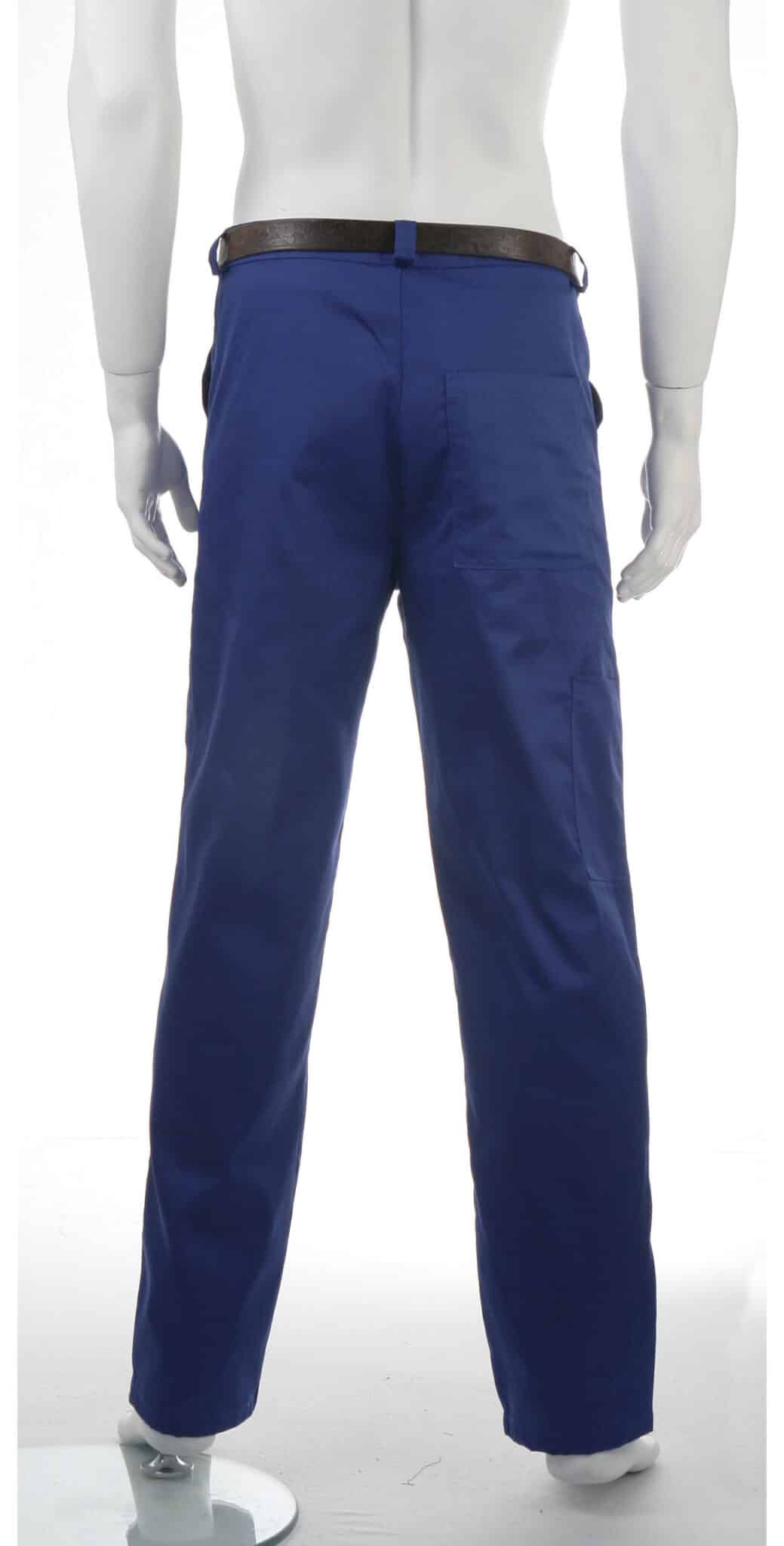 Работен мъжки панталон изработен от плат смес памук с полиестер в син цвят. Материята има голяма здравина и е лесна за пране и гладене. Има класическа кройка, два предни италиански джоба, един заден и един инструментален на крачола. Закопчаването е с копчета и гайки за колан. Предлагаме работен мъжки панталон в син цвят също и от плат 100% памук. Нюансът на синия цвят може да варира. Моля, консултирайте се с нас.