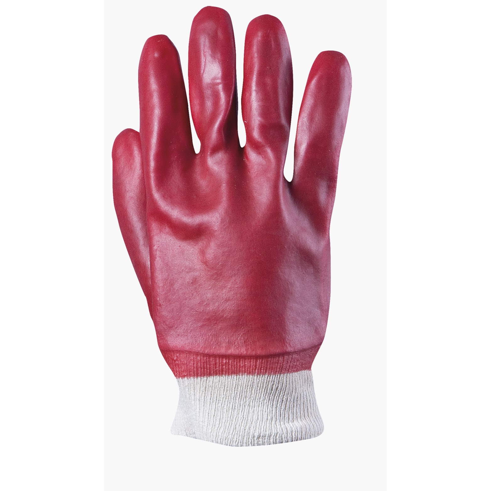 Работни ръкавици от категория маслоустойчиви с маншет. Изработени са от плетено безшевно трико, изцяло топени в PVC. Маншетът е ластичен. Този модел се предлага в червен цвят.