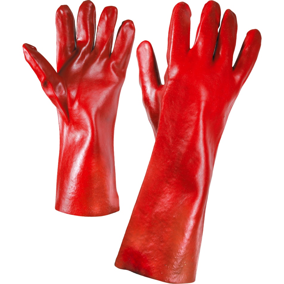 Работни ръкавици масло- и кисеилиноустойчиви – дълги червени. Изработени са от памучно трико и топени в ПВЦ. Дължината им е 40 см. Подходящи са при работа с агресивни вещества и течности. Поръчайте ръкавици масло- и киселиноустойчиви – дълги червени лесно оналйн на посочните в сайта телефони. Предлагаме изгодна доставка с куриери Спиди и Еконт. На ваше разположение сме при затруднения в избора на подходящите лични предпазни средства, или при нужда от друга информация за артикулите.