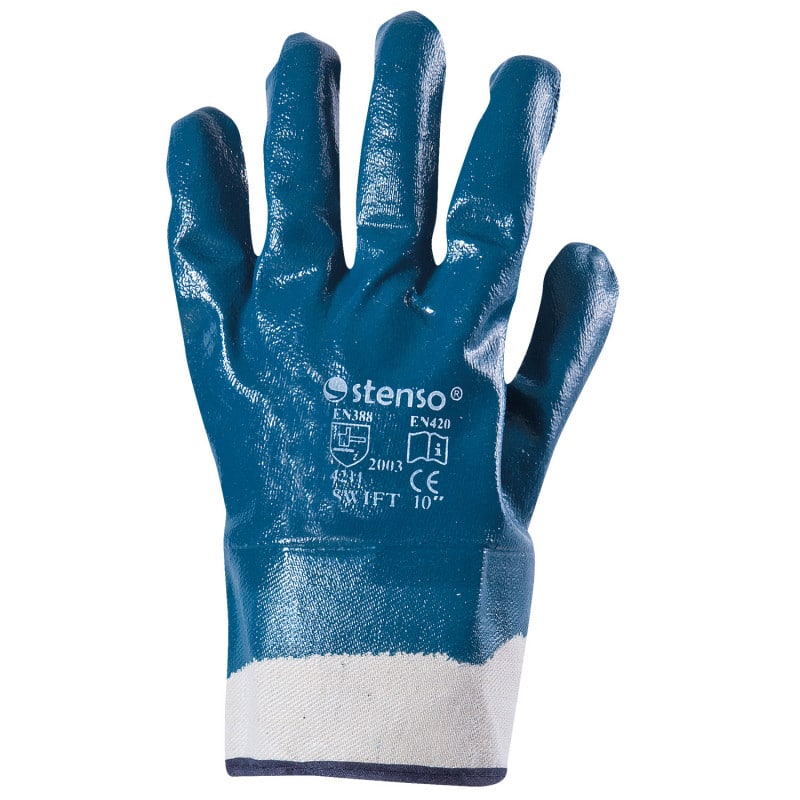 Работни ръкавици Суифт сини са от категория маслоустойчиви. Изработени са от памучно трико и са изцяло топени в латекс в син цвят.Ръкавици маслустойчиви Суифт – сини имат подсилен маншет. Предлагаме този модел само в размер 10 (XL).