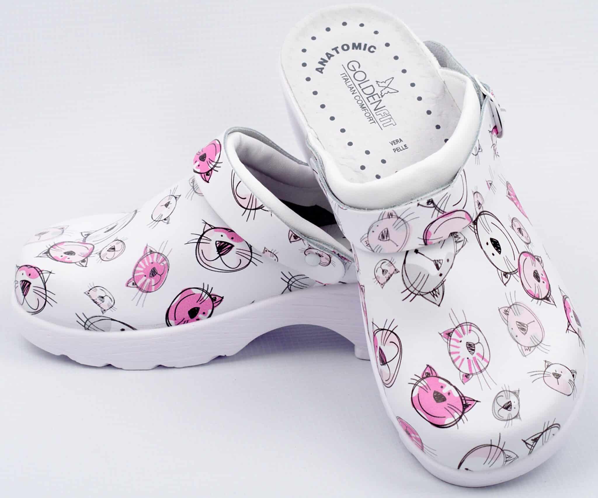 Сабо дамско Golden Fit от естествена кожа с каишка и анатомично антишоково ходило. Стелката също е изработена от естествена кожа. Сабото има лека анатомична платформа. Оригиналният принт с котета прави модела много симпатичен и атрактивен. Подметката е полиуретанова и е противохлъзгаща. Каишката е регулираща се. Дамско сабо с каишка е отлично допълнение към работната униформа на всеки тип медицински работник, служител в детско заведение, работник в кухня и много други. Моделът е перфектен и за лична употреба у дома.