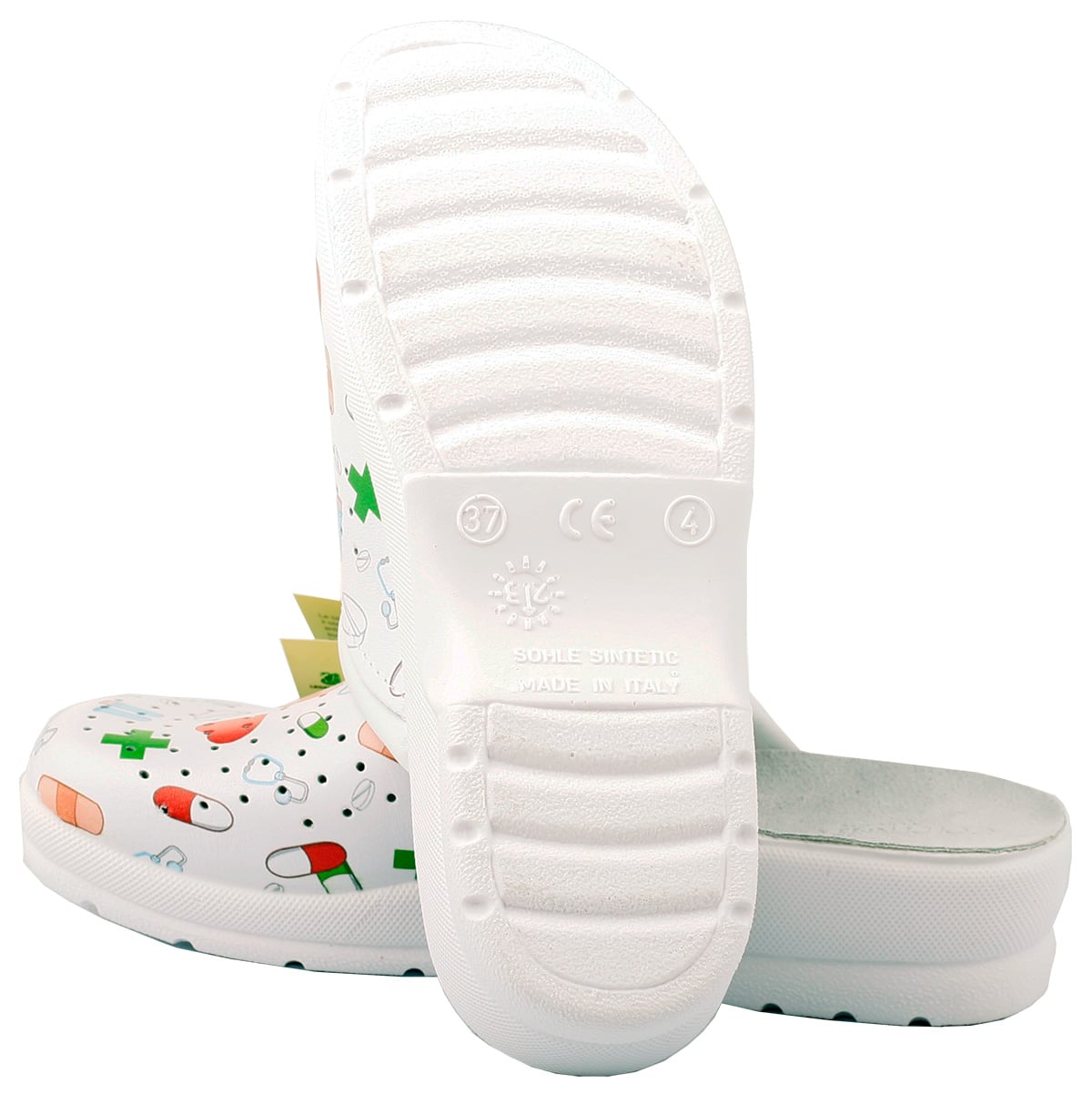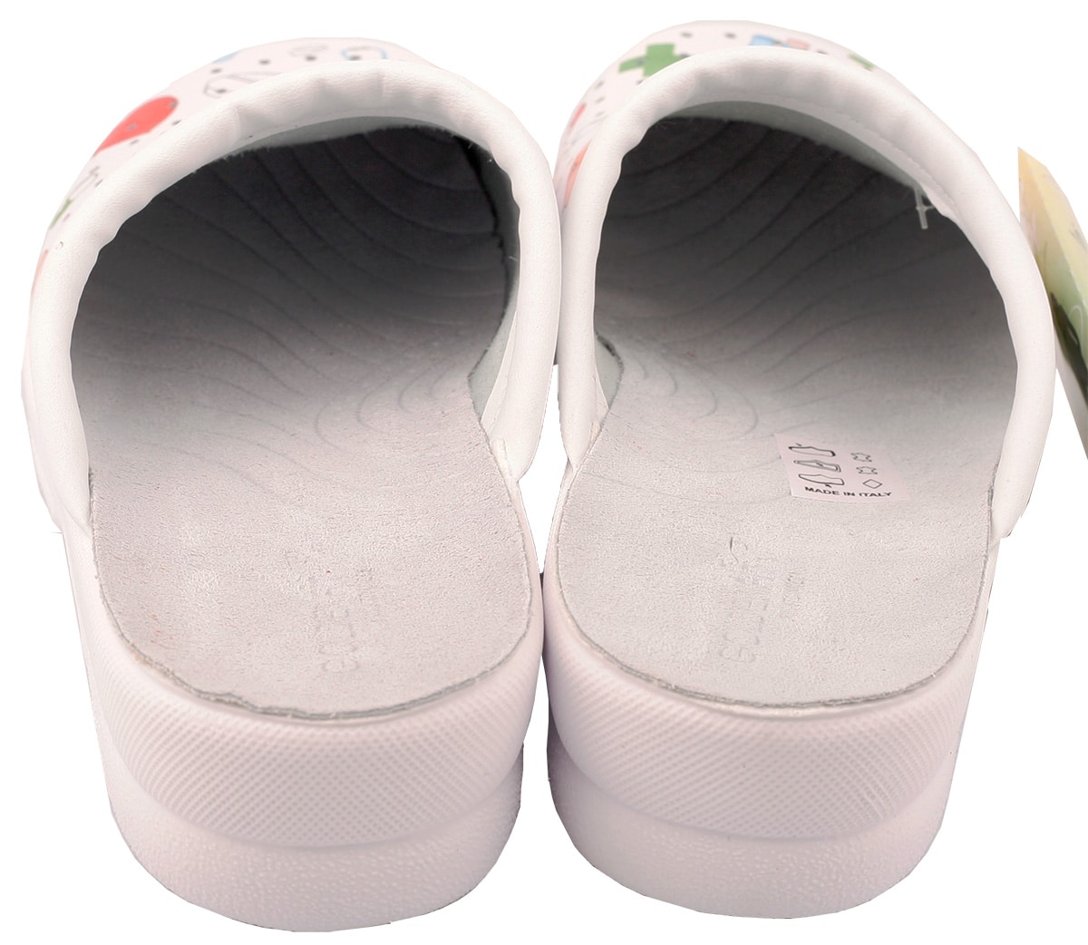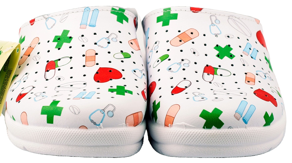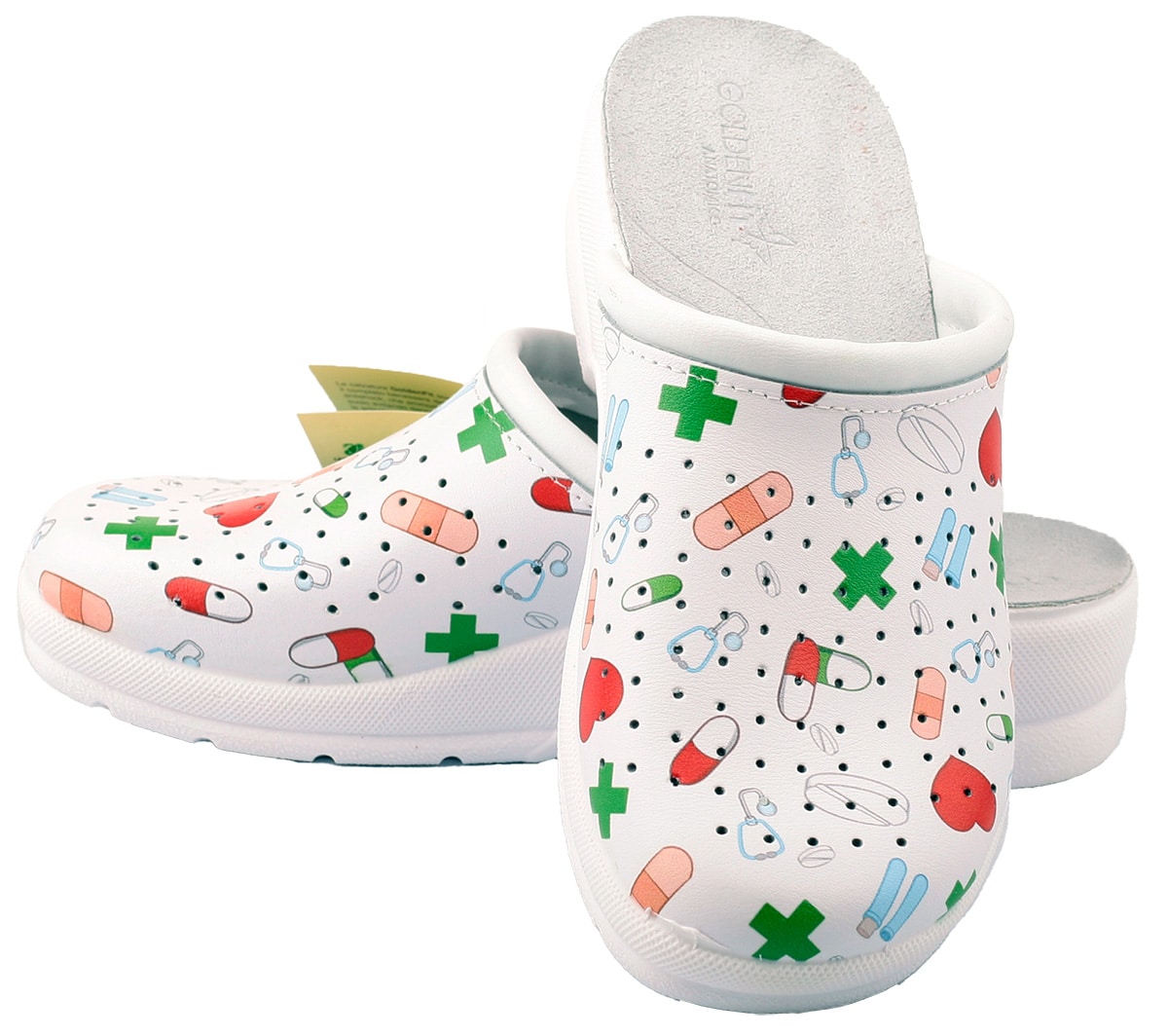 Дамско сабо GF Доктор е изработено от перфорирана естествена кожа с весел цветен принт на докторска тематика. Покрито е с полиуретан, който прави сабото издръжливо и устойчивона външни влияния.