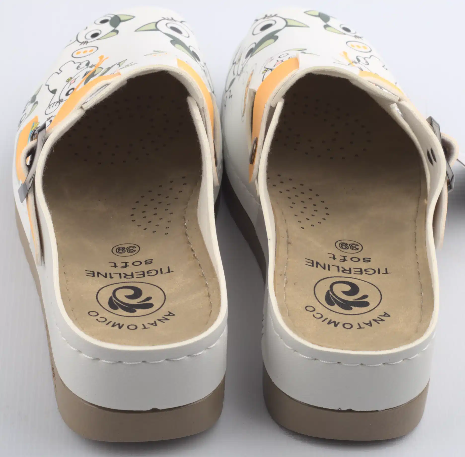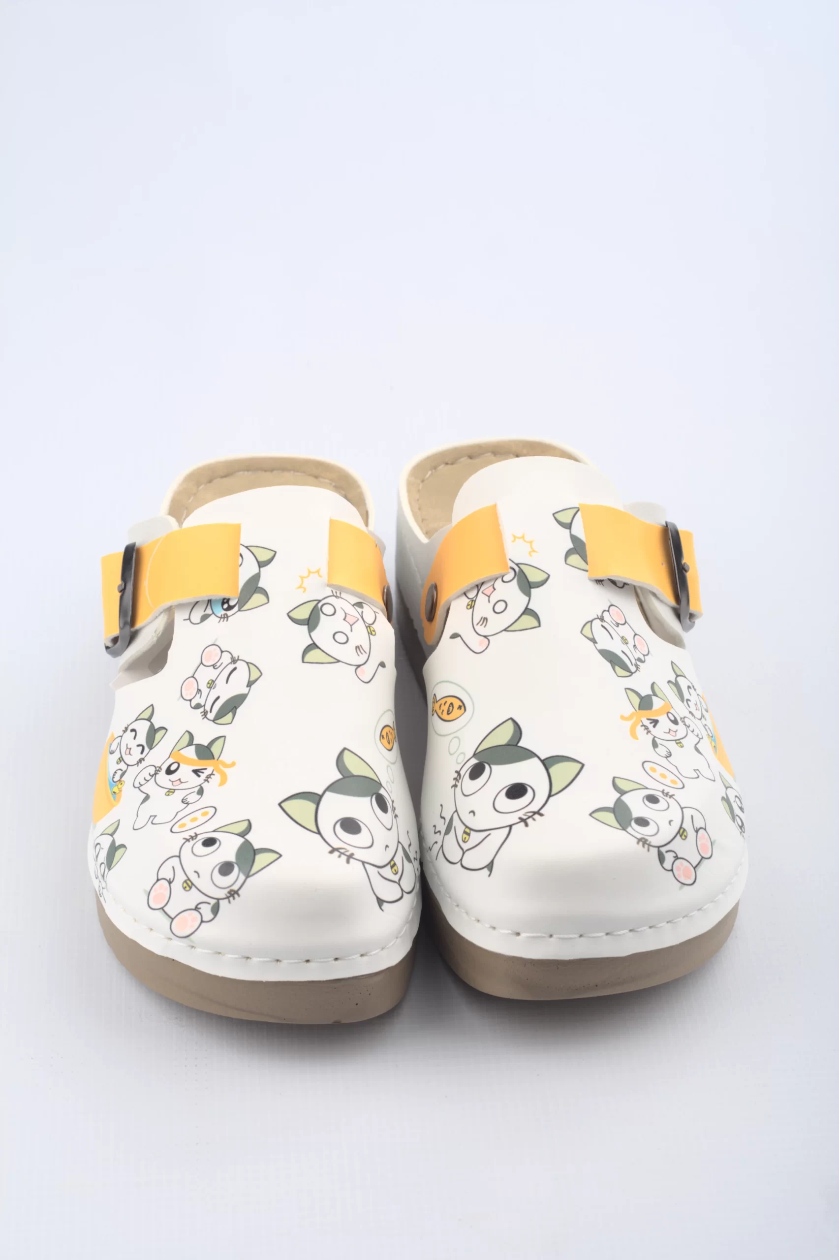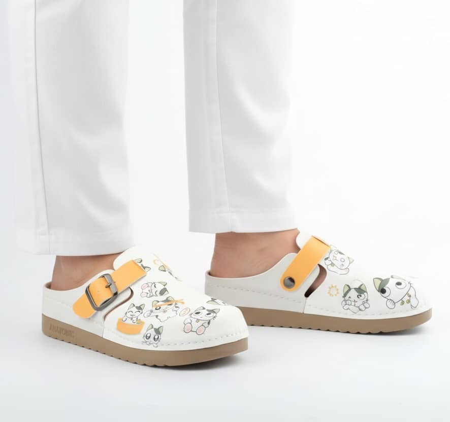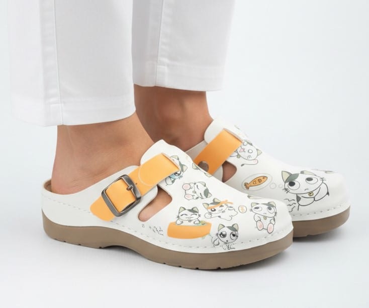 Сабо Yellow Kitty за удобно и приятно усещане при продължително стоене и ходене. Моделът е подходящ за медицински персонал, фармацевти, козметици, служители в спа центрове и персонал в детски градини. Дизайнът е цветен, весел и създава добро настроение през целия ден. Горната част е изработена от висококачествена еко кожа. Материалът се почиства лесно и запазва външния си вид дълго време. Подметката е мека и лека. Тя осигурява стабилност и добро сцепление дори при натоварено ежедневие. Анатомичната стелка поддържа стъпалото и намалява напрежението в краката. Каишката с катарама предоставя сигурност и добра фиксация при ходене. Моделът комбинира удобство, практичност и стил, което го прави предпочитан избор за различни работни среди. Декорацията с котенца и жълти акценти придава индивидуалност и свежест. Сабото се съчетава отлично с медицински туники, панталони и униформи в светли и пастелни цветове.