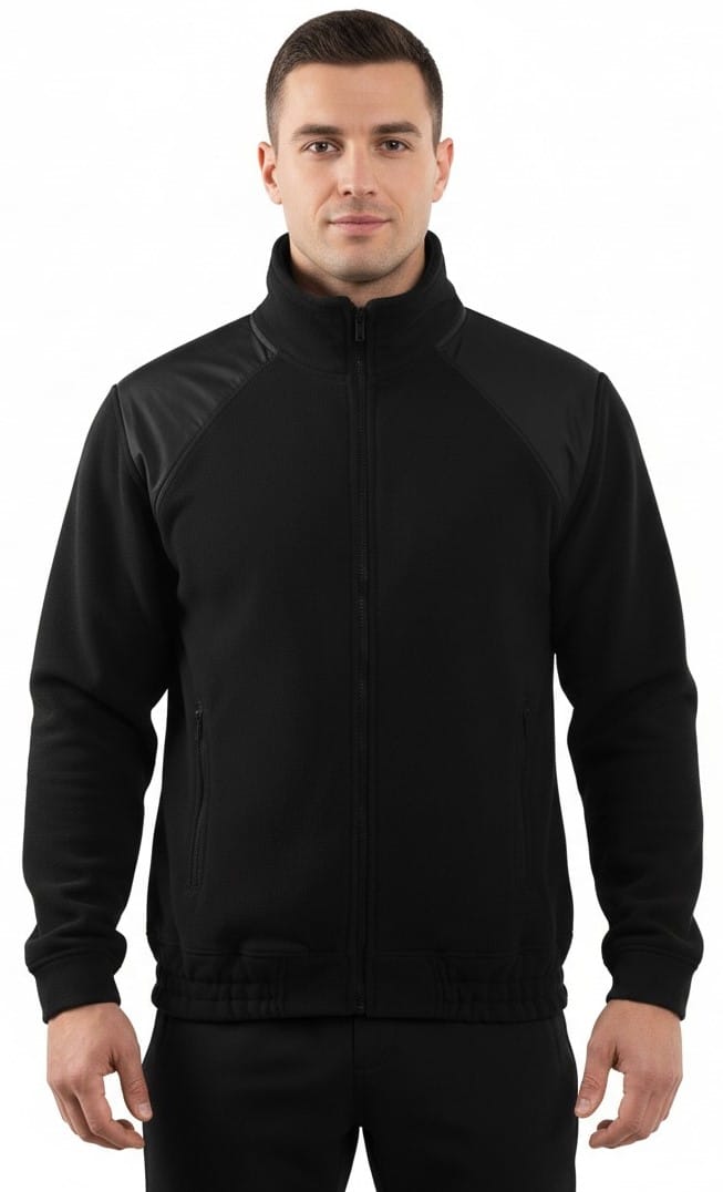 Изработен от плътен черен полар (100% полиестер, 360 г/м²) с антипилингова обработка, този топъл суичер осигурява отлична изолация от студа. Допълнителните рипстоп платки на раменете са с PU покритие. По този начин са устойчиви на влага и надраскване – практично решение за ежедневна употреба в динамична среда. Дизайнът включва цял преден цип, джобове с цип, вътрешна шал яка, маншети с велкро регулиране и ластичен подгъв. Тези елементи не само повишават функционалността, но и допринасят за професионалния външен вид.