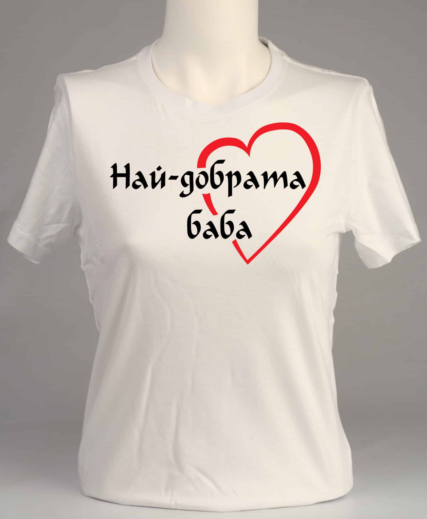 Тениска с дигитален печат „Най-добрата баба“. Уникален подарък за вашата баба. Може да избирате от размер S до размер 2XL. Зарадвайте любимата си баба с подарък от благодарност – персонална тениска. По желание можем да добавим името й срещу доплащане от 5,60 лв. Имате възможност и да поръчате тениската в цветен вариант на цена от 22,00 лв./бр. Всички десени на дамски тениски можете да разгледате тук. При нас имате възможност да поръчате и тениски Най-добрата майка и Най-добрият татко.