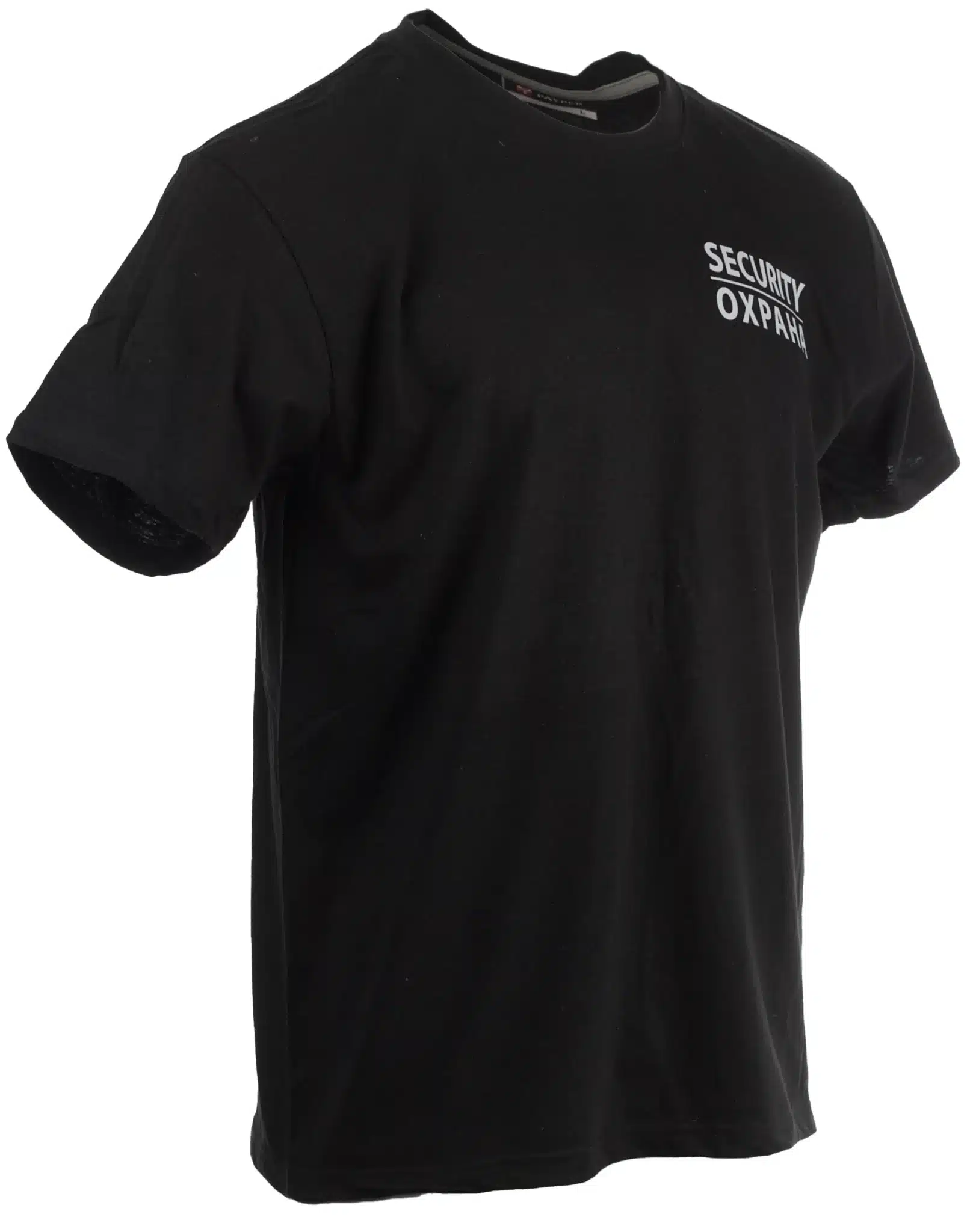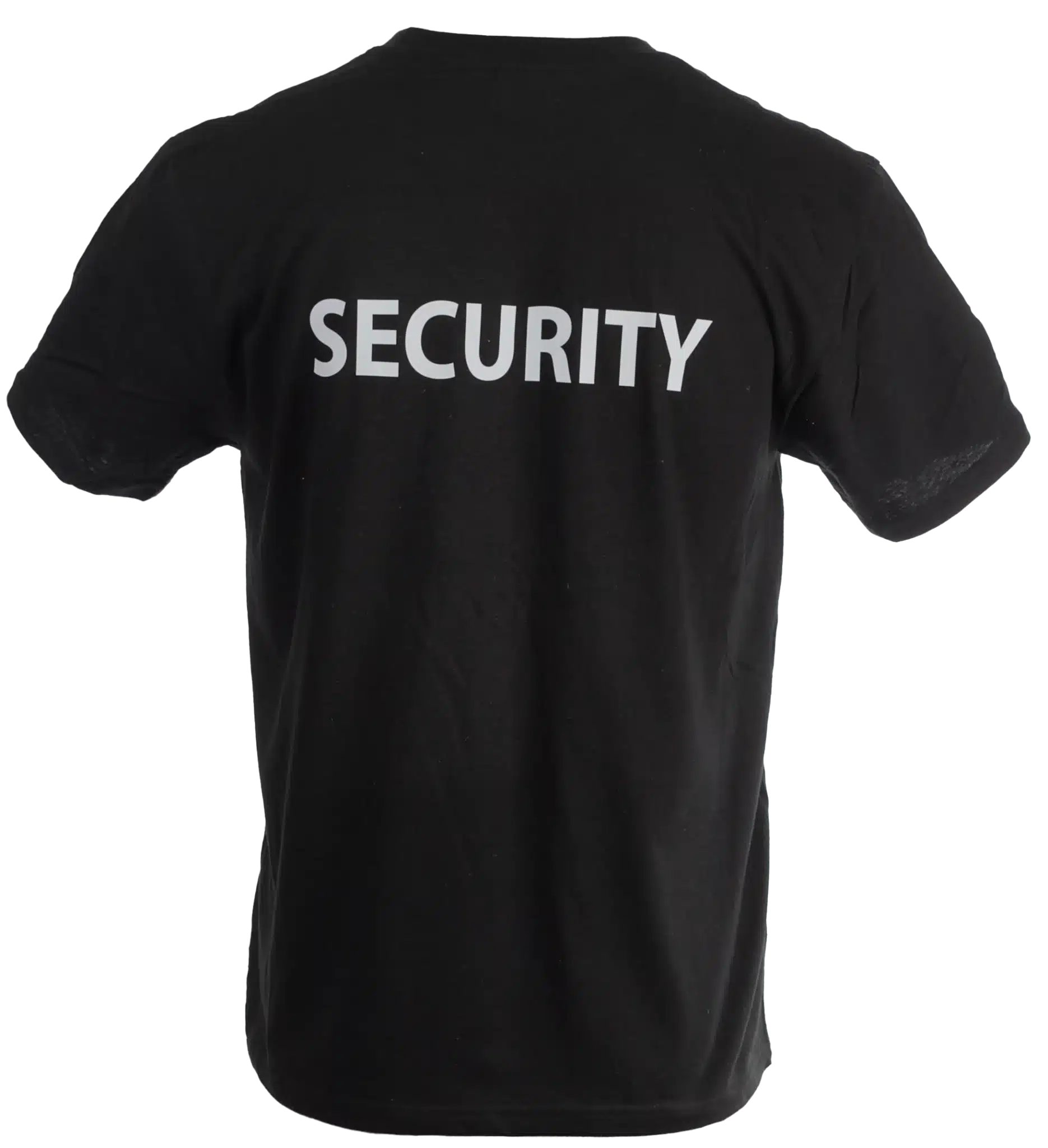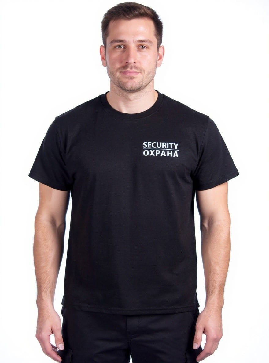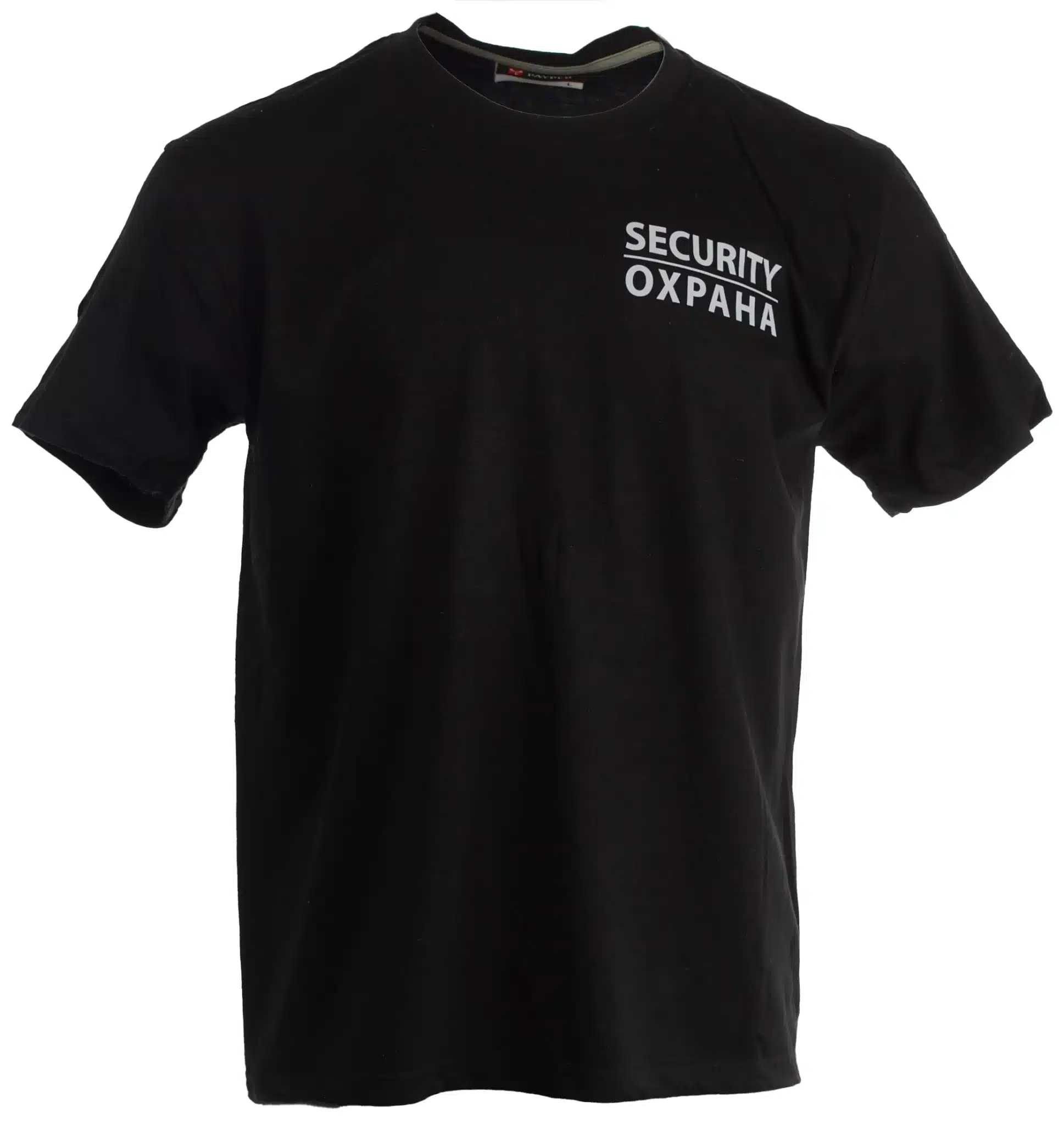 Тениска за охранители с надпис Охрана на два езика, изработен чрез технологията DTF. Тениската е със състав 100% памук. Изключително подходяща е за служители в охранителния сектор. Те са изработени от висококачествен памук, който е мек и удобен за носене, а надписът е изработен чрез бял DTF печат за по-добра видимост и дълготрайност. Тази технология предлага отлична устойчивост при пране и надраскване. Печатът е дигитален и като такъв, чрез него може да се постигне изключително прецизно фотореалистично качество.Отличната видимост на тениските с надпис „Охрана“ помага на хората да разпознават лесно охранителите и да знаят, към кого да се обърнат, ако има нужда. При нас можете също така да поръчате тениски с яка, върху които да добавим името на охранителната фирма чрез печат или компютърна бродерия. Предлагаме и брандиране на униформи за охранители с логото на охранителната фирма.