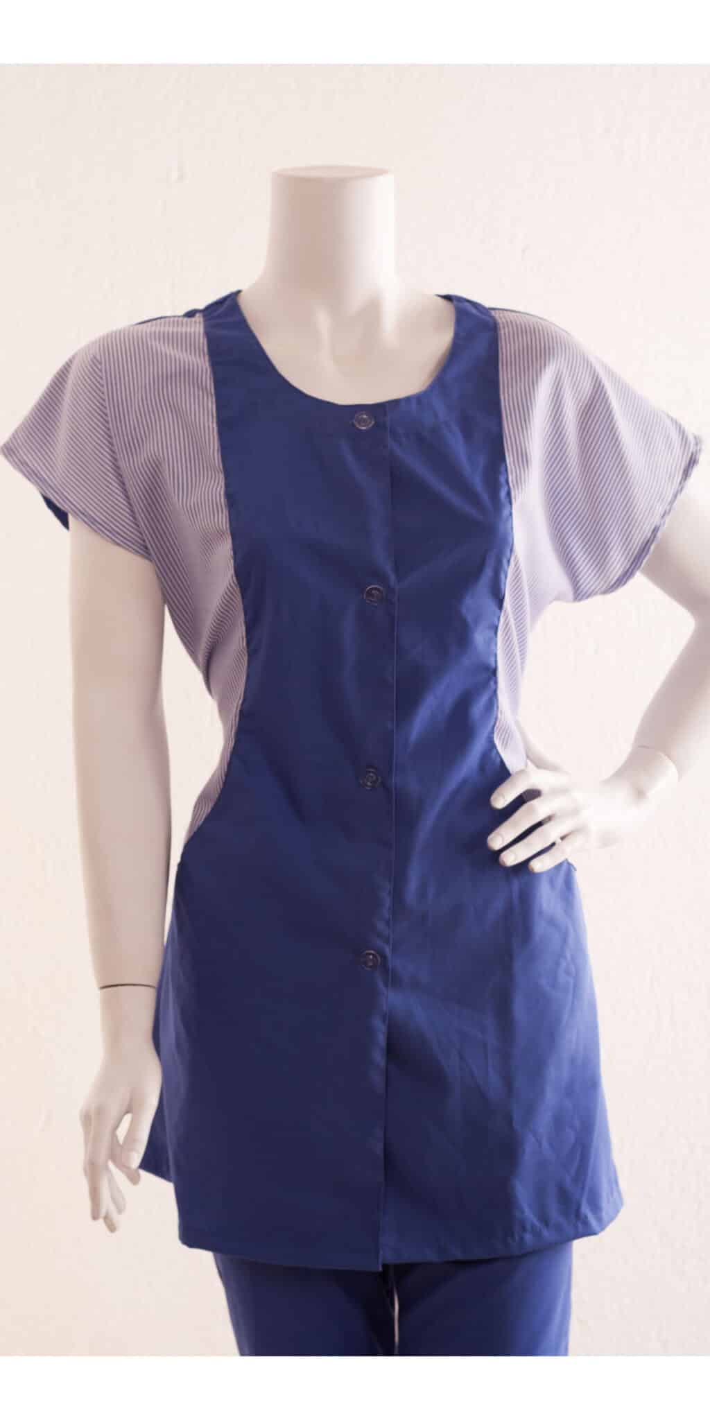 Туника Василка с вталена кройка, синьосива с райе и колан. Моделът е с изключително удобна кройка с паднал безшевен ръкав, неограничаващ движенията на ръката. Закопчавнето е отпред с копчета по средата. Разполага с два големи странични джоба и един горен джоб. Има колан на кръста. Туниката е подходяща униформа е за камериерки, саниратен персонал, персонал в производството, складове, или в детски заведения. Декоративните елементи на този модел могат да бъдат в каре, или райе, според наличността на плат в производствения отдел!