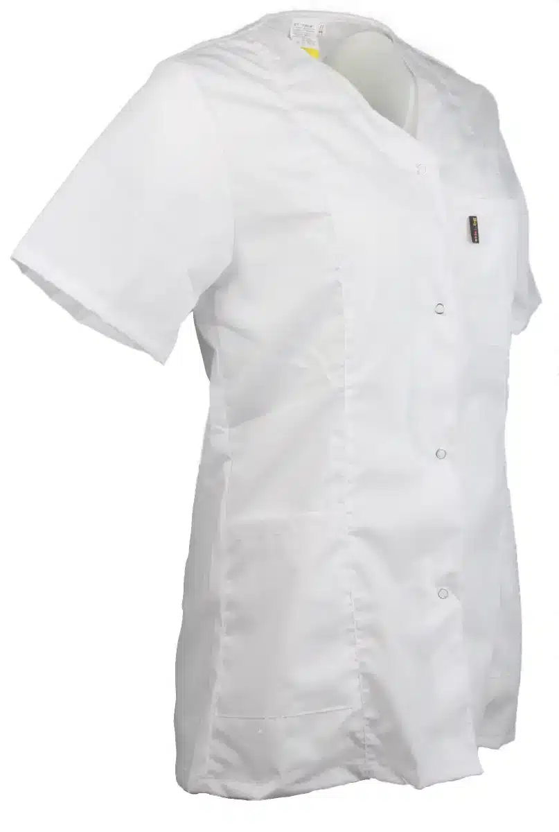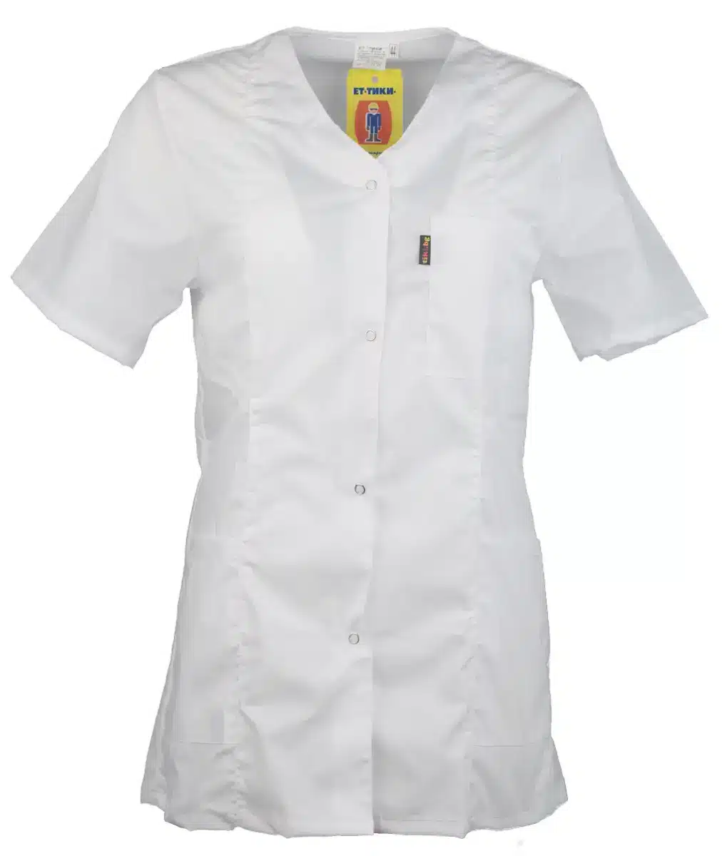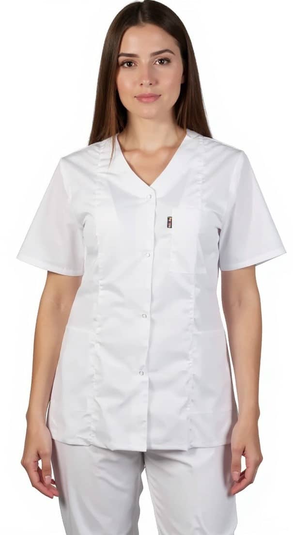 Дамска работна туника с къс ръкав и закопчаване с тик-так копчета. Избрали сме класическа елегантна кройка, която е предпочитана от дамите, за да ви осигурим удобство. Предлагаме ви висококачествено медицинско облекло за комфорт в работното ежедневие. Този модел дамска туника има копчета тик-так за по-лесно събличане и обличане на работната униформа. Стараем се да предлагаме на своите клинети функционалност и по този начин да облекчим работния ви ден. Тази туника е отличен избор за всяка дама работеща в медицинско заведение, в медицинска лаборатория, както и за студенти по медицина. Подходяща е също така за козметички, фризьорки и масажистки. Може да разгледате и останалите ни предложения за медицински туники и да поръчате лесно от електронния ни магазин. За завършена медицинска униформа може да разгледате също медицинските панталони и медицинско сабо.
