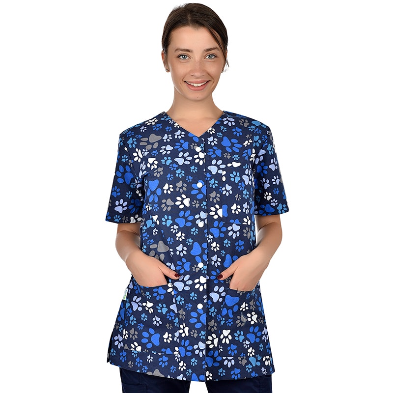 Туника Карина с цветен принт лапи в сини тонове. Туниката е с къс ръкав и тик-так закопчаване. Има прав силует и свободна кройка. Острото и деколте и късият ръкав допринасят за стилна и модерна визия. Туниката има три джоба: горен малък джоб и два долни дълбоки джоба. Съставът и е 50% памук, 50% ПЕ. Туниката е от дишаща материя с еластан и 3D Flex технология за максимален комфорт по време на работа. Приложена технология CL 40°C за запазване на цвета при машинно и ръчно пране. Туника Карина с принт лапи е изключително подходяща за ветеринари и студенти по ветеринарна медицина. Забавният и принт я прави приложима и за персонал в детски градини и ясли, както и за стоматолози и лекари работещи с деца.
