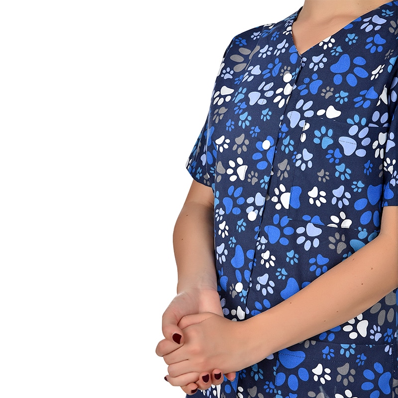 Комбинирайте своята туника с цветен принт лапи с изчистен медицински панталон в тъмносин цвят. Разгледайте и останалите ни предлпожения за медицинско облекло за ветеринари в нашият сайт или във физическите ни магазини.