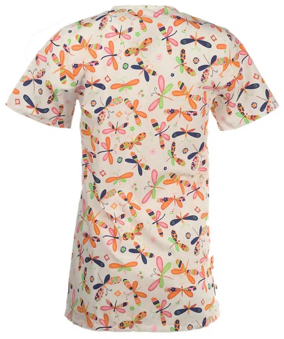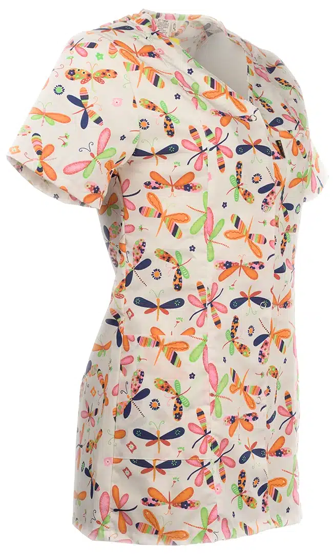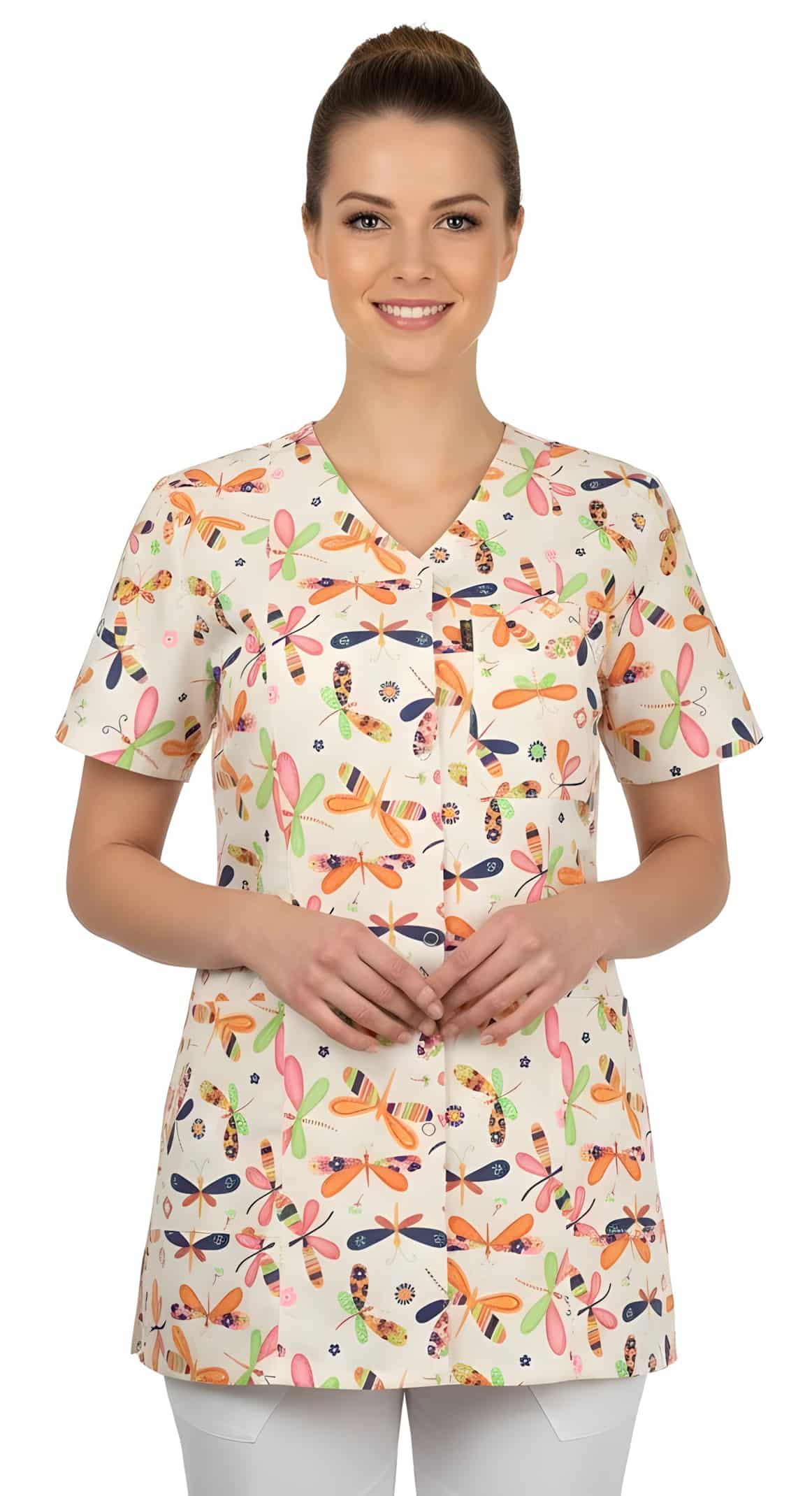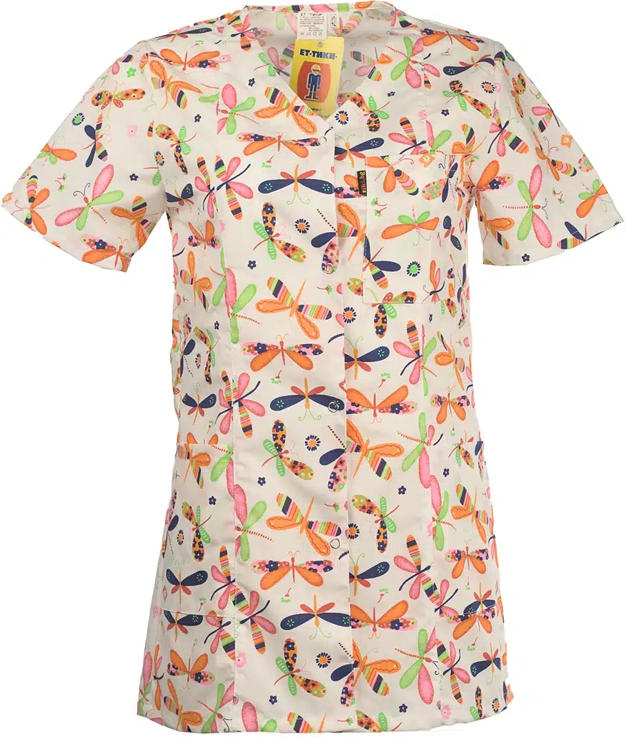 Туника пеперудка с тик – так копчета в многоцветна щампа. Моделът разполага с остро деколте и три джоба за по-голямо удобство. Този артикул е чудесно предложение за работна униформа на медицински работници, персонал в детски заведения, в сферата на фармацевтиката и други. Туника пеперудка с тик – так копчета може да намерите в магазините на Тики в страната и онлайн в размери от 40 до 64. Гарантирано отлично качество от български производител.