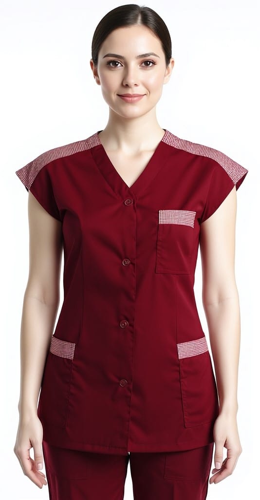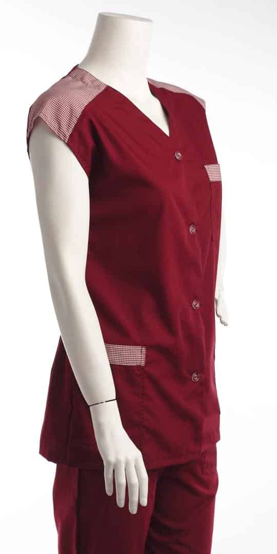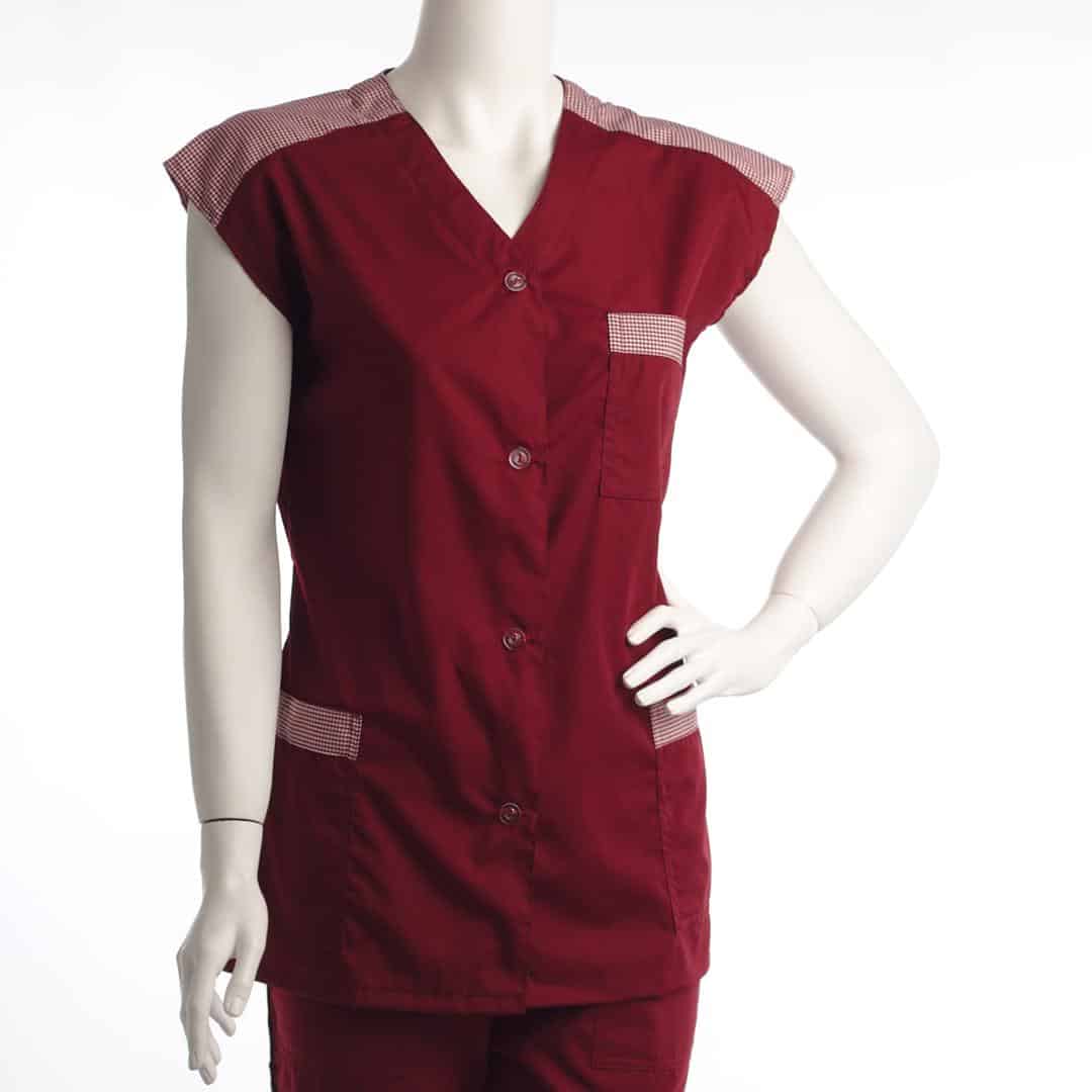 Туника с колан – бордо с копчета и три джоба. Изработена е с вталена кройка и с паднал безшевен ръкав за повече комфорт. Закопчаването е отпред с копчета по средата, има два големи странични джоба и един горен джоб. Подходяща е при работа по хигиена и почистване, отлична е за персонал в производството, складове, в детски заведения и др. Декоративните елементи на туника с колан в бордо могат да бъдат в каре, или райе, според наличността на плат в производствения отдел!