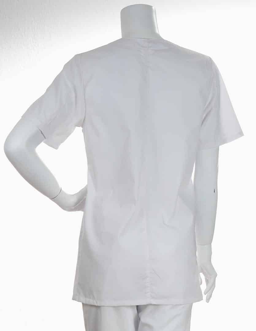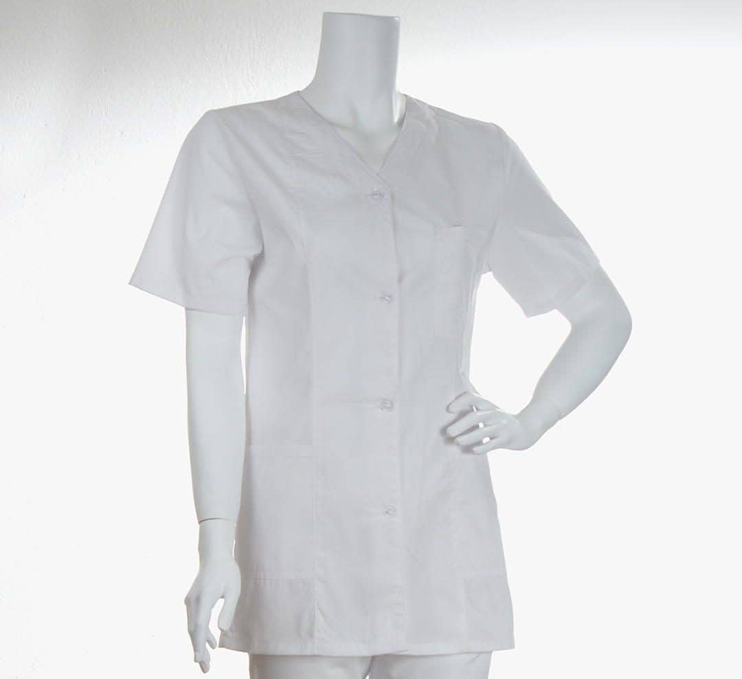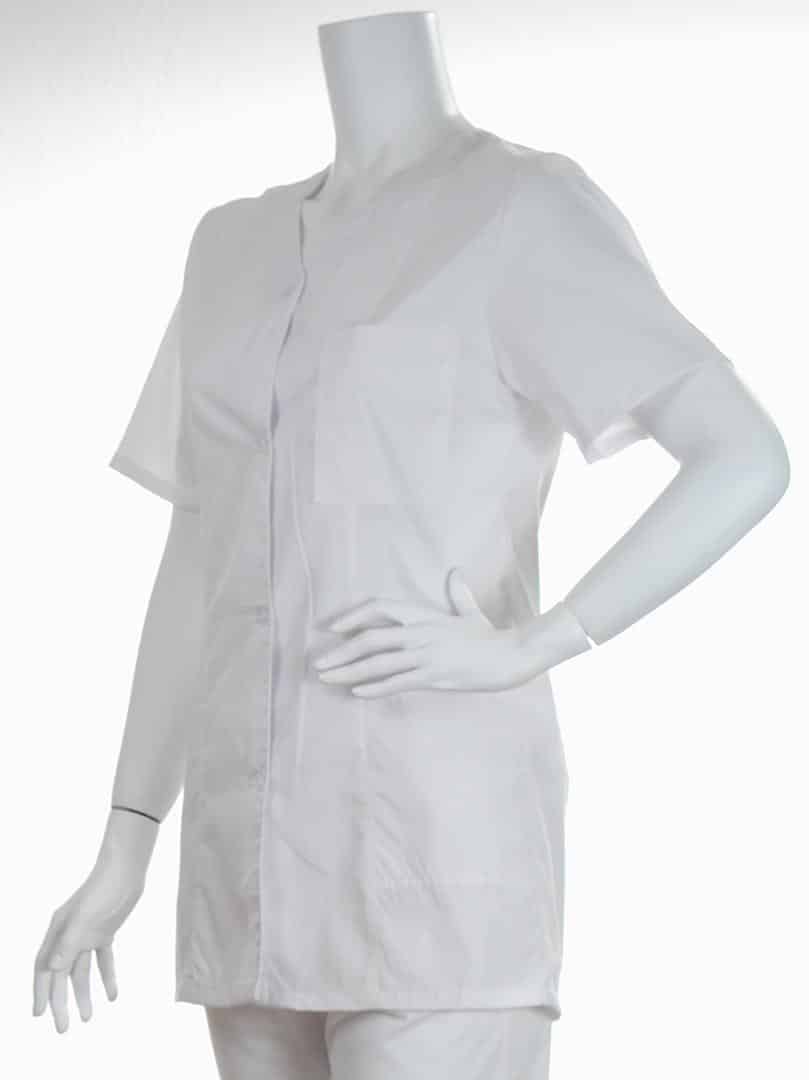 Туника с копчета бяла на цвят. Дизайнът е с елегантна леко вталена кройка, с къс ръкав и закопчаване отпред по средата. Моделът е с изчистено деколте. Има два удобни странични джоба , прикачени към страничните шевове и един отляво горе. Туника с копчета бяла, е подходяща за персонал в търговски обекти, складове, кухни, хотели, фризьори и производсто. Също така е често предпочитана от медициснки работници, лаборанти и хигиенисти. Леката материя гарантира добра проветривост, лесно пране, гладене и бързо съхнене. За завършена работна униформа разгледайте всичките ни предложения за панталони унисекс.