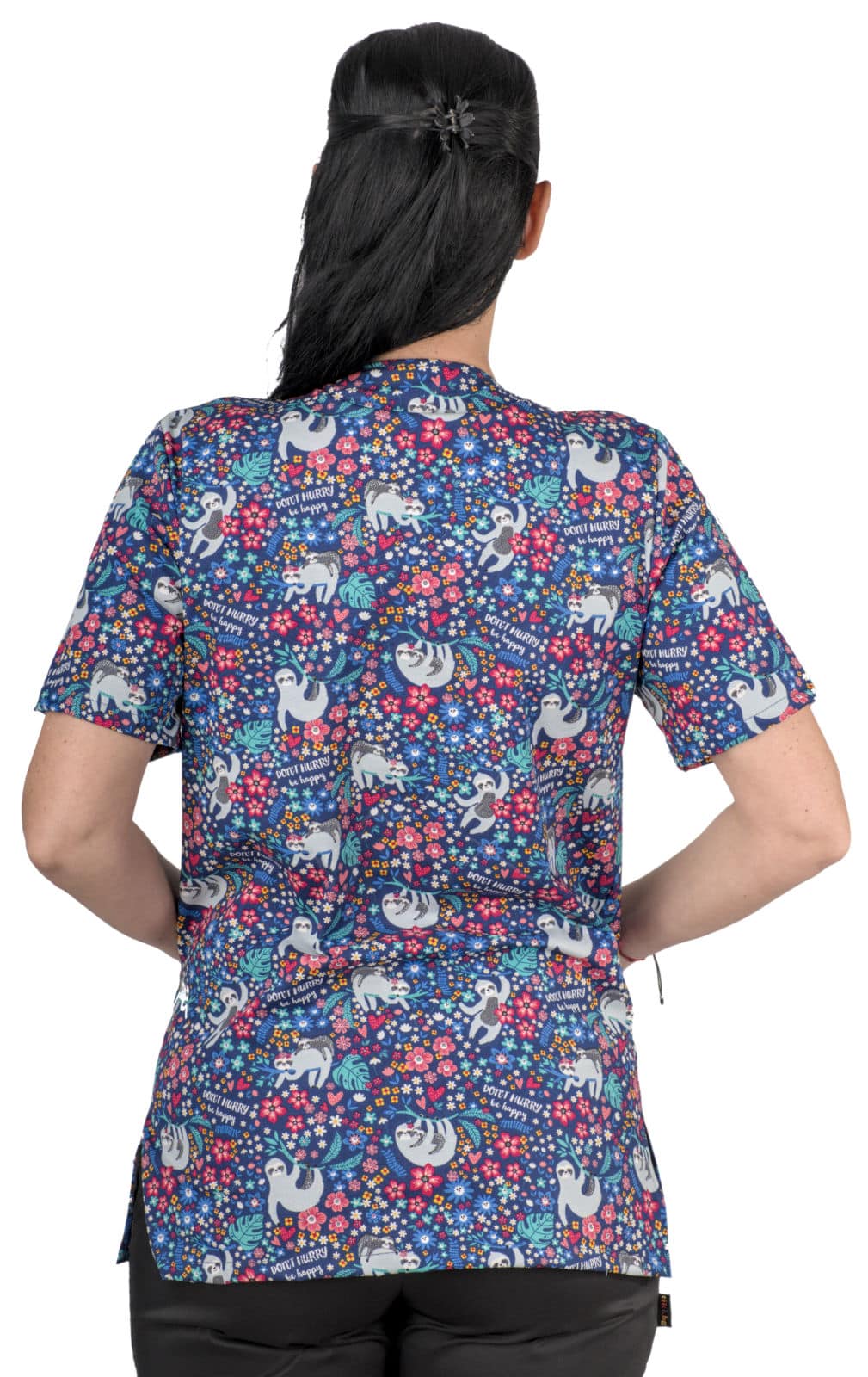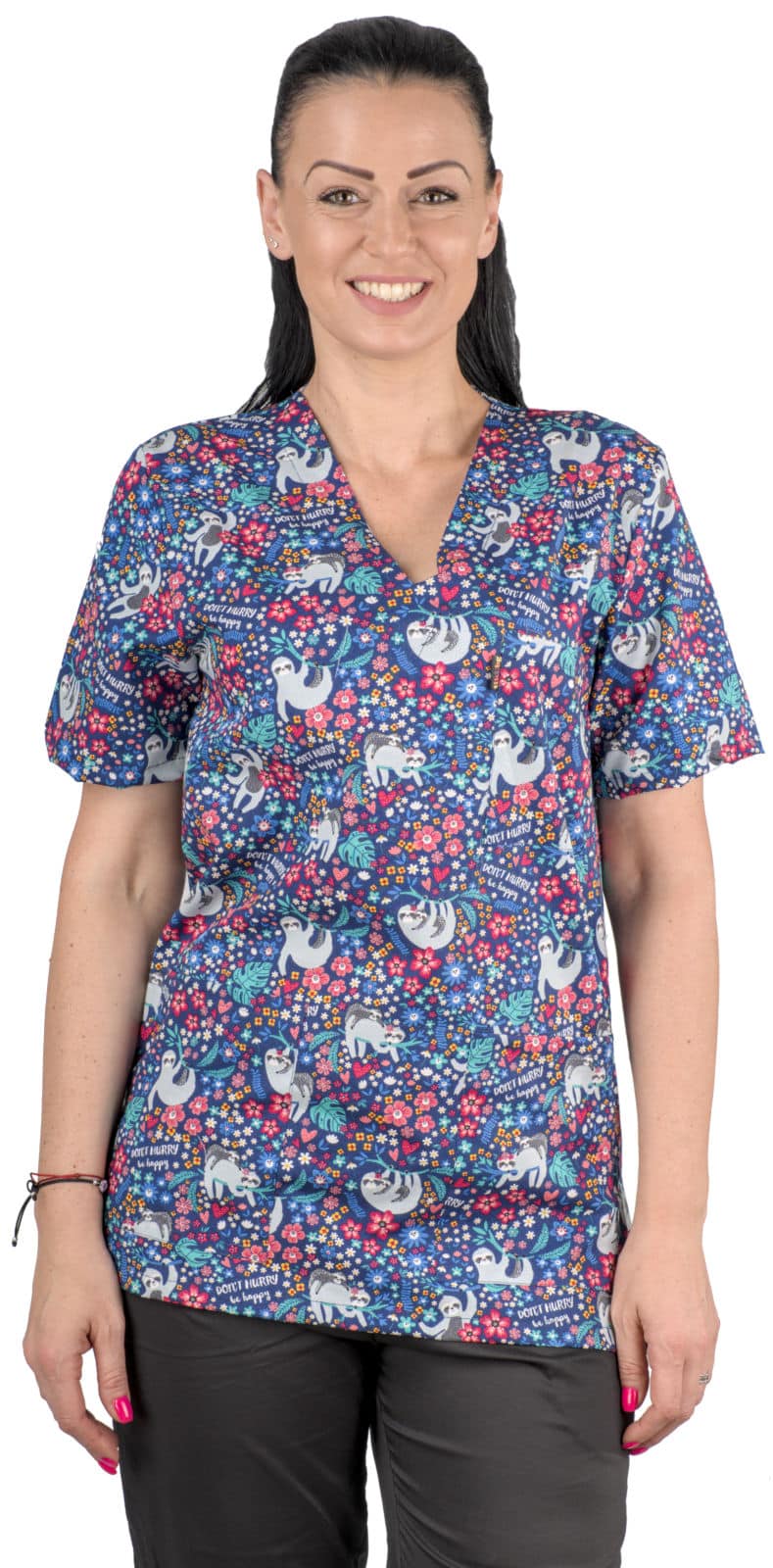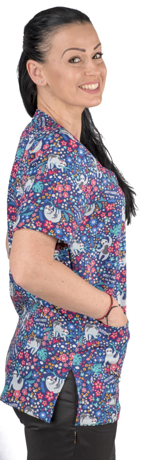 Туника унисекс – ленивци е свежо и забавно допълнение към професионалното облекло. Моделът радва с щампата Don’t hurry, be happy – Не бързай, бъди щастлив – послание, което носи усмивки в натоварения ви ден. Изработена е от лека и дишаща материя – 97% памук и 3% еластан, с плътност 140 г/м². Платът е мек и еластичен, осигурява комфорт през целия ден. Материята е устойчива на многократно пране и запазва яркостта на цветовете дълго време. Туниката е с къс ръкав, което я прави подходяща за динамична среда. Разполага с три функционални джоба – един на гърдите и два в долната част. Деколтето е остро, V-образно, а кройката е права и свободна, осигуряваща максимална свобода на движение и удобство.