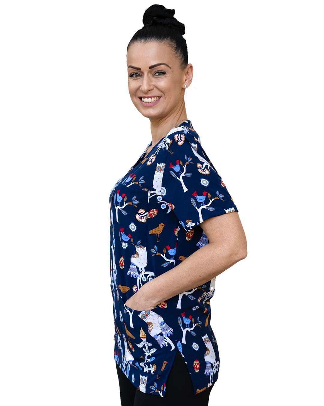 Дизайнът е свеж – тъмносиня основа с пъстри птички и цветни клончета, за позитивно настроение и свеж външен вид. Туниката има три функционални джоба – един на гърдите и два в долната част. Удобни за съхранение на инструменти и лични вещи по време на работа. Кройката е свободна с остро деколте и къс ръкав.