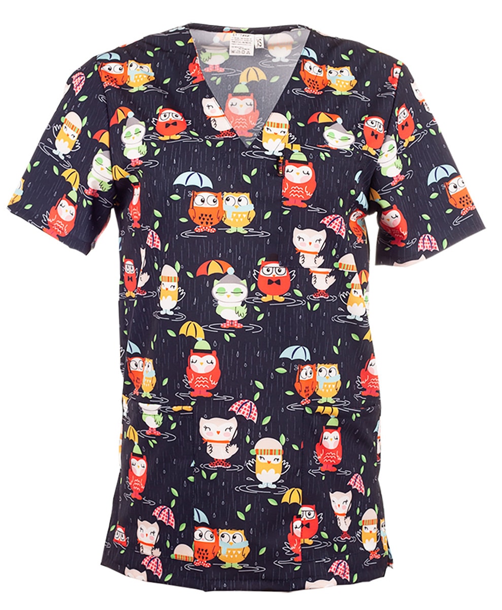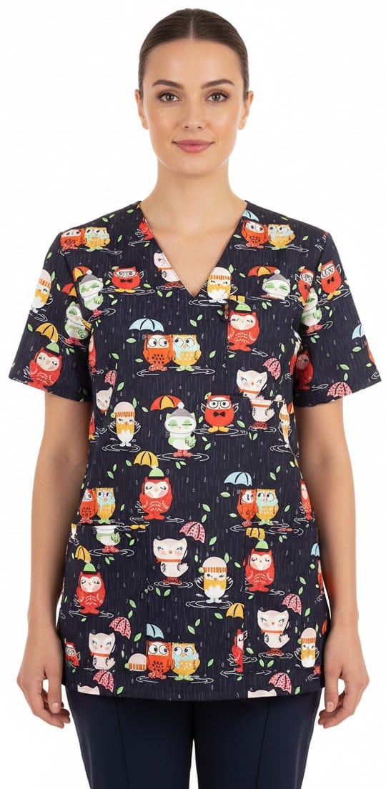 • Весела Щампа Бухалчета: Нестандартният дизайн с щампа на Бухалчета, придава на туниката уникален и весел вид. Подходяща не само за медицински работници в детските отделения, но и за персонал в детски заведения, фризьорски салони, кухни и други.