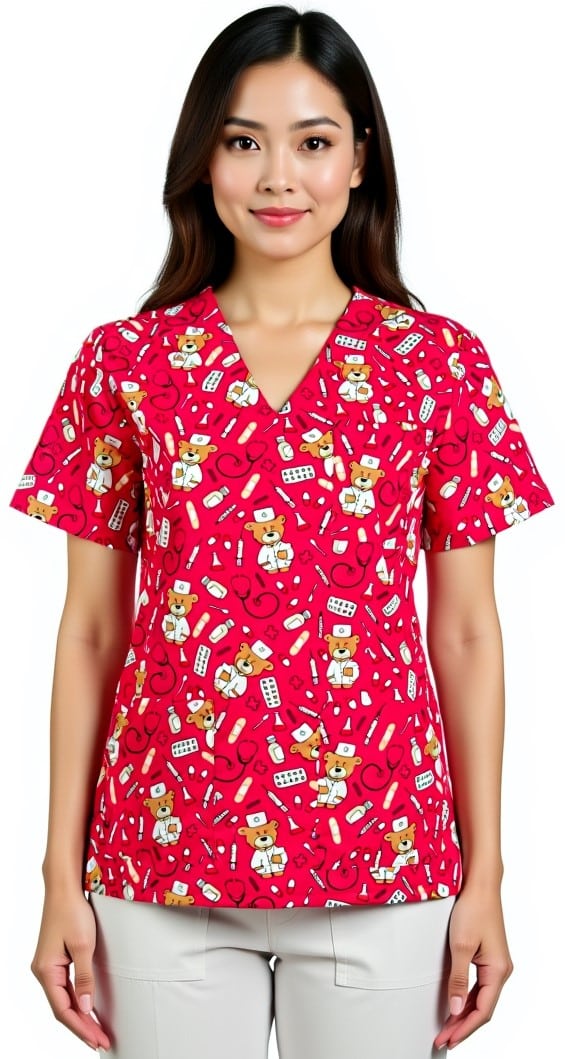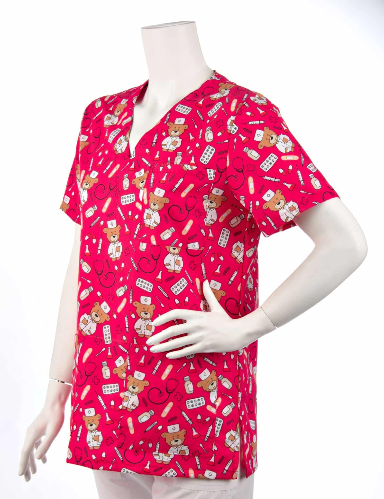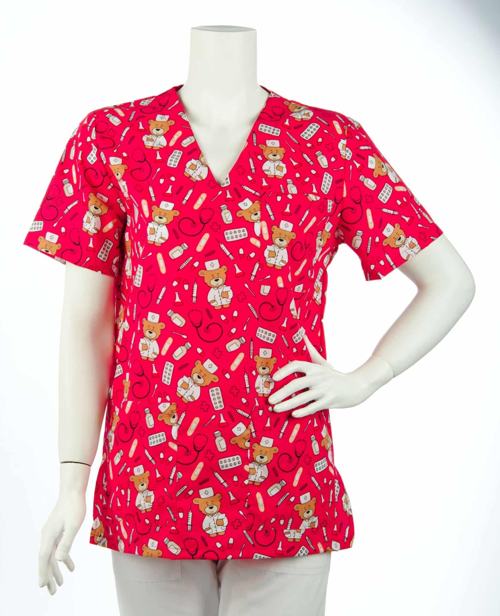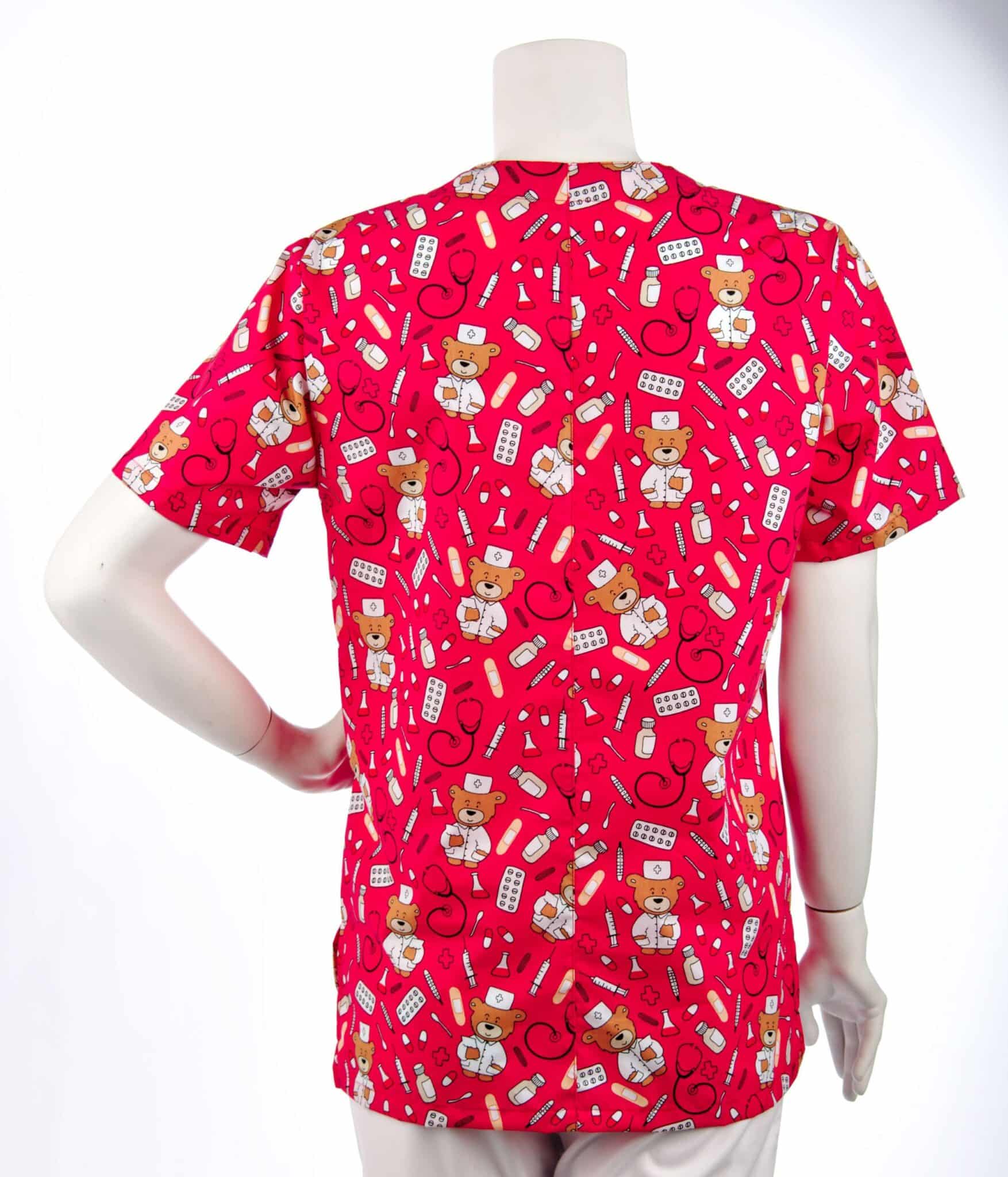 Оригинален модел медицинска туника унисекс с щампа Доктор Мечо. Унисекс модел, предназначен както за мъже, така и за жени, и предлага удобство и индивидуално излъчване по време на работния ви ден. Моделът е с къс ръкав, V-образно деколте и три джоба отпред. Джобовете предоставят удобно и сигурно място за съхранение на различни аксесоари и инструменти, които са ви необходими през целия работен ден. Перфектно съчетание между комфорт и функционалност. Силно предпочитан модел е от персонал в детски заведения, педиатри, детски кухни и други сфери на дейност. Тази оригинална дизайнерска щампа придава на туниката уникален характер и я прави подходяща за медицински специалисти, които искат да се изразяват с чувство за хумор и индивидуалност. Медицинска унисекс туника с щампа Доктор Мечо може да се комбинира с бял панталон и хирургическа шапка със същата щампа.