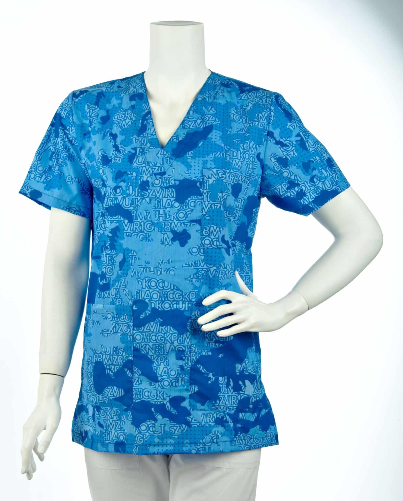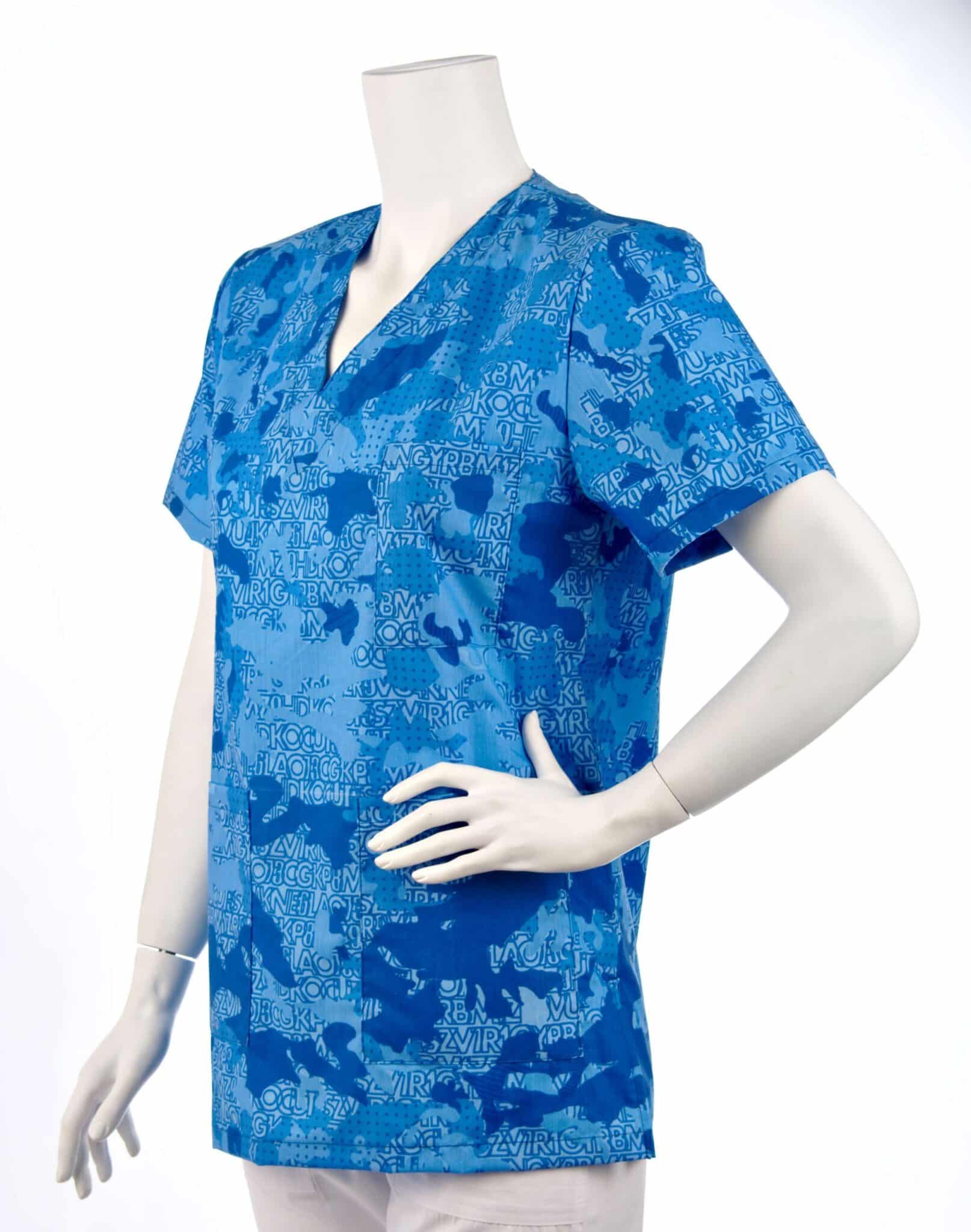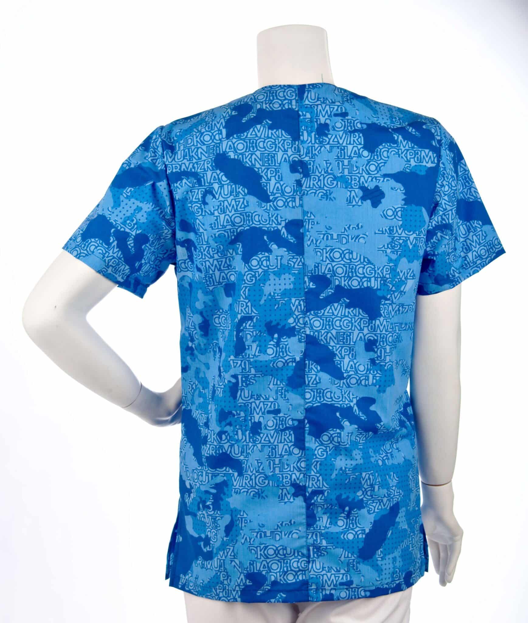 Медицинска туника с унисекс кройка в атрактивна синя щампа камуфлаж. Моделът е с прав сулует, остро деколте и три джоба отпред. Пасва идеално както на мъже, така и на жени. Подходящо облекло е за всяко медицинско лице, за персонал в детски градини и ясли, персонал във вризьорски и козметични салони. Туника унисекс синя щампа се съчетава идеално в комплект с медицинска шапка с щампа син камуфлаж.