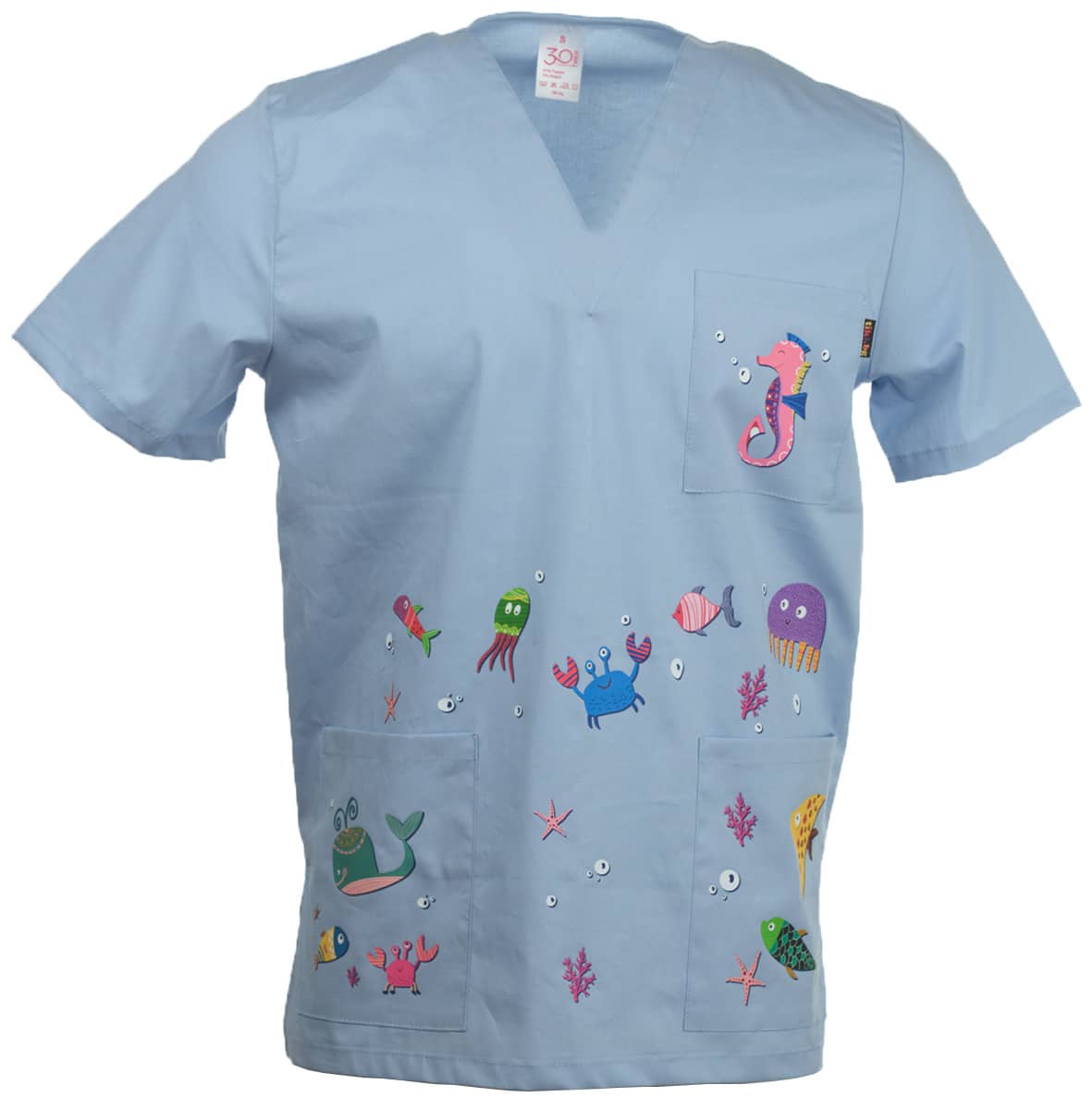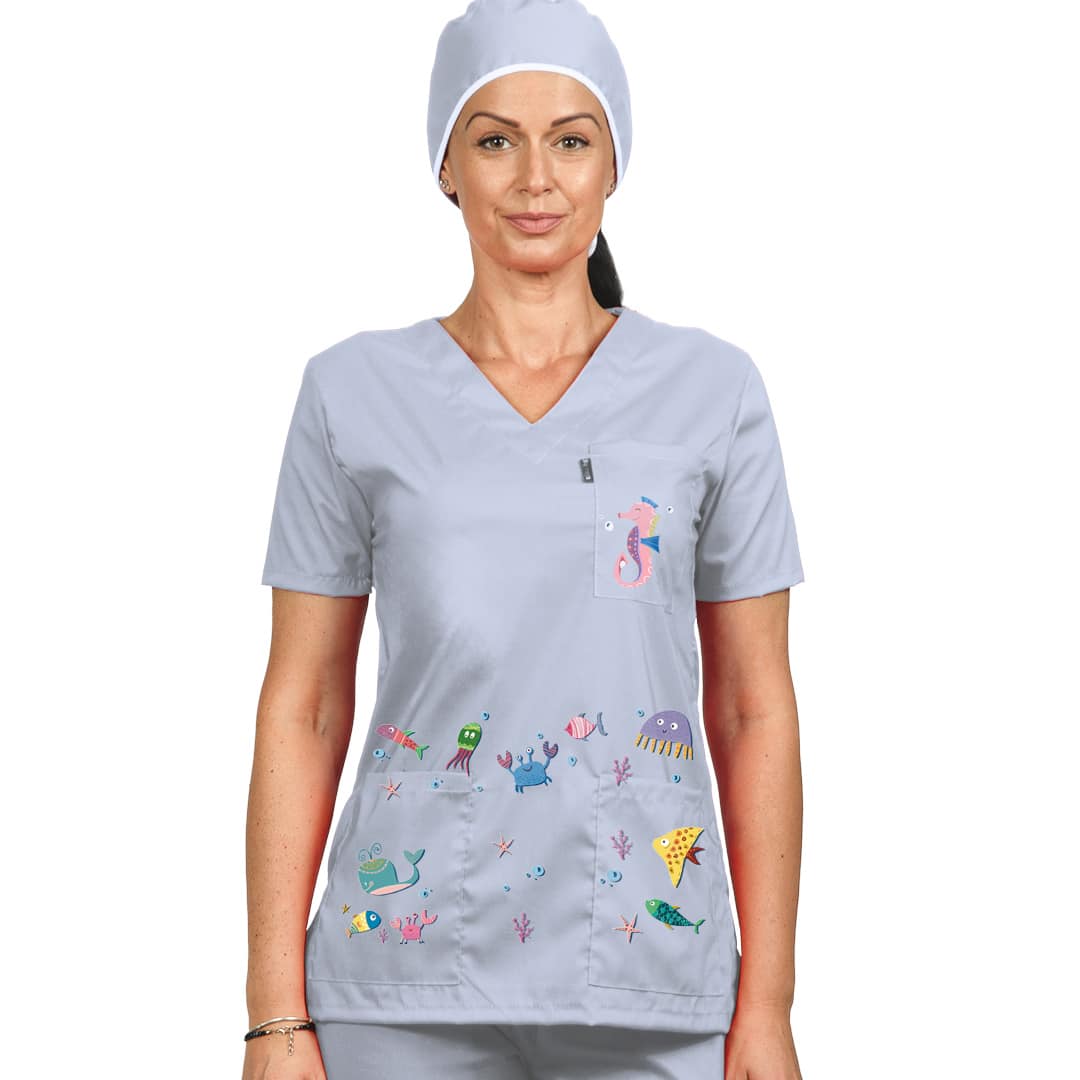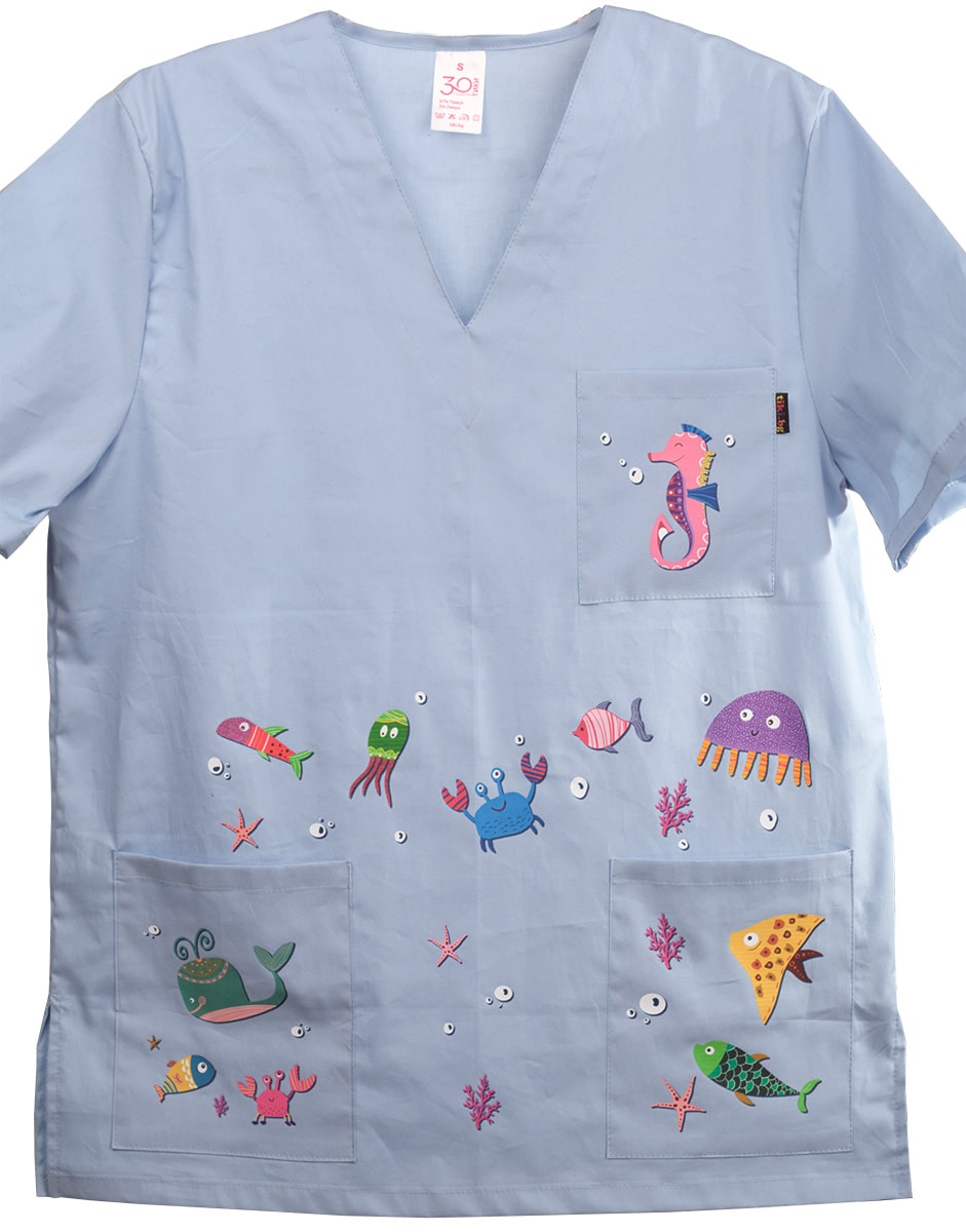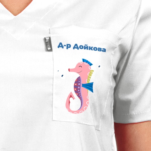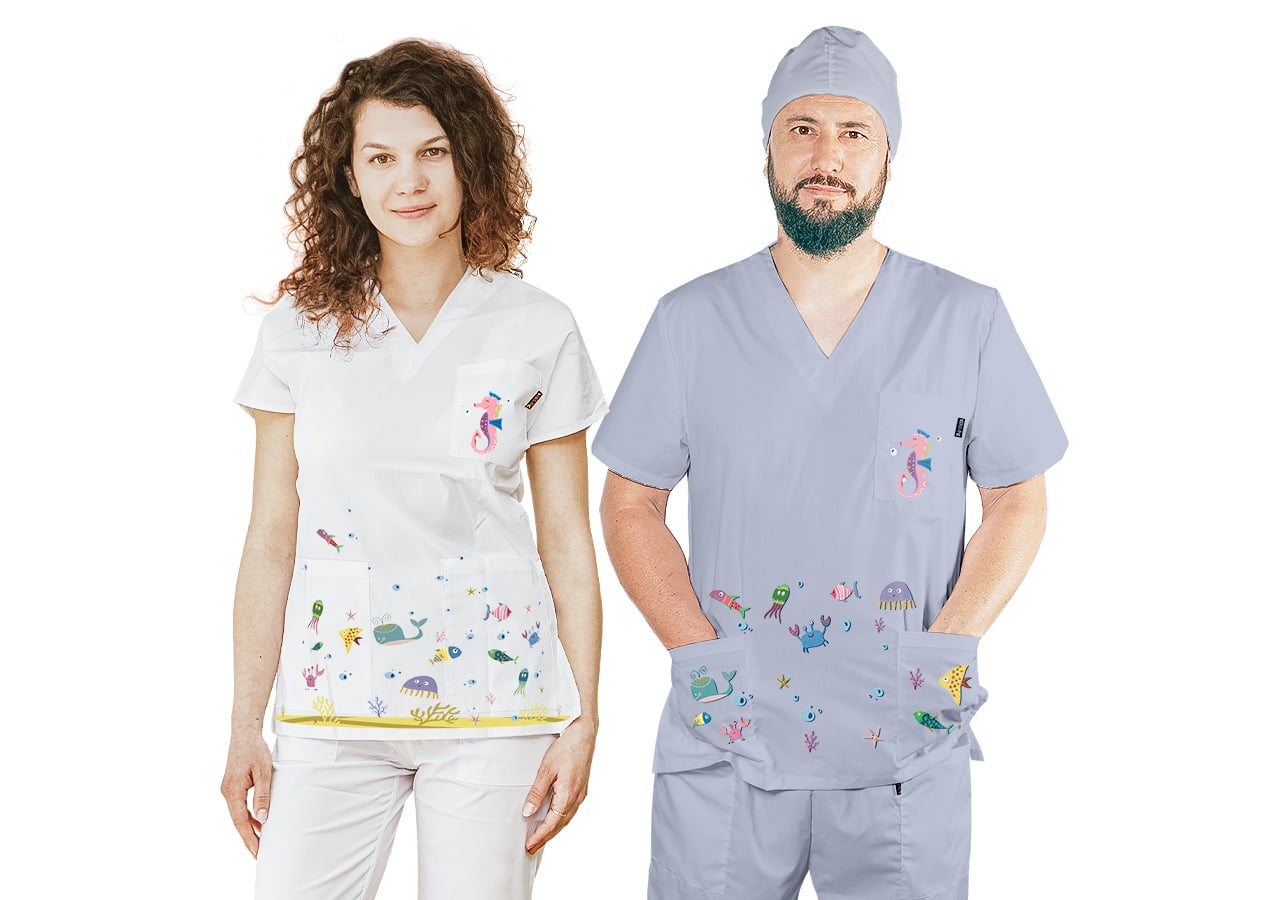 Цветовете на морските обитатели са ярки и цветни посредстом технологията DTF. Тази технология ви гарантира дълъг живот на изображението. Туниката може да поръчате и с вталена кройка в бял цвят специално за дамите. Само при нас имате възможност за брандиране на джоба с име, лого или длъжност срещу допълнително заплащане от € 2,86 / 5,60 лв.. Комбинирайте с унисекс панталон светлосин, унисекс панталон Лукс, втален панталон диня. Освен онлайн, всички наши предложения за качествено медицинско облекло, може да намерите и в фирмените ни магазини в страната.